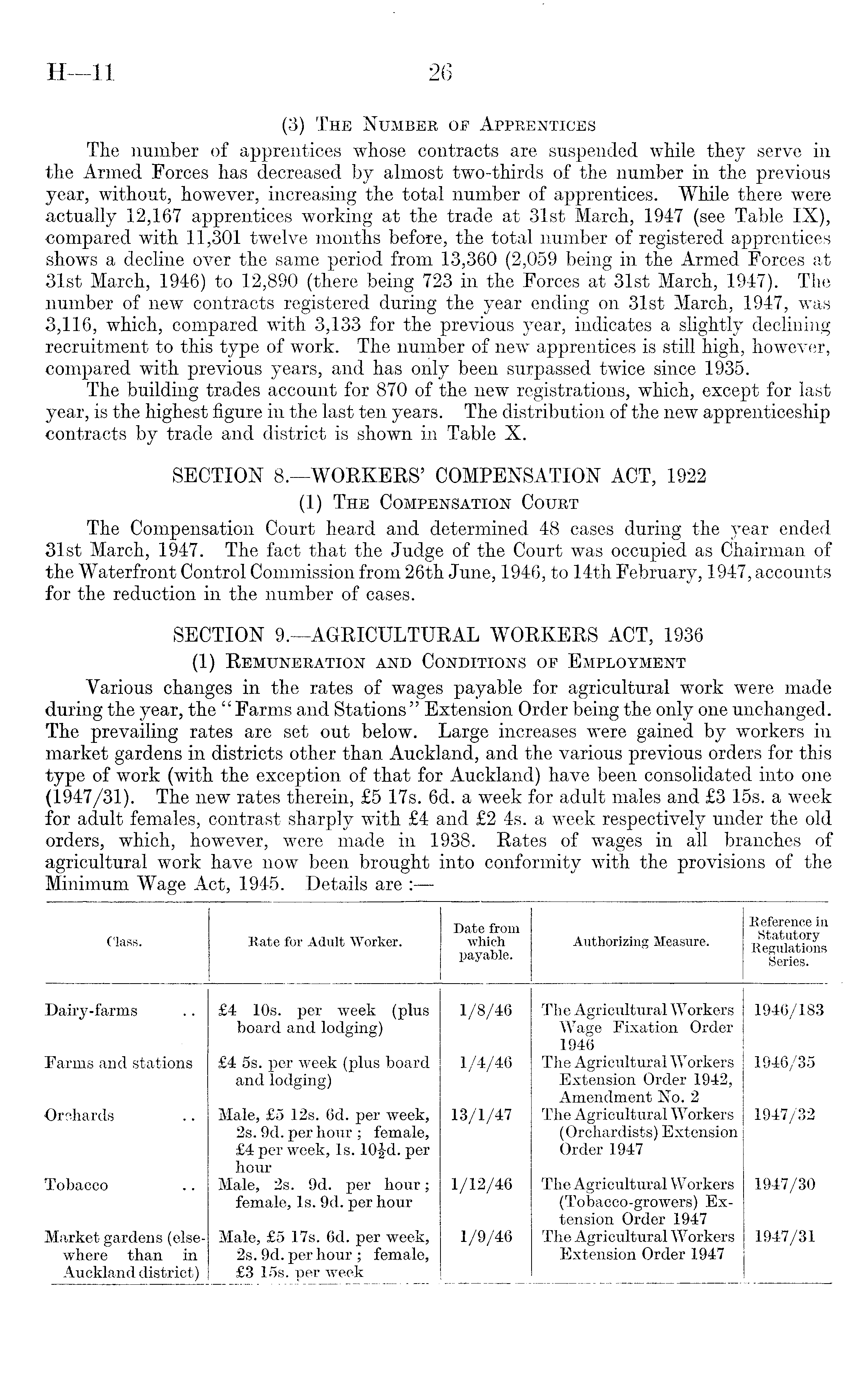 (3) The Number of Apprentices The number of apprentices whose contracts are suspended while they serve in the Armed Forces has decreased by almost two-thirds of the number in the previous year, without, however, increasing the total number of apprentices. While there were actually 12,167 apprentices working at the trade at 31st March, 1947 (see Table IX), compared with 11,301 twelve months before, the total number of registered apprentices shows a decline over the same period from 13,360 (2,059 being in the Armed Forces at 31st March, 1946) to 12,890 (there being 723 in the Forces at 31st March, 1947). The number of new contracts registered during the year ending on 31st March, 1947, was 3,116, which, compared with 3,133 for the previous year, indicates a slightly declining recruitment to this type of work. The number of new apprentices is still high, however, compared with previous years, and has only been surpassed twice since 1935. The building trades account for 870 of the new registrations, which, except for last year, is the highest figure in the last ten years. The distribution of the new apprenticeship contracts by trade and district is shown in Table X. SECTION B.—WORKERS' COMPENSATION ACT, 1922 (1) The Compensation Court The Compensation Court heard and determined 48 cases during the year ended 31st March, 1947. The fact that the Judge of the Court was occupied as Chairman of the Waterfront Control Commission from 26th June, 1946, to 14th February, 1947, accounts for the reduction in the number of cases. SECTION 9.—AGRICULTURAL WORKERS ACT, 1936 (1) Remuneration and Conditions of Employment Various changes in the rates of wages payable for agricultural work were made during the year, the "Farms and Stations" Extension Order being the only one unchanged. The prevailing rates are set out below. Large increases were gained by workers in market gardens in districts other than Auckland, and the various previous orders for this type of work (with the exception of that for Auckland) have been consolidated into one (1947/31). The new rates therein, £5 17s. 6d. a week for adult males and £3 15s. a week for adult females, contrast sharply with £4 and £2 4s. a week respectively under the old orders, which, however, were made in 1938. Rates of wages in all branches of agricultural work have now been brought into conformity with the provisions of the Minimum Wage Act, 1945. Details are :