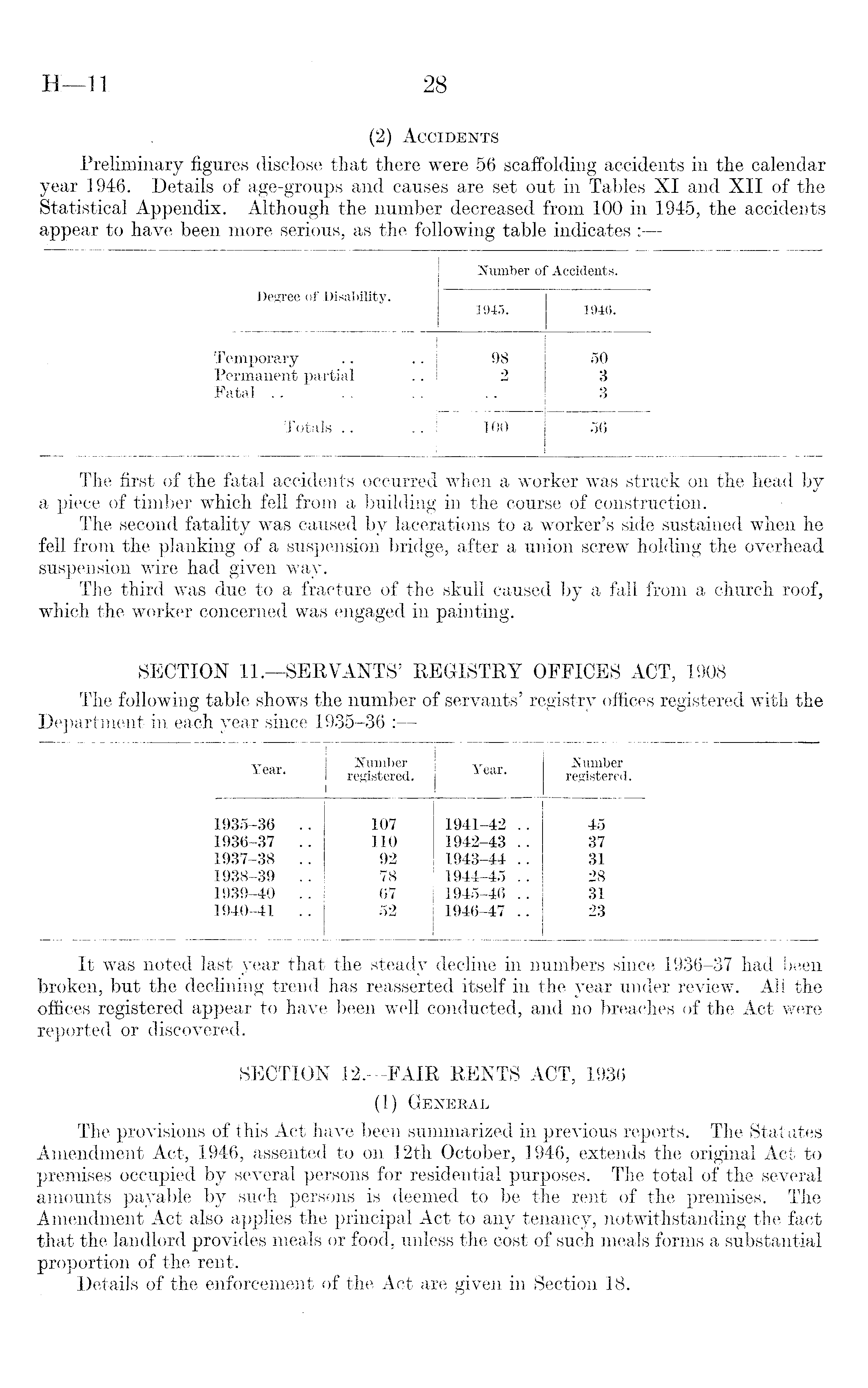 The first of the fatal accidents occurred when a worker was struck on the head by a piece of timber which fell from a building in the course of construction. The second fatality was caused by lacerations to a worker's side sustained when he fell from the planking of a suspension bridge, after a union screw holding the overhead suspension wire had given way. The third was due to a fracture of the skull caused by a fall from a church roof, which the worker concerned was engaged in painting. SECTION 11.—SERVANTS' REGISTRY OFFICES ACT, 1908 The following table shows the number of servants' registry offices registered with the Department in each year since 1935-36 :