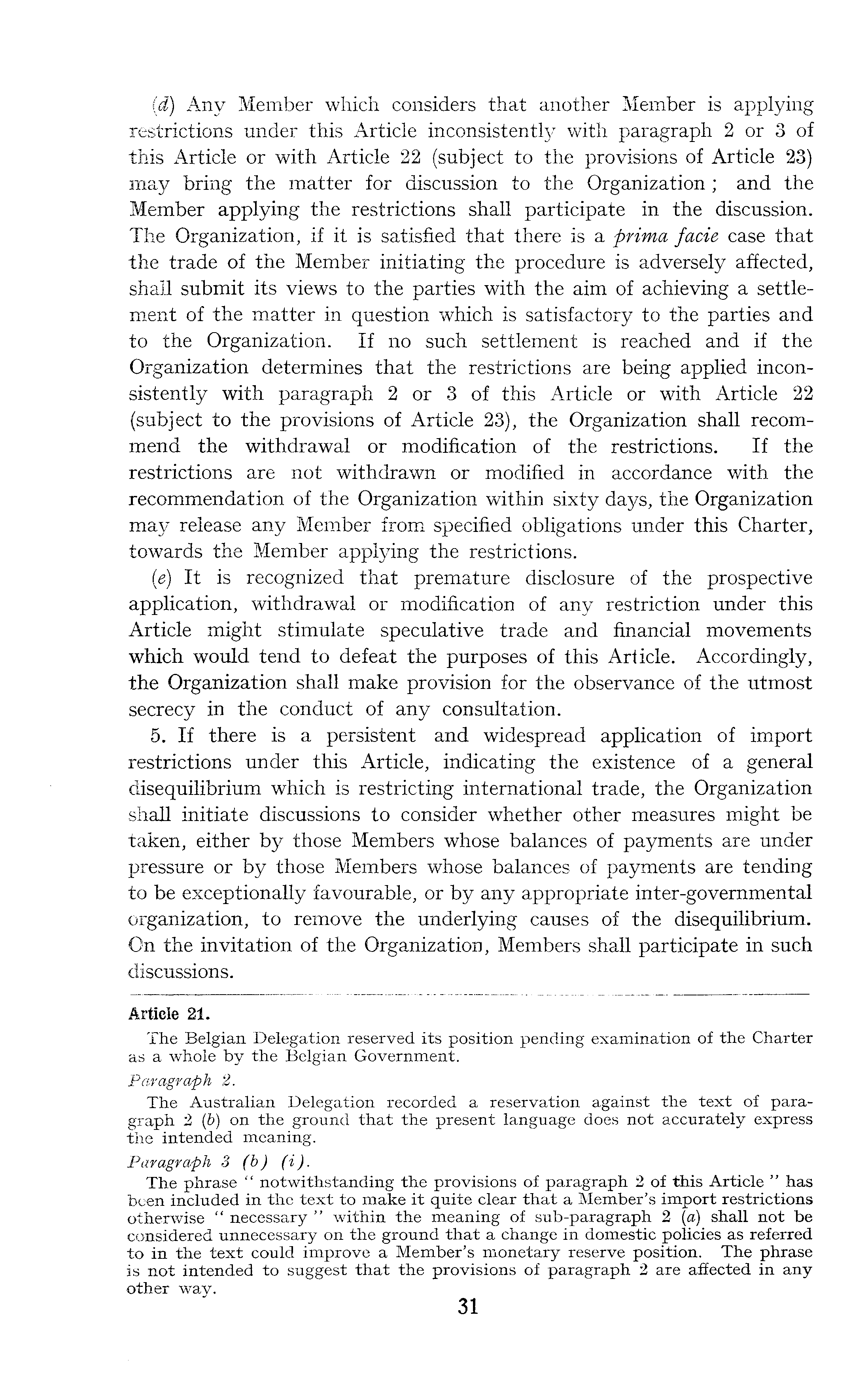 Article 21. The Belgian Delegation reserved its position pending examination of the Charter as a whole by the Belgian Government. Paragraph 2. The Australian Delegation recorded a reservation against the text of paragraph 2 (b) on the ground that the present language does not accurately express the intended meaning. Paragraph 3 (b) (i). The phrase " notwithstanding the provisions of paragraph 2 of this Article " has been included in the text to make it quite clear that a Member's import restrictions otherwise " necessary " within the meaning of sub-paragraph 2 (a) shall not be considered unnecessary on the ground that a change in domestic policies as referred to in the text could improve a Member's monetary reserve position. The phrase is not intended to suggest that the provisions of paragraph 2 are affected in any other way.