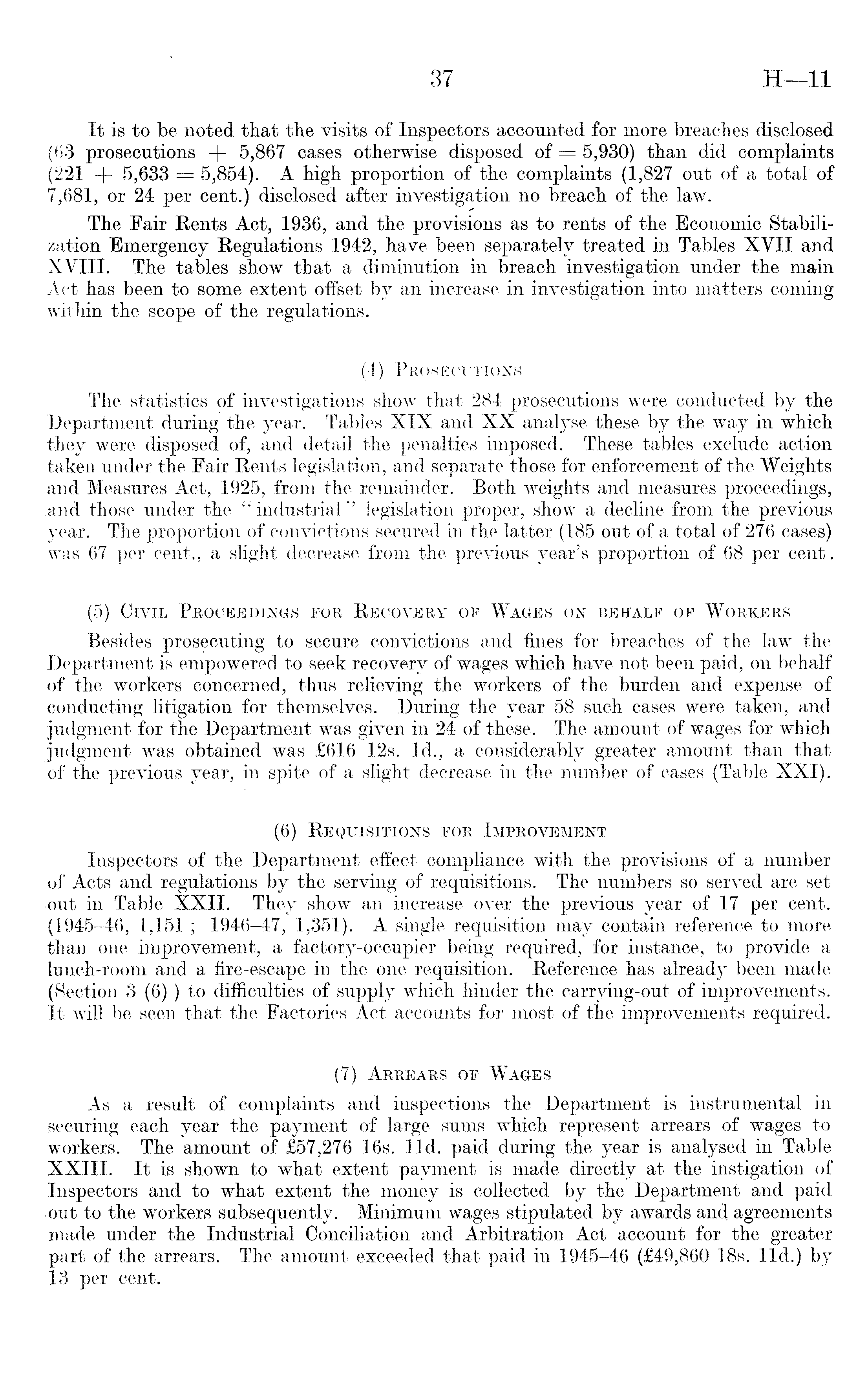 It is to be noted that the visits of Inspectors accounted for more breaches disclosed {63 prosecutions + 5,867 cases otherwise disposed of = 5,930) than did complaints {221 + 5,633 = 5,854). A high proportion of the complaints (1,827 out of a total' of 7,681, or 24 per cent.) disclosed after investigation no breach of the law. The Fair Rents Act, 1936, and the provisions as to rents of the Economic Stabilization Emergency Regulations 1942, have been separately treated in Tables XVII and XVIII. The tables show that a diminution -in breach investigation under the main Act has been to some extent offset by an increase in investigation into matters coming within the scope of the regulations. (4) Prosecutions The statistics of investigations show that 284 prosecutions were conducted by the Department during the year. Tables XIX and XX analyse these by the way in which they were disposed of, and detail the penalties imposed. These tables exclude action taken under the Fair Rents legislation, and separate those for enforcement of the Weights .and Measures Act, 1925, from the remainder. Both weights and measures proceedings, .and those under the " industrial" legislation proper, show a decline from the previous year. The proportion of convictions secured in the latter (185 out of a total of 276 cases) was 67 per cent., a slight decrease from the previous year's proportion of 68 per cent. (5) Civil Proceedings for Recovery of Wages on behalf of Workers Besides prosecuting to secure convictions and fines for breaches of the law the Department is empowered to seek recovery of wages which have not been paid, on behalf of the workers concerned, thus relieving the workers of the burden and expense of ■conducting litigation for themselves. During the year 58 such cases were taken, and judgment for the Department was given in 24 of these. The amount of wages for which judgment was obtained was £616 12s. Id., a considerably greater amount than that of the previous year, in spite of a slight decrease in the number of cases (Table XXI). (6) Requisitions for Improvement Inspectors of the Department effect compliance with the provisions of a number of Acts and regulations by the serving of requisitions. The numbers so served are set •out in Table XXII. They show an increase over the previous year of 17 per cent. (1945-46, 1,151 ; 1946-47, 1,351). A single requisition may contain reference to more than one improvement, a factory-occupier being required, for instance, to provide a lunch-room and a fire-escape in the one requisition. Reference has already been made (Section 3 (6)) to difficulties of supply which hinder the carrying-out of improvements. It will be seen that the Factories Act accounts for most of the improvements required. (7) Arrears of Wages As a result of complaints and inspections the Department is instrumental in securing each year the payment of large sums which represent arrears of wages to workers. The amount of £57,276 16s. lid. paid during the year is analysed in Table XXIII. It is shown to what extent payment is made directly at the instigation of Inspectors and to what extent the money is collected by the Department and paid out to the workers subsequently. Minimum wages stipulated by awards and agreements made under the Industrial Conciliation and Arbitration Act account for the greater part of the arrears. The amount exceeded that paid in 1945-46 (£49,860 18s. lid.) by 13 per cent.