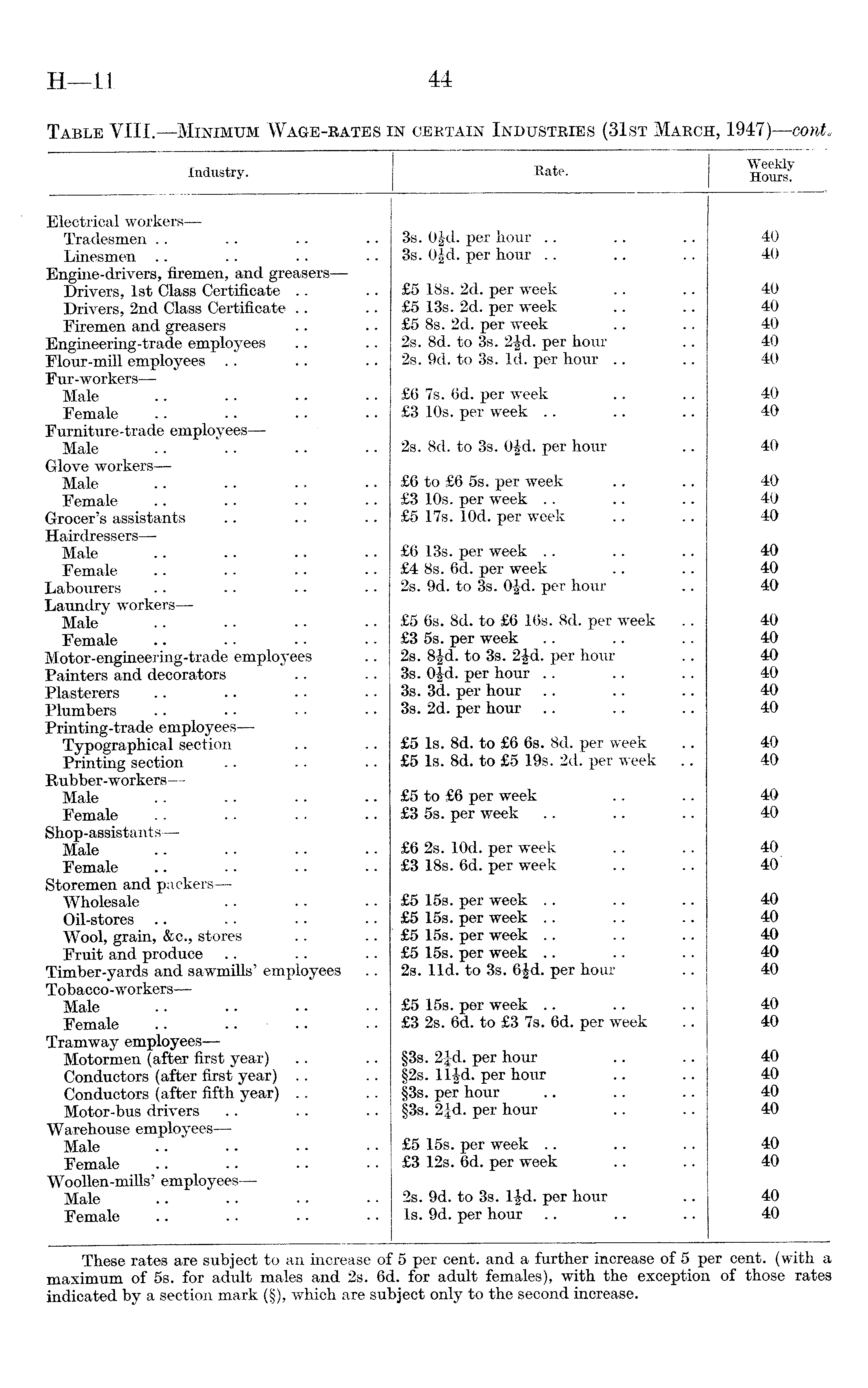 Industry. Rate. Weekly Hours. Electrical workers— Tradesmen 3s. Og-d. per hour 40 Linesmen 3s. Ofd. per hour 40 Engine-drivers, firemen, and greasers — Drivers, 1st Glass Certificate £5 18s. 2d. per week 40 Drivers, 2nd Class Certificate £5 13s. 2d. per week 40 Firemen and greasers £5 8s. 2d. per week 40 Engineering-trade employees 2s. 8d. to 3s. 2£d. per hour 40 Flour-mill employees 2s. 9d. to 3s. Id. per hour 40 Fur-workers — Male £6 7s. 6d. per week 40 Female £3 10s. per week 40 Furniture-trade employees— Male 2s. 8d. to 3s. 0|d. per hour 40 Glove workers — Male £6 to £6 5s. per week 40 Female £3 10s. per week 40 Grocer's assistants £5 17s. lOd. per week 40 Hairdressers — Male £6 13s. per week 40 Female £4 8s. 6d. per week 40 Labourers 2s. 9d. to 3s. OJd. per hour 40 Laundry workers— Male £5 6s. 8d. to £6 16s. 8d. per week 40 Female £3 5s. per week 40 Motor-engineering-trade employees 2s. 8£d. to 3s. 2§d. per hour 40 Painters and decorators 3s. 0§d. per hour 40 Plasterers .. .. . ■ 3s. 3d. per hour 40 Plumbers 3s. 2d. per hour 40 Printing-trade employees— £5 Is. 8d. to £6 6s. 8d. per week 40 Typographical section Printing section £5 Is. 8d. to £5 19s. 2d. per week 40 Rubber-workers — Male £5 to £6 per week 40 Female £3 5s. per week 40 Shop-assistants— Male £6 2s. lOd. per week 40 Female £3 18s. 6d. per week 40 Storemen and packers — Wholesale £5 15s. per week 40 Oil-stores £5 15s. per week 40 Wool, grain, &c., stores £5 15s. per week 40 Fruit and produce £5 15s. per week 40 Timber-yards and sawmills' employees 2s. lid. to 3s. 6Jd. per hour 40 Tobacco-workers — Male £5 15s. per week 40 Female .. £3 2s. 6d. to £3 7s. 6d. per week 40 Tramway employees— §3s. 2£d. per hour 40 Motormen (after first year) Conductors (after first year) §2s. lljd. per hour 40 Conductors (after fifth year) §3s. per hour 40 Motor-bus drivers §3s. 2Jd. per hour 40 Warehouse employees— Male £5 15s. per week 40 Female £3 12s. 6d. per week 40 Woollen-mills' employees — Male 2s. 9d. to 3s. ljd. per hour 40 Female Is. 9d. per hour 40
