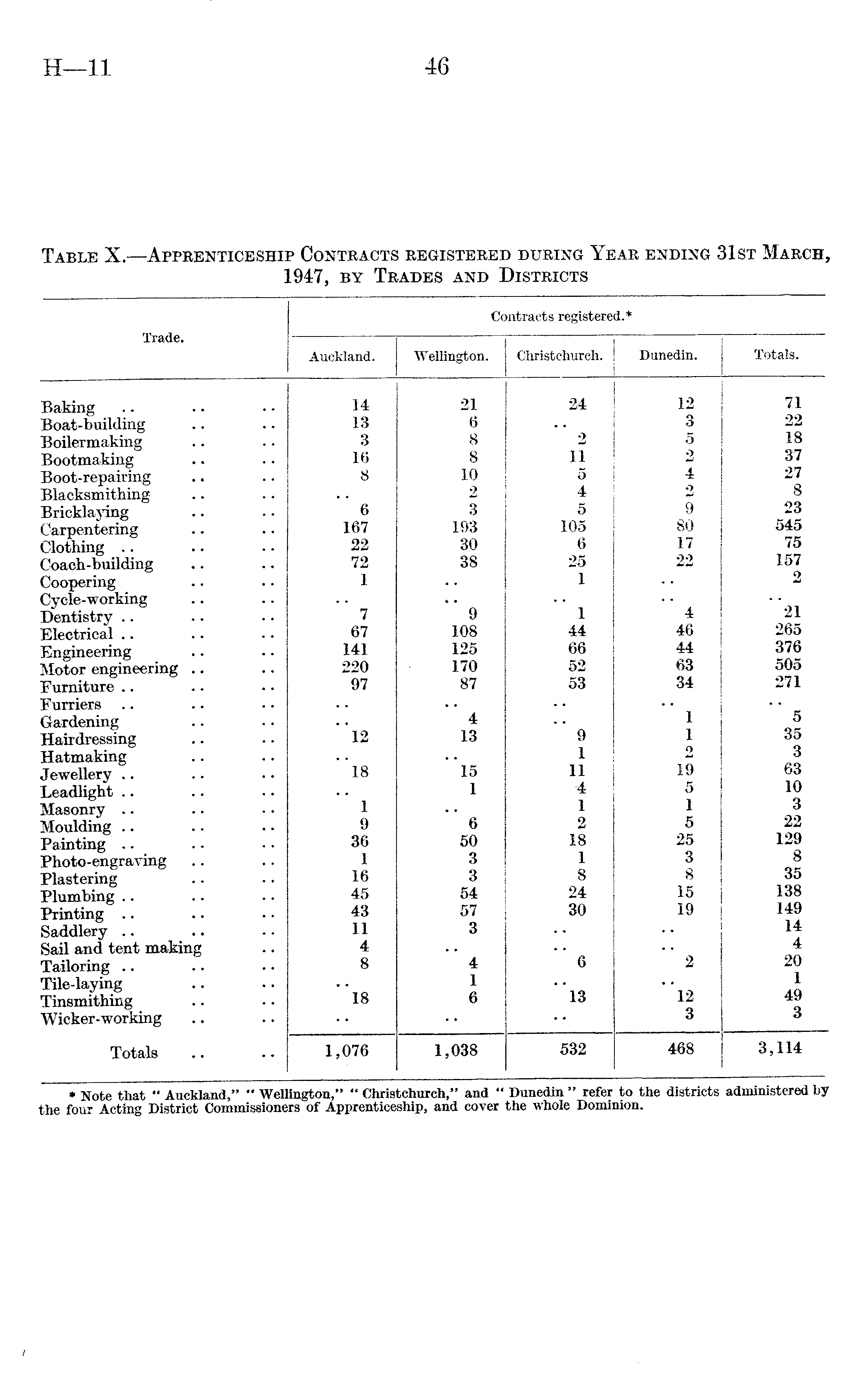 Trade. Contracts registered.* Auckland. Wellington. Christchurch. Dunedin. Totals. Baking 14 21 24 12 71 Boat-building 13 6 3 22 Boilermaking 3 8 2 5 18 Bootmaking 16 8 10 11 2 37 Boot-repairing 8 5 4 27 Blacksmithing 2 4 2 8 23 Bricklaying " 6 3 5 9 Carpentering 167 193 105 80 545 Clothing 22 30 6 17 75 Coach-building 72 38 25 22 157 Coopering 1 1 2 Cycle-working " 9 *21 Dentistry 7 1 4 Electrical 67 108 44 46 265 Engineering 141 125 66 44 376 Motor engineering 220 170 52 63 505 Furniture 97 87 53 34 271 Furriers Gardening 4 " 9 1 5 Hairdressing "l2 13 1 35 Hatmaking 1 0 3 Jewellery *18 *15 11 19 63 Leadlight 1 4 5 10 Masonry 1 1 1 3 Moulding 9 6 2 5 22 Painting 36 50 18 25 129 Photo-engraving 1 3 1 3 8 35 Plastering 16 3 8 8 Plumbing 45 54 24 15 138 Printing 43 57 30 19 149 14 Saddlery 11 3 Sail and tent making 4 " 6 4 Tailoring 8 4 2 20 Tile-laying 1 13 *12 1 Tinsmithing *18 6 49 Wicker-working 3 3 Totals 1,076 1,038 532 468 3,114 » Note that " Auckland," " Wellington," " Christchurchand " Dunedin " refer to the districts administered by the four Acting District Commissioners of Apprenticeship, and cover the whole Dominion.