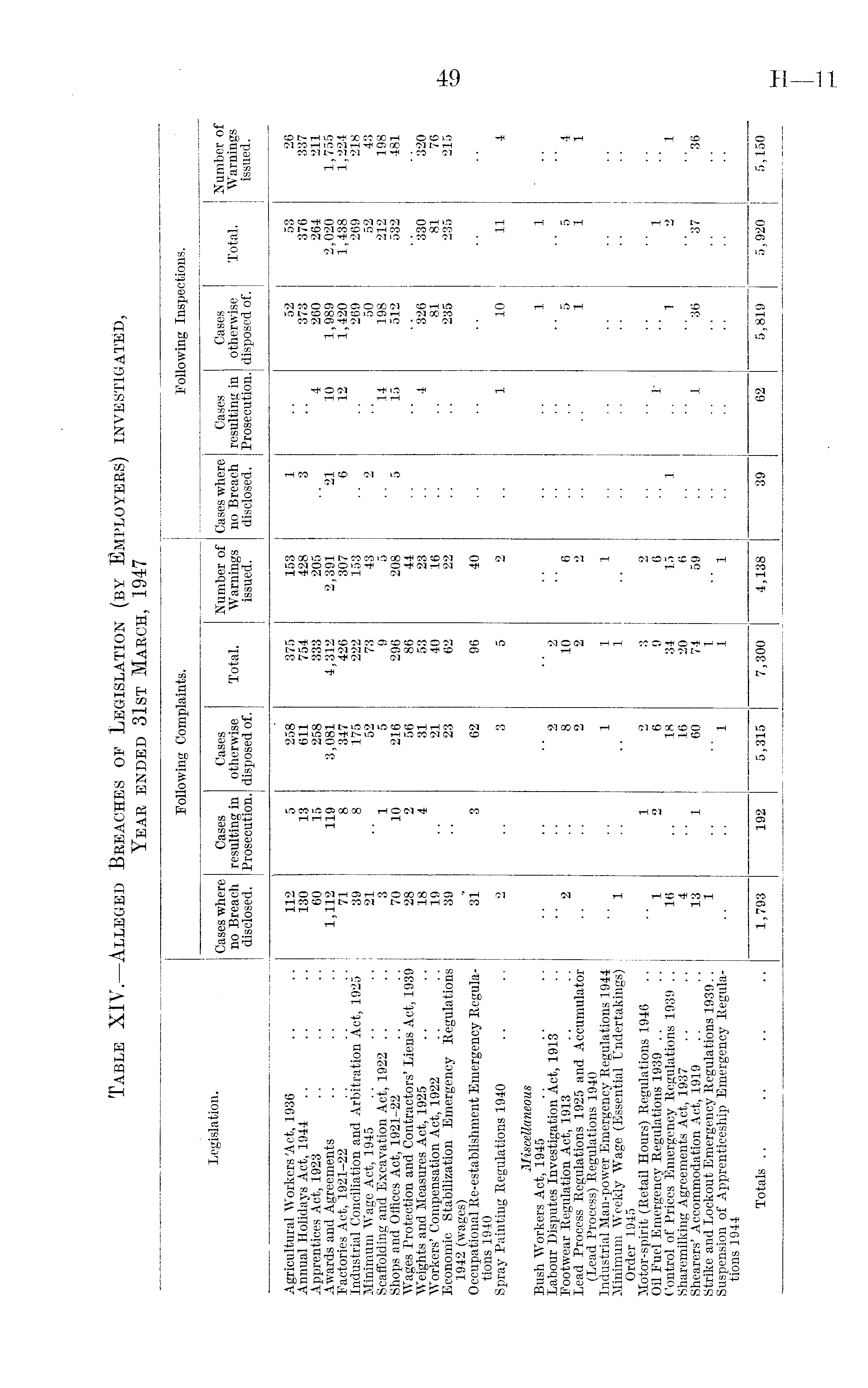 Table XIV.—Alleged Breaches of Legislation (by Employers) investigated, Year ended 31st March, 1947