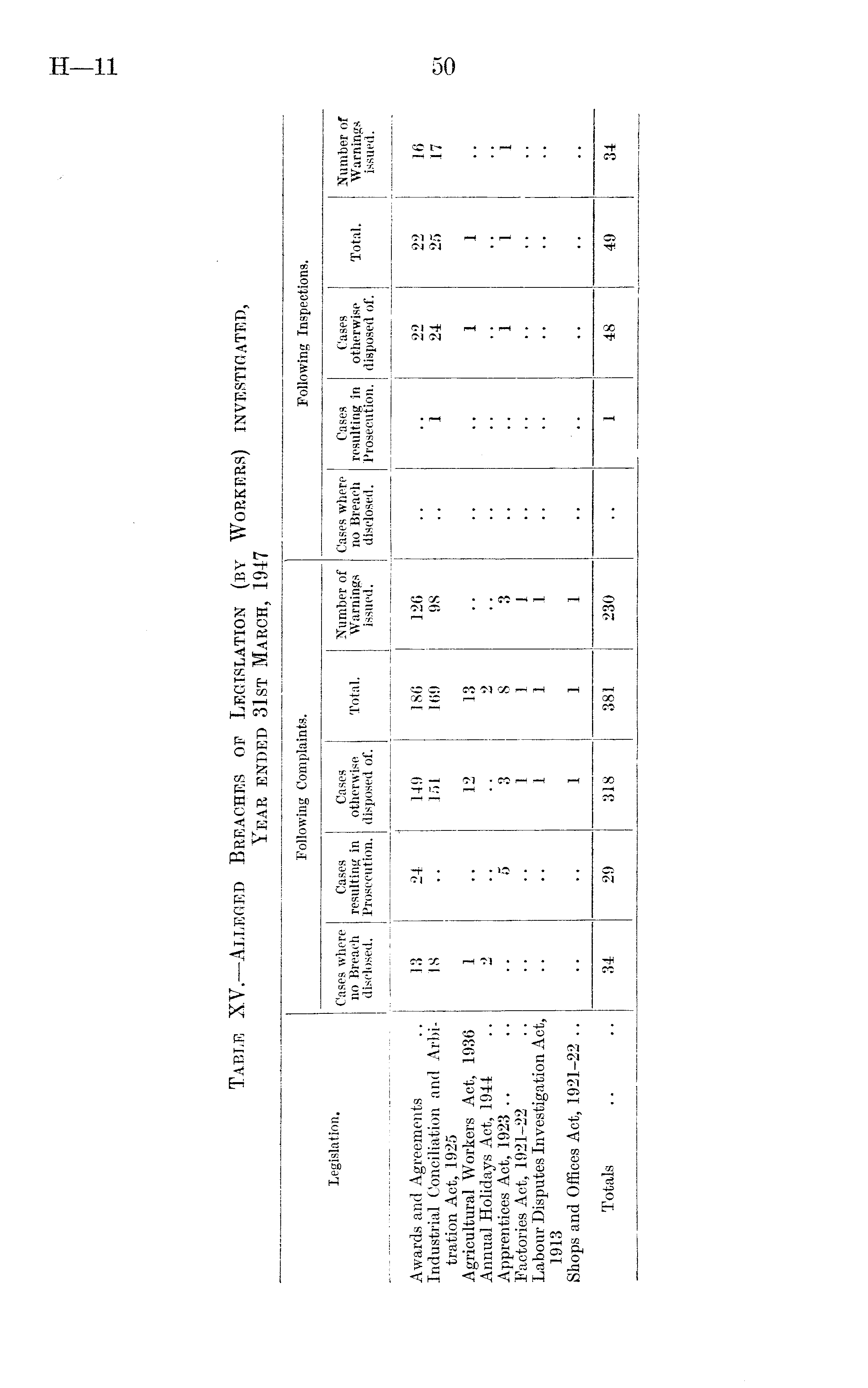 Table XV.—Alleged Breaches of Legislation (by Workers) investigated, Year ended 31st March, 1947