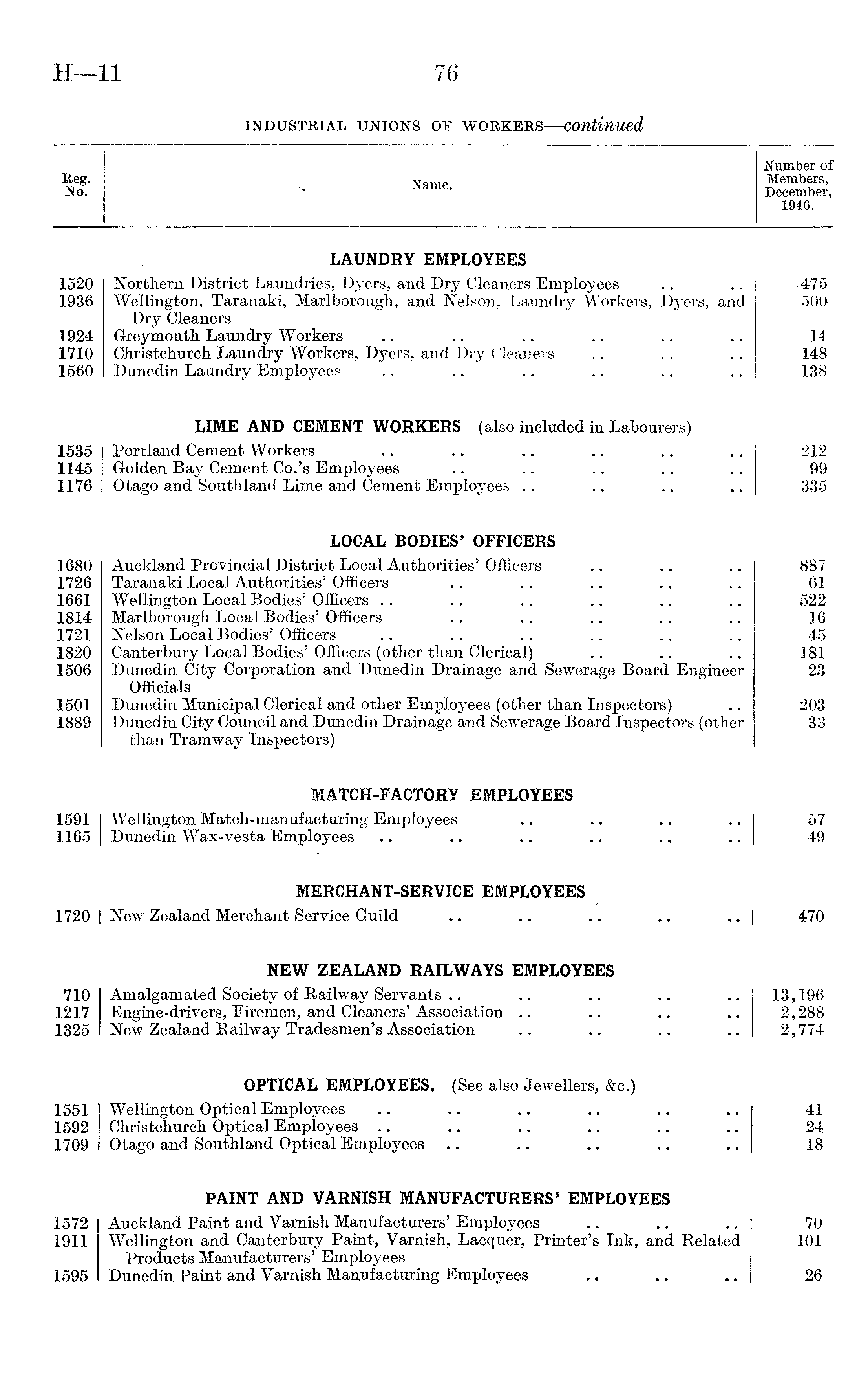 Reg. No. Name. Number of Members, December, 1946. LAUNDRY EMPLOYEES 1520 Northern District Laundries, Dyers, and Dry Cleaners Employees ,475 1936 Wellington, Taranaki, Marlborough, and Nelson, Laundry Workers, Dyers, and 500 Dry Cleaners 1924 Grey mouth Laundry Workers 14 1710 Christchurch Laundry Workers, Dyers, and Dry Cleaners 148 1560 Dunedin Laundry Employees 138 LIME AND CEMENT WORKERS (also included in Labourers) 1535 Portland Cement Workers 212 1145 Golden Bay Cement Co.'s Employees 99 1176 Otago and Southland Lime and Cement Employees .. 335 LOCAL BODIES' OFFICERS 1680 Auckland Provincial District Local Authorities' Officers 887 1726 Taranaki Local Authorities' Officers 61 1661 Wellington Local Bodies' Officers 522 1814 Marlborough Local Bodies' Officers 16 1721 Nelson Local Bodies' Officers 45 1820 Canterbury Local Bodies'Officers (other than Clerical) 181 1506 Dunedin City Corporation and Dunedin Drainage and Sewerage Board Engineer 23 Officials 1501 Dunedin Municipal Clerical and other Employees (other than Inspectors) 203 1889 Dunedin City Council and Dunedin Drainage and Sewerage Board Inspectors (other 33 than Tramway Inspectors) MATCH-FACTORY EMPLOYEES 1591 1 Wellington Match-manufacturing Employees .. .. .. .. 1 57 1165 1 Dunedin Wax-vesta Employees .. .. ,. .. .. .. | 49 MERCHANT-SERVICE EMPLOYEES 1720 | New Zealand Merchant Service Guild .. .. .. .. .. | 470 NEW ZEALAND RAILWAYS EMPLOYEES 710 Amalgamated Society of Railway Servants 13,196 1217 Engine-drivers, Firemen, and Cleaners' Association 2,288 1325 New Zealand Railway Tradesmen's Association 2,774 OPTICAL EMPLOYEES. (See also Jewellers, &c.) 1551 Wellington Optical Employees 41 1592 Christchurch Optical Employees 24 1709 Otago and Southland Optical Employees 18 PAINT AND VARNISH MANUFACTURERS' EMPLOYEES 1572 Auckland Paint and Varnish Manufacturers' Employees 70 1911 Wellington and Canterbury Paint, Varnish, Lacquer, Printer's Ink, and Related 101 Products Manufacturers' Employees 1595 Dunedin Paint and Varnish Manufacturing Employees 26