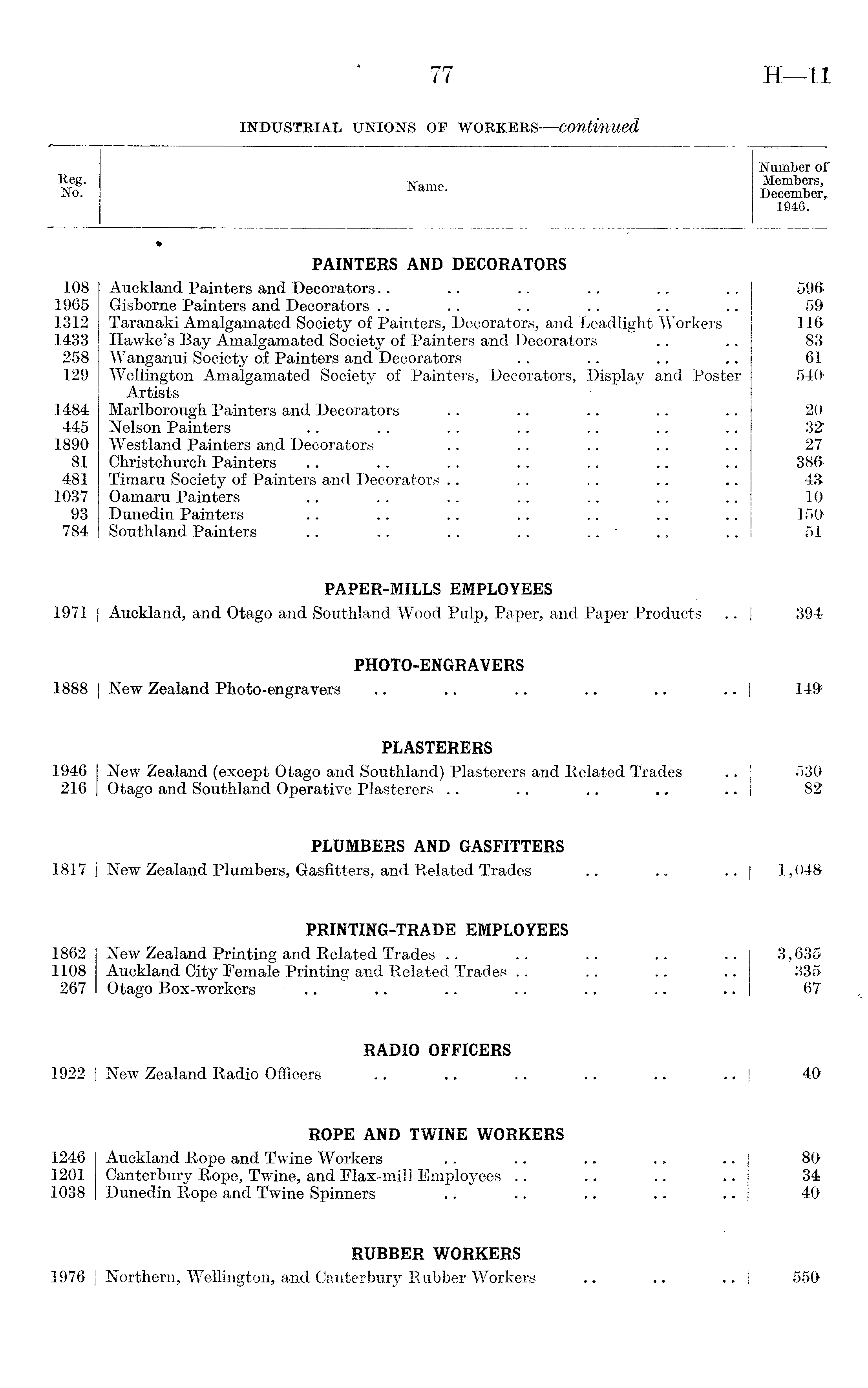 Beg. No. Name. Number of Members, December, 1946. PAINTERS AND DECORATORS 108 Auckland Painters and Decorators 596 1965 Gisborne Painters and Decorators 59 1312 Taranaki Amalgamated Society of Painters, Decorators, and Leadlight Workers 116 1433 Hawke's Bay Amalgamated Society of Painters and Decorators 83 258 Wanganui Society of Painters and Decorators 61 129 Wellington Amalgamated Society of Painters, Decorators, Display and Poster 540 Artists 1484 Marlborough Painters and Decorators 20 445 Nelson Painters 32 1890 Westland Painters and Decorators 27 81 Christchurch Painters 386 481 Timaru Society of Painters and Decorators 4a 1037 Oamaru Painters 10 93 Dunedin Painters 150 784 Southland Painters .. .. .. .. .. " 51 PAPER-MILLS EMPLOYEES 1971 Auckland, and Otago and Southland Wood Pulp, Paper, and Paper Products I 394 PHOTO-ENGRAVERS 1888 New Zealand Photo-engravers .. .. .. .. .. .. | U9 PLASTERERS 1946 1 New Zealand (except Otago and Southland) Plasterers and Related Trades 530 216 1 Otago and Southland Operative Plasterers .. .. .. .. 82 PLUMBERS AND GASFITTERS 1817 j New Zealand Plumbers, Gasfitters, and Related Trades .. .. .. | 1,048 PRINTING-TRADE EMPLOYEES 1862 New Zealand Printing and Related Trades 3,635 1108 Auckland City Female Printing and Related Trades 335 267 Otago Box-workers 67 RADIO OFFICERS 1922 | New Zealand Radio Officers .. .. .. .. .. .. | 40 ROPE AND TWINE WORKERS 1246 Auckland Rope and Twine Workers 80 1201 Canterbury Rope, Twine, and Flax-mill Employees 34 1038 Dunedin Rope and Twine Spinners 40 RUBBER WORKERS 1976 | Northern, Wellington, and Canterbury Rubber Workers .. .. .. I 550