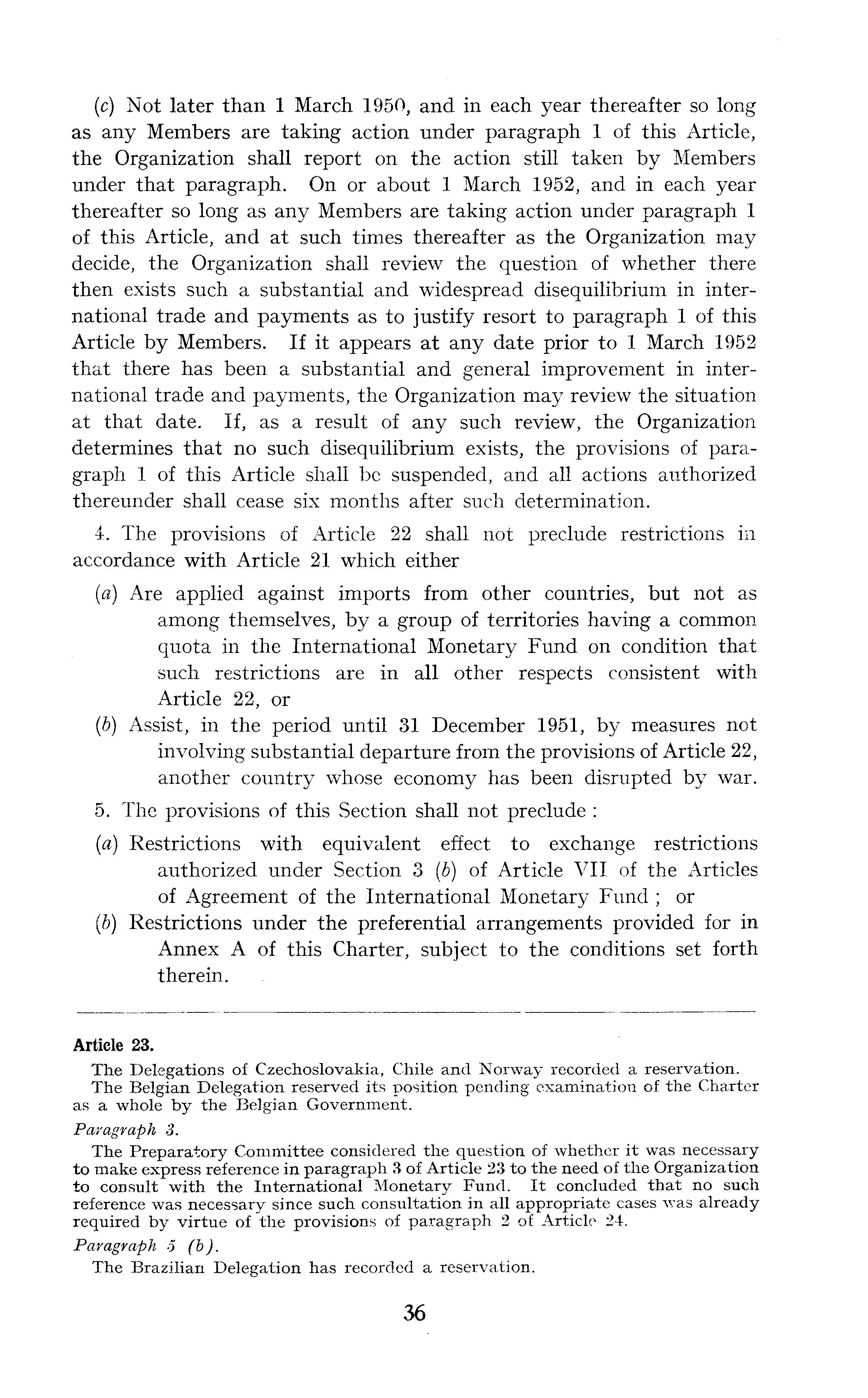 Article 23. The Delegations of Czechoslovakia, Chile and Norway recorded a reservation. The Belgian Delegation reserved its position pending examination of the Charter as a whole by the Belgian Government. Paragraph 3. The Preparatory Committee considered the question of whether it was necessary to make express reference in paragraph 3 of Article 23 to the need of the Organization to consult with the International Monetary Fund. It concluded that no such reference was necessary since such consultation in all appropriate cases was already required by virtue of the provisions of paragraph 2 of Article 24. Paragraph 5 (b). The Brazilian Delegation has recorded a reservation.