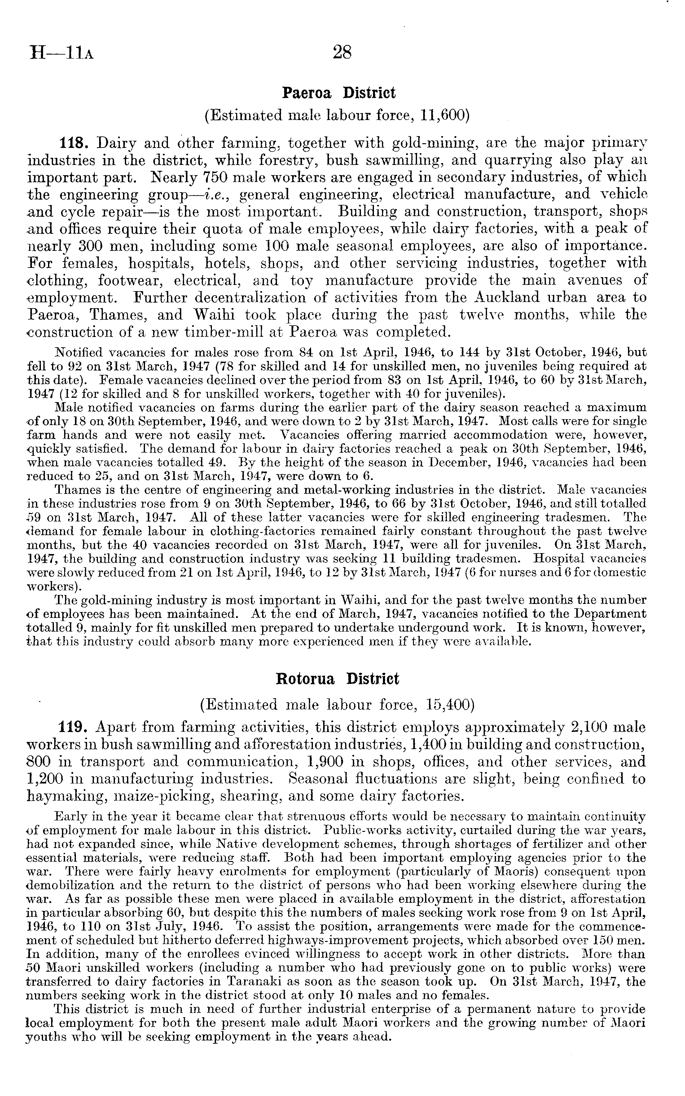 Paeroa District (Estimated male labour force, 11,600) 118. Dairy and other farming, together with gold-mining, are the major primary industries in the district, while forestry, bush sawmilling, and quarrying also play an important part. Nearly 750 male workers are engaged in secondary industries, of which the engineering group —i.e., general engineering, electrical manufacture, and vehicle and cycle repair—is the most important. Building and construction, transport, shops and offices require their quota of male employees, while dairy factories, with a peak of nearly 300 men, including some 100 male seasonal employees, are also of importance. Eor females, hospitals, hotels, shops, and other servicing industries, together with clothing, footwear, electrical, and toy manufacture provide the main avenues of employment. Further decentralization of activities from the Auckland urban area to Paeroa, Thames, and Waihi took place during the past twelve months, while the •construction of a new timber-mill at Paeroa was completed. Notified vacancies for males rose from 84 on Ist April, 1946, to 144 by 31st October, 1946, but fell to 92 on 31st March, 1947 (78 for skilled and 14 for unskilled men, no juveniles being required at this date). Female vacancies declined over the period from 83 on Ist April, 1946, to 60 by 31st March, 1947 (12 for skilled and 8 for unskilled workers, together with 40 for juveniles). Male notified vacancies on farms during the earlier part of the dairy season reached a maximum of only 18 on 30th September, 1946, and were down to 2by 31st March, 1947. Most calls were for single farm hands and were not easily met. Vacancies offering married accommodation were, however, quickly satisfied. The demand for labour in dairy factories reached a peak on 30th September, 1946, when male vacancies totalled 49. By the height of the season in December, 1946, vacancies had been reduced to 25, and on 31st March, 1947, were down to 6. Thames is the centre of engineering and metal-working industries in the district. Male vacancies in these industries rose from 9 on 30th September, 1946, to 66 by 31st October, 1946, and still totalled 59 on 31st March, 1947. All of these latter vacancies were for skilled engineering tradesmen. The demand for female labour in clothing-factories remained fairly constant throughout the past twelve months, but the 40 vacancies recorded on 31st March, 1947, were all for juveniles. On 31st March, 1947, the building and construction industry was seeking 11 building tradesmen. Hospital vacancies were slowly reduced from 21 on Ist April, 1946, to 12 by 31st March, 1947 (6 for nurses and 6 for domestic workers). The gold-mining industry is most important in Waihi, and for the past twelve months the number of employees has been maintained. At the end of March, 1947, vacancies notified to the Department totalled 9, mainly for fit unskilled men prepared to undertake undergound work. It is known, however, that this industry could absorb many more experienced men if they were available. Rotorua District (Estimated male labour force, 15,400) 119. Apart from farming activities, this district employs approximately 2,100 male workers in bush sawmilling and afforestation industries, 1,400 in building and construction, 800 in transport and communication, 1,900 in shops, offices, and other services, and 1,200 in manufacturing industries. Seasonal fluctuations are slight, being confined to haymaking, maize-picking, shearing, and some dairy factories. Early in the year it became clear that strenuous efforts would be necessary to maintain continuity of employment for male labour in this district. Public-works activity, curtailed during the war years, had not expanded since, while Native development schemes, through shortages of fertilizer and other essential materials, were reducing staff. Both had been important employing agencies prior to the war. There were fairly heavy enrolments for employment (particularly of Maoris) consequent upon demobilization and the return to the district of persons who had been working elsewhere during the war. As far as possible these men were placed in available employment in the district, afforestation in particular absorbing 60, but despite this the numbers of males seeking work rose from 9 on Ist April, 1946, to 110 on 31st July, 1946. To assist the position, arrangements were made for the commencement of scheduled but hitherto deferred highways-improvement projects, which absorbed over 150 men. In addition, many of the enrollees evinced willingness to accept work in other districts. More than 50 Maori unskilled workers (including a number who had previously gone on to public works) were transferred to dairy factories in Taranaki as soon as the season took up. On 31st March, 1947, the numbers seeking work in the district stood at only 10 males and no females. This district is much in need of further industrial enterprise of a permanent nature to provide local employment for both the present male adult Maori workers and the growing number of Maori youths who will be seeking employment in the years ahead.