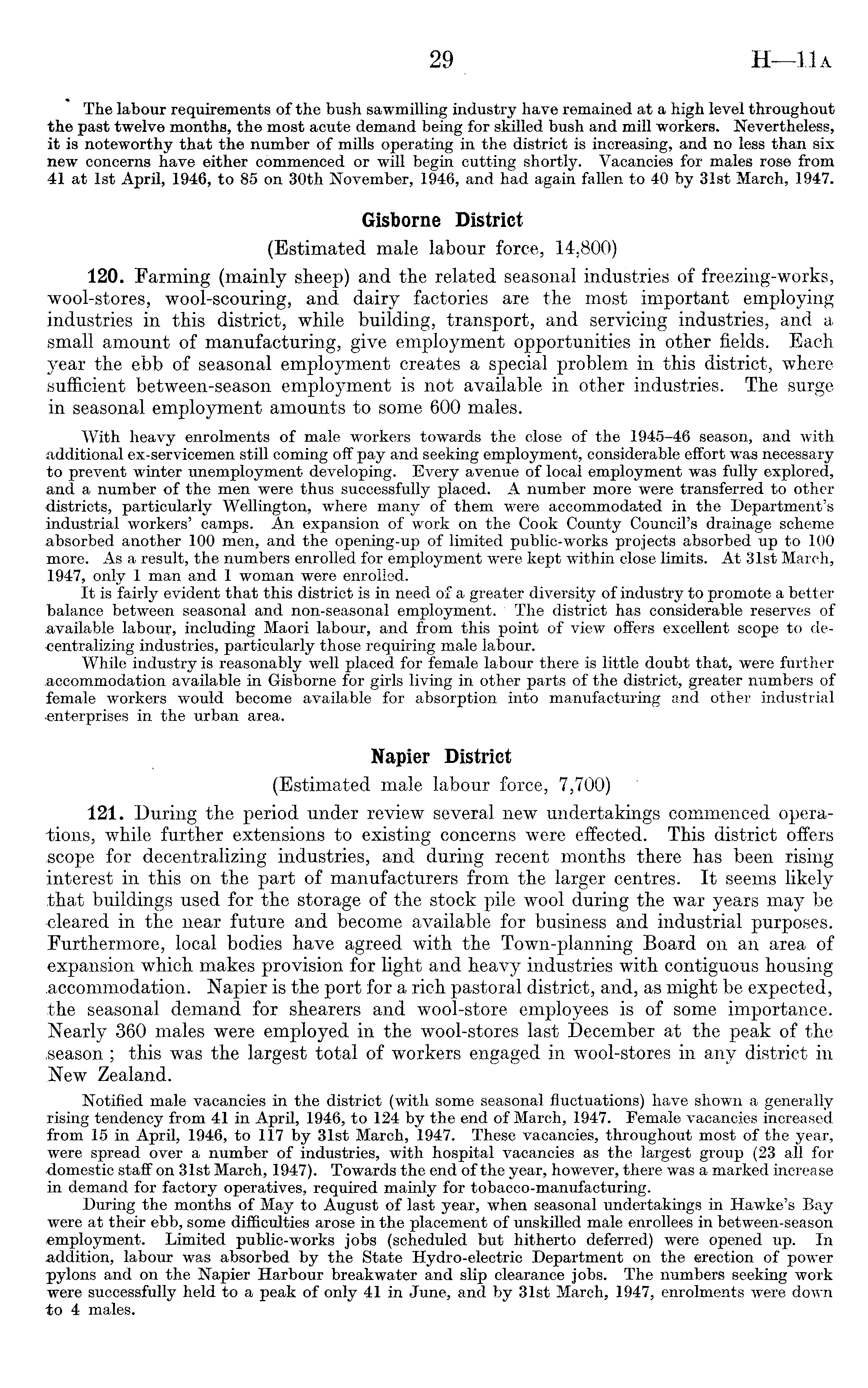 The labour requirements of the bush sawmilling industry have remained at a high level throughout the past twelve months, the most acute demand being for skilled bush and mill workers. Nevertheless, it is noteworthy that the number of mills operating in the district is increasing, and no less than six new concerns have either commenced or will begin cutting shortly. Vacancies for males rose from 41 at Ist April, 1946, to 85 on 30th November, 1946, and had again fallen to 40 by 31st March, 1947. Gisborne District (Estimated male labour force, 14,800) 120. Farming (mainly sheep) and the related seasonal industries of freezing-works, wool-stores, wool-scouring, and dairy factories are the most important employing industries in this district, while building, transport, and servicing industries, and a small amount of manufacturing, give employment opportunities in other fields. Bach year the ebb of seasonal employment creates a special problem in this district, where sufficient between-season employment is not available in other industries. The surge in seasonal employment amounts to some 600 males. With heavy enrolments of male workers towards the close of the 1945-46 season, and with additional ex-servicemen still coming off pay and seeking employment, considerable effort was necessary to prevent winter unemployment developing. Every avenue of local employment was fully explored, and a number of the men were thus successfully placed. A number more were transferred to other districts, particularly Wellington, where many of them were accommodated in the Department's industrial workers' camps. An expansion of work on the Cook County Council's drainage scheme absorbed another 100 men, and the opening-up of limited public-works projects absorbed up to 100 more. As a result, the numbers enrolled for employment were kept within close limits. At 31st March, 1947, only 1 man and 1 woman were enrolled. It is fairly evident that this district is in need of a greater diversity of industry to promote a better balance between seasonal and non-seasonal employment. The district has considerable reserves of available labour, including Maori labour, and from this point of view offers excellent scope to decentralizing industries, particularly those requiring male labour. While industry is reasonably well placed for female labour there is little doubt that, were further accommodation available in Gisborne for girls living in other parts of the district, greater numbers of female workers would become available for absorption into manufacturing and other industrial enterprises in the urban area. Napier District (Estimated male labour force, 7,700) 121. During the period under review several new undertakings commenced operations, while further extensions to existing concerns were effected. This district offers scope for decentralizing industries, and during recent months there has been rising interest in this on the part of manufacturers from the larger centres. It seems likely that buildings used for the storage of the stock pile wool during the war years may be cleared in the near future and become available for business and industrial purposes. Furthermore, local bodies have agreed with the Town-planning Board on an area of expansion which makes provision for light and heavy industries with contiguous housing .accommodation. Napier is the port for a rich pastoral district, and, as might be expected, the seasonal demand for shearers and wool-store employees is of some importance. Nearly 360 males were employed in the wool-stores last December at the peak of the season ; this was the largest total of workers engaged in wool-stores in any district in New Zealand. Notified male vacancies in the district (with some seasonal fluctuations) have shown a generally rising tendency from 41 in April, 1946, to 124 by the end of March, 1947. Female vacancies increased from 15 in April, 1946, to 117 by 31st March, 1947. These vacancies, throughout most of the year, were spread over a number of industries, with hospital vacancies as the largest group (23 all for domestic staff on 31st March, 1947). Towards the end of the year, however, there was a marked increase in demand for factory operatives, required mainly for tobacco-manufacturing. During the months of May to August of last year, when seasonal undertakings in Hawke's Bay were at their ebb, some difficulties arose in the placement of unskilled male enrollees in between-season employment. Limited public-works jobs (scheduled but hitherto deferred) were opened up. In addition, labour was absorbed by the State Hydro-electric Department on the erection of power pylons and on the Napier Harbour breakwater and slip clearance jobs. The numbers seeking work were successfully held to a peak of only 41 in June, and by 31st March, 1947, enrolments were down to 4 males.