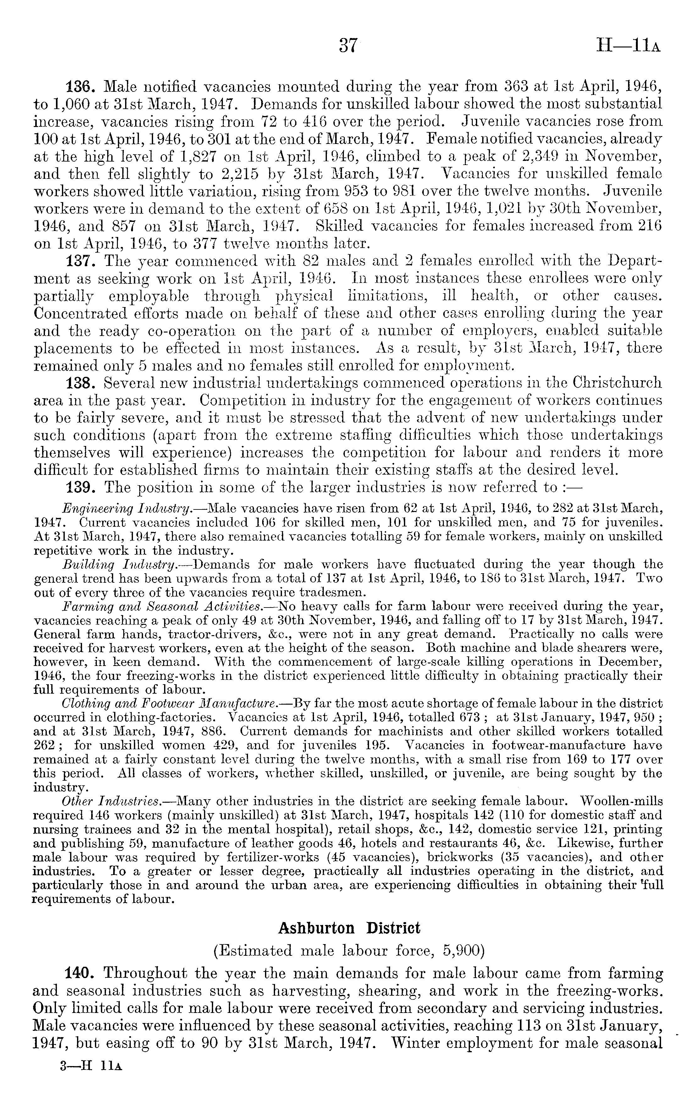 136. Male notified vacancies mounted during the year from 363 at Ist April, 1946, to 1,060 at 31st March, 1947. Demands for unskilled labour showed the most substantial increase, vacancies rising from 72 to 416 over the period. Juvenile vacancies rose from. 100 at Ist April, 1946, to 301 at the end of March, 1947. Female notified vacancies, already at the high level of 1,827 on Ist April, 1946, climbed to a peak of 2,349 in November, and then fell slightly to 2,215 by 31st March, 1947. Vacancies for unskilled female workers showed little variation, rising from 953 to 981 over the twelve months. Juvenile workers were in demand to the extent of 658 on Ist April, 1946,1,021 by 30th November, 1946, and 857 on 31st March, 1947. Skilled vacancies for females increased from 216 on Ist April, 1946, to 377 twelve months later. 137. The year commenced with 82 males and 2 females enrolled with the Department as seeking work on Ist April, 1946. In most instances these enrollees were only partially employable through physical limitations, ill health, or other causes. Concentrated efforts made on behalf of these and other cases enrolling during the year and the ready co-operation on the part of a number of employers, enabled suitable placements to be effected in most instances. As a result, by 31st March, 1947, there remained only 5 males and no females still enrolled for employment. 138. Several new industrial undertakings commenced operations in the Christchurch area in the past year. Competition in industry for the engagement of workers continues to be fairly severe, and it must be stressed that the advent of new undertakings under such conditions (apart from the extreme staffing difficulties which those undertakings themselves will experience) increases the competition for labour and renders it more difficult for established firms to maintain their existing staffs at the desired level. 139. The position in some of the larger industries is now referred to : Engineering Industry.—Male vacancies have risen from 62 at Ist April, 1946, to 282 at 31st March, 1947. Current vacancies included 106 for skilled men, 101 for unskilled men, and 75 for juveniles. At 31st March, 1947, there also remained vacancies totalling 59 for female workers, mainly on unskilled repetitive work in the industry. Building Industry.—Demands for male workers have fluctuated during the year though the general trend has been upwards from a total of 137 at Ist April, 1946, to 186 to 31st March, 1947. Two out of every three of the vacancies require tradesmen. Farming and Seasonal Activities. —No heavy calls for farm labour were received during the year, vacancies reaching a peak of only 49 at 30th November, 1946, and falling off to 17 by 31st March, 1947. General farm hands, tractor-drivers, &c., were not in any great demand. Practically no calls were received for harvest workers, even at the height of the season. Both machine and blade shearers were, however, in keen demand. With the commencement of large-scale killing operations in December, 1946, the four freezing-works in the district experienced little difficulty in obtaining practically their full requirements of labour. Clothing and Footwear Manufacture. —By far the most acute shortage of female labour in the district occurred in clothing-factories. Vacancies at Ist April, 1946, totalled 673 ; at 31st January, 1947, 950 ; and at 31st March, 1947, 886. Current demands for machinists and other skilled workers totalled 262 ; for unskilled women 429, and for juveniles 195. Vacancies in footwear-manufacture have remained at a fairly constant level during the twelve months, with a small rise from 169 to 177 over this period. All classes of workers, whether skilled, unskilled, or juvenile, are being sought by the industry. Other Industries.—Many other industries in the district are seeking female labour. Woollen-mills required 146 workers (mainly unskilled) at 31st March, 1947, hospitals 142 (110 for domestic staff and nursing trainees and 32 in the mental hospital), retail shops, &c., 142, domestic service 121, printing and publishing 59, manufacture of leather goods 46, hotels and restaurants 46, &c. Likewise, further male labour was required by fertilizer-works (45 vacancies), brickworks (35 vacancies), and other industries. To a greater or lesser degree, practically all industries operating in the district, and particularly those in and around the urban area, are experiencing difficulties in obtaining their full requirements of labour. Ashburton District (Estimated male labour force, 5,900) 140. Throughout the year the main demands for male labour came from farming and seasonal industries such as harvesting, shearing, and work in the freezing-works. Only limited calls for male labour were received from secondary and servicing industries. Male vacancies were influenced by these seasonal activities, reaching 113 on 31st January, 1947, but easing off to 90 by 31st March, 1947. Winter employment for male seasonal 3—H 11a