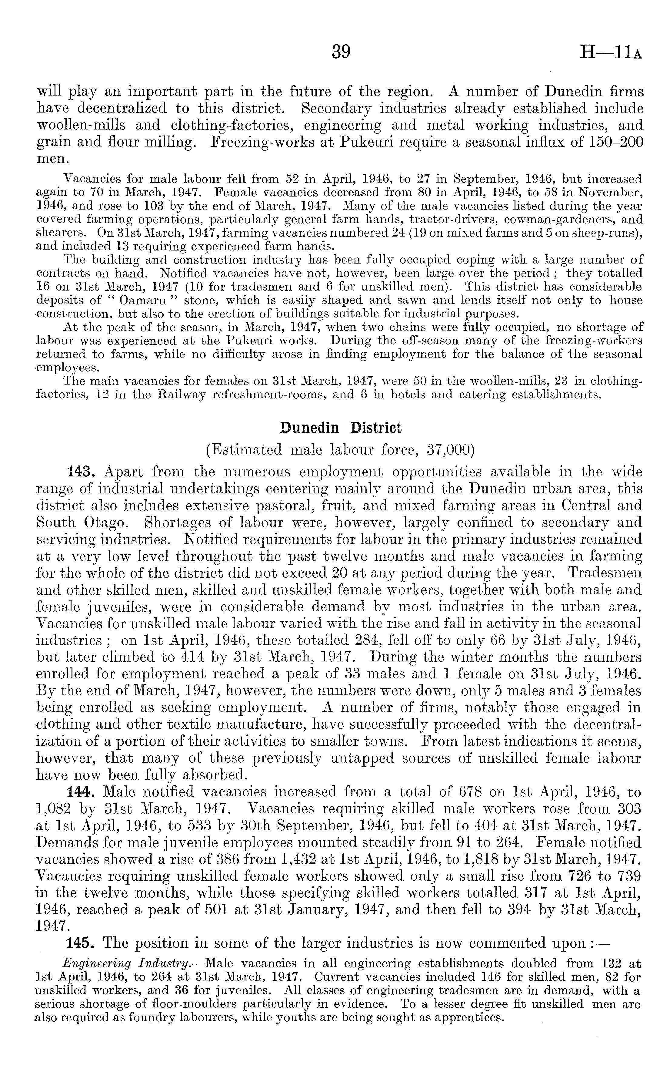 will play an important part in the future of tlie region. A number of Dunedin firms have decentralized to this district. Secondary industries already established include woollen-mills and clothing-factories, engineering and metal working industries, and grain and flour milling. Freezing-works at Pukeuri require a seasonal influx of 150-200 men. Vacancies for male labour fell from 52 in April, 1946, to 27 in September, 1946, but increased again to 70 in March, 1947. Female vacancies decreased from 80 in April, 1946, to 58 in November, 1946, and rose to 103 by tbe end of March, 1947. Many of the male vacancies listed during the year covered farming operations, particularly general farm hands, tractor-drivers, oowman-gardeners, and shearers. On 31st March, 1947, farming vacancies numbered 24 (19 on mixed farms and son sheep-runs), and included 13 requiring experienced farm hands. The building and construction industry has been fully occupied coping with a large number of ■contracts on hand. Notified vacancies have not, however, been large over the period; they totalled 16 on 31st March, 1947 (10 for tradesmen and 6 for unskilled men). This district has considerable deposits of " Oamaru " stone, which is easily shaped and sawn and lends itself not only to house •construction, but also to the erection of buildings suitable for industrial purposes. At the peak of the season, in March, 1947, when two chains were fully occupied, no shortage of labour was experienced at the Pukeuri works. During the off-season many of the freezing-workers returned to farms, while no difficulty arose in finding employment for the balance of the seasonal ■employees. The main vacancies for females on 31st March, 1947, were 50 in the woollen-mills, 23 in clothingfactories, 12 in the Railway refreshment-rooms, and 6 in hotels and catering establishments. Dunedin District (Estimated male labour force, 37,000) 143. Apart from the numerous employment opportunities available in the wide range of industrial undertakings centering mainly around the Dunedin urban area, this district also includes extensive pastoral, fruit, and mixed farming areas in Central and South Otago. Shortages of labour were, however, largely confined to secondary and servicing industries. Notified requirements for labour in the primary industries remained at a very low level throughout the past twelve months and male vacancies in farming for the whole of the district did not exceed 20 at any period during the year. Tradesmen and other skilled men, skilled and unskilled female workers, together with both male and female juveniles, were in considerable demand by most industries in the urban area. Vacancies for unskilled male labour varied with the rise and fall in activity in the seasonal industries ; on Ist April, 1946, these totalled 284, fell off to only 66 by 31st July, 1946, but later climbed to 414 by 31st March, 1947. During the winter months the numbers enrolled for employment reached a peak of 33 males and 1 female on 31st July, 1946. By the end of March, 1947, however, the numbers were down, only 5 males and 3 females being enrolled as seeking employment. A number of firms, notably those engaged in •clothing and other textile manufacture, have successfully proceeded with the decentralization of a portion of their activities to smaller towns. From latest indications it seems, however, that many of these previously untapped sources of unskilled female labour have now been fully absorbed. 144. Male notified vacancies increased from a total of 678 on Ist April, 1946, to 1,082 by 31st March, 1947. Vacancies requiring skilled male workers rose from 303 at Ist April, 1946, to 533 by 30th September, 1946, but fell to 404 at 31st March, 1947. Demands for male juvenile employees mounted steadily from 91 to 264. Female notified vacancies showed a rise of 386 from 1,432 at Ist April, 1946, to 1,818 by 31st March, 1947. Vacancies requiring unskilled female workers showed only a small rise from 726 to 739 in the twelve months, while those specifying skilled workers totalled 317 at Ist April, 1946, reached a peak of 501 at 31st January, 1947, and then fell to 394 by 31st March, 1947. 145. The position in some of the larger industries is now commented upon Engineering Industry.—Male vacancies in all engineering establishments doubled from 132 at Ist April, 1946, to 264 at 31st March, 1947. Current vacancies included 146 for skilled men, 82 for unskilled workers, and 36 for juveniles. All classes of engineering tradesmen are in demand, with a serious shortage of floor-moulders particularly in evidence. To a lesser degree fit unskilled men are also required as foundry labourers, while youths are being sought as apprentices.