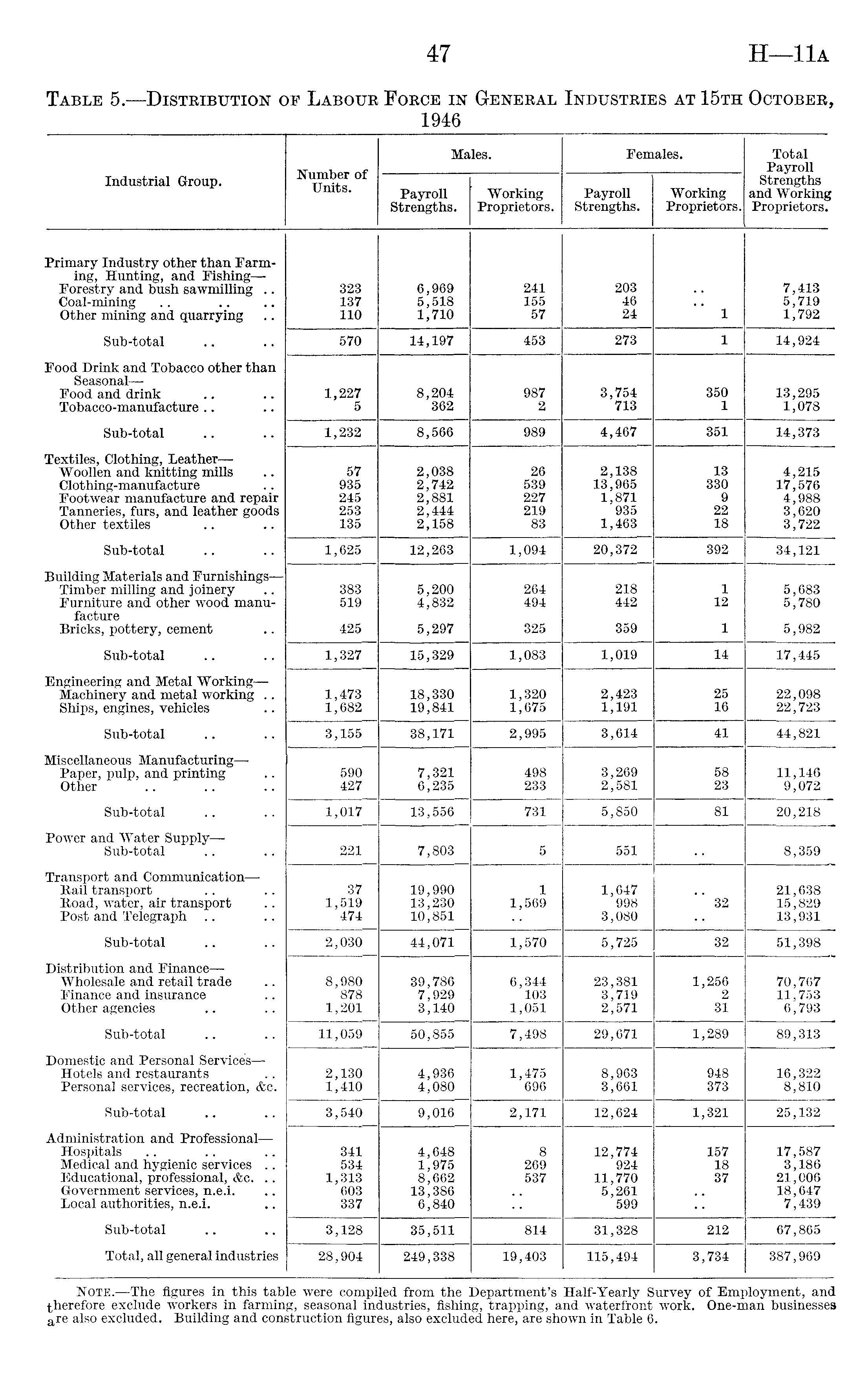 Number of Units. Males. Females. Total Payroll Industrial Group. Payroll Strengths. Working Proprietors. Payroll Strengths. Working Proprietors. Strengths and Working Proprietors. Primary Industry other than Farming, Hunting, and Fishing— Forestry and bush sawinilling .. Coal-mining Other mining and quarrying 323 137 110 6,969 5,518 1,710 241 155 57 203 46 24 1 7,413 5,719 1,792 Sub-total 570 14,197 453 273 1 14,924 Food Drink and Tobacco other than Seasonal — Food and drink Tobacco-manufacture 1,227 5 8,204 362 987 2 3,754 713 350 1 13,295 1,078 Sub-total 1,232 8,566 989 4,467 351 14,373 Textiles, Clothing, Leather — Woollen and knitting mills Clothing-manufacture Footwear manufacture and repair Tanneries, furs, and leather goods Other textiles 57 935 245 253 135 2,038 2,742 2,881 2,444 2,158 26 539 227 219 83 2,138 13,965 1,871 935 1,463 13 330 9 22 18 4,215 17,576 4,988 3,620 3,722 Sub-total 1,625 12,263 1,094 20,372 392 34,121 Building Materials and Furnishings— Timber milling and joinery Furniture and other wood manufacture Bricks, pottery, cement 383 519 425 5,200 4,832 5,297 264 494 325 218 442 359 1 12 1 5,683 5,780 5,982 Sub-total 1,327 15,329 1,083 1,019 14 17,445 Engineering and Metal Working— Machinery and metal working .. Ships, engines, vehicles 1,473 1,682 18,330 19,841 1,320 1,675 2,423 1,191 25 16 22,098 22,723 Sub-total 3,155 38,171 2,995 3,614 41 44,821 Miscellaneous Manufacturing—■ Paper, pulp, and printing Other 590 427 7,321 6,235 498 233 3,269 2,581 58 23 11,146 9,072 Sub-total 1,017 13,556 731 5,850 81 * 20,218 Power and Water Supply— Sub-total 221 7,803 5 551 8,359 Transport and Communication— Bail transport Boad, water, air transport Post and Telegraph 37 1,519 474 19,990 13,230 10,851 1 1,569 1,647 998 3,080 32 21,638 15,829 13,931 Sub-total 2,030 44,071 1,570 5,725 32 51,398 Distribution and Finance — Wholesale and retail trade Finance and insurance Other agencies 8,980 878 1,201 39,786 7,929 3,140 6,344 103 1,051 23,381 3,719 2,571 1,256 2 31 70,767 11,753 6,793 Sub-total 11,059 50,855 7,498 29,671 1,289 89,313 Domestic and Personal Services — Hotels and restaurants Persona] services, recreation, &c. 2,130 1,410 4,936 4,080 1,475 696 8,963 3,661 948 373 16,322 8,810 Sub-total 3,540 9,016 2,171 12,624 1,321 25,132 Administration and Professional—Hospitals Medical and hygienic services .. Educational, professional, &c. .. Government services, n.e.i. Local authorities, n.e.i. 341 534 1,313 603 337 4,648 1,975 8,662 13,386 6,840 8 269 537 12,774 924 11,770 5,261 599 157 18 37 17,587 3,186 21,006 18,647 7,439 Sub-total 3,128 35,511 814 31,328 212 67,865 Total, all general industries 28,904 249,338 19,403 115,494 3,734 387,969 Note.—The figures in this table were compiled from the Department's Half-Yearly Survey of Employment, and therefore exclude workers in farming, seasonal industries, fishing, trapping, and waterfront work. One-man businesses a re also excluded. Building and construction figures, also excluded here, are shown in Table 6.