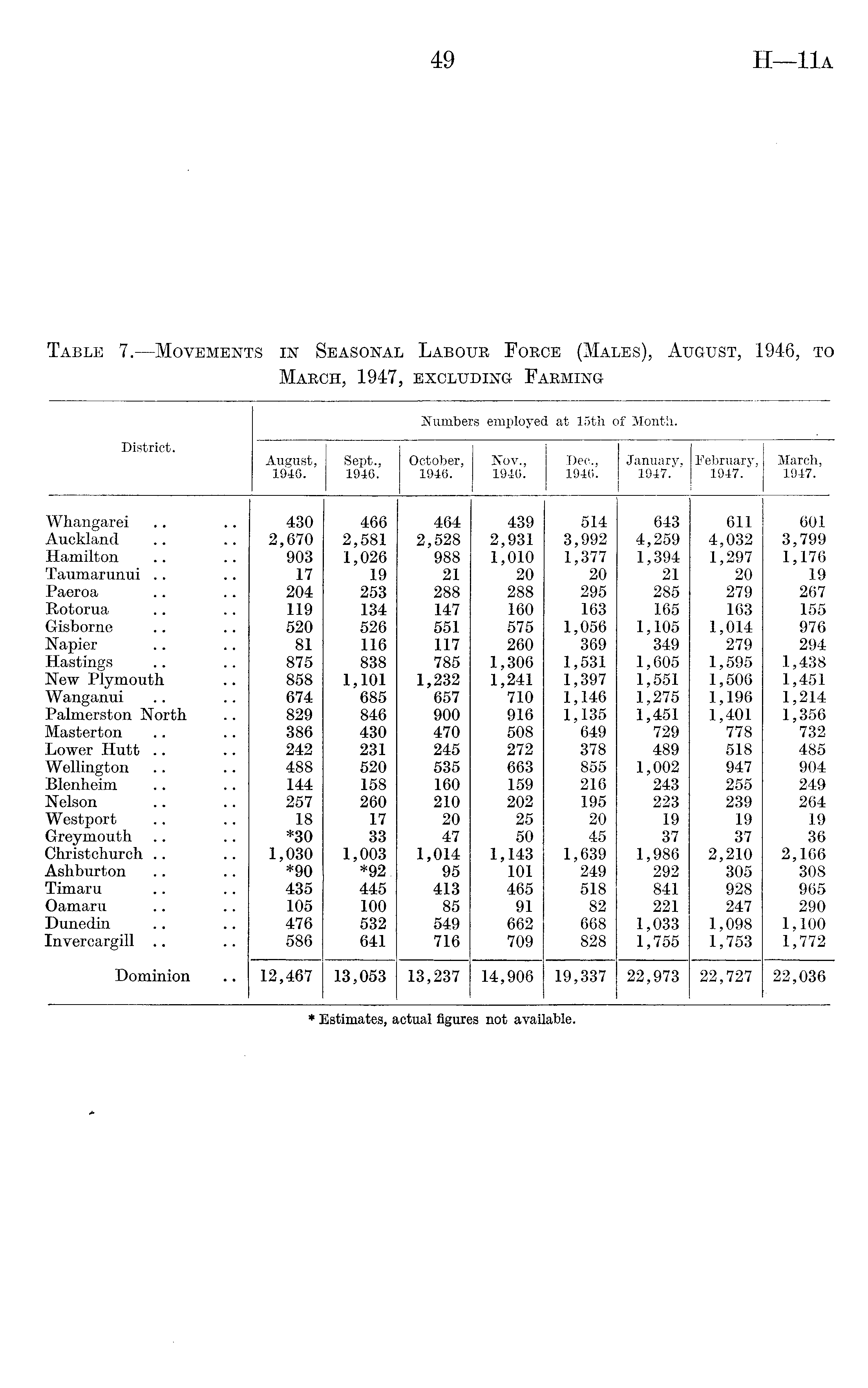 Table 7. —Movements in Seasonal Labour Force (Males), August, 1946, to March, 1947, excluding Farming