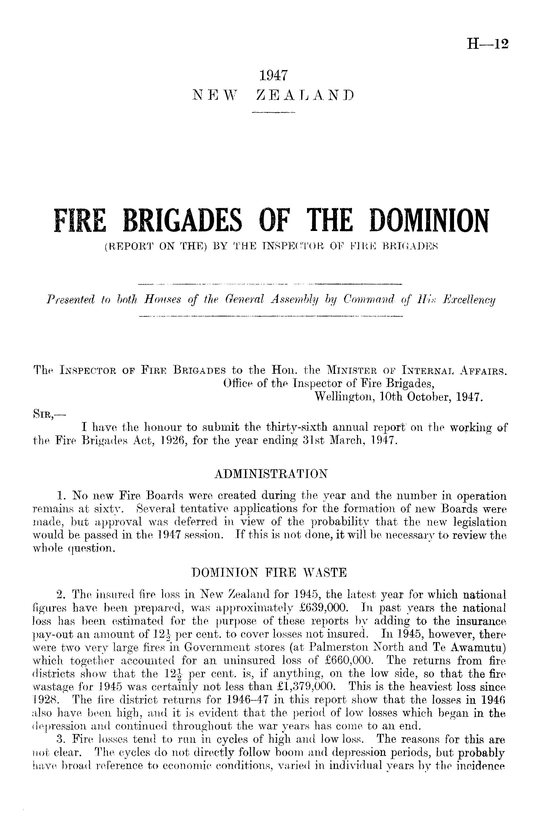 The Inspector of Fire Brigades to the Hon. the Minister op Internal Affairs. Office, of the. Inspector of Fire Brigades, Wellington, 10th October, 1947. Sir, — I have the honour to submit the thirty-sixth annual report on the working of the Fire Brigades Act, 1926, for the year ending 31st March, 1947. ADMINISTRATION 1. No new Fire Boards were created during the year and the number in operation remains at sixty. Several tentative applications for the formation of new Boards were made, but approval was deferred in view of the probability that the new legislation would be passed in the 1947 session. If this is not done, it will be necessary to review the whole question. DOMINION FIRE WASTE 2. The insured fire loss in New Zealand for 1945, the latest year for which national figures have been prepared, was approximately £639,000. In past years the national loss has been estimated for the purpose of these reports by adding to the insurance pay-out an amount of 12-| per cent, to cover losses not insured. In 1945, however, there were two very large fires in Government stores (at Palmerston North and Te Awamutu) which together accounted for an uninsured loss of £660,000. The returns from fire districts show that the 12-| per cent, is, if anything, on the low side, so that the fire wastage for 1945 was certainly not less than £1,379,000. This is the heaviest loss since 1928. The fire district returns for 1946-47 in this report show that the losses in 1946 also have been high, and it is evident that the period of low losses which began in the depression and continued throughout the war years has come to an end. 3. Fire losses tend to run in cycles of high and low loss. The reasons for this are not clear. The cycles do not directly follow boom and depression periods, but probably have broad reference to economic conditions, varied in individual years by the incidence