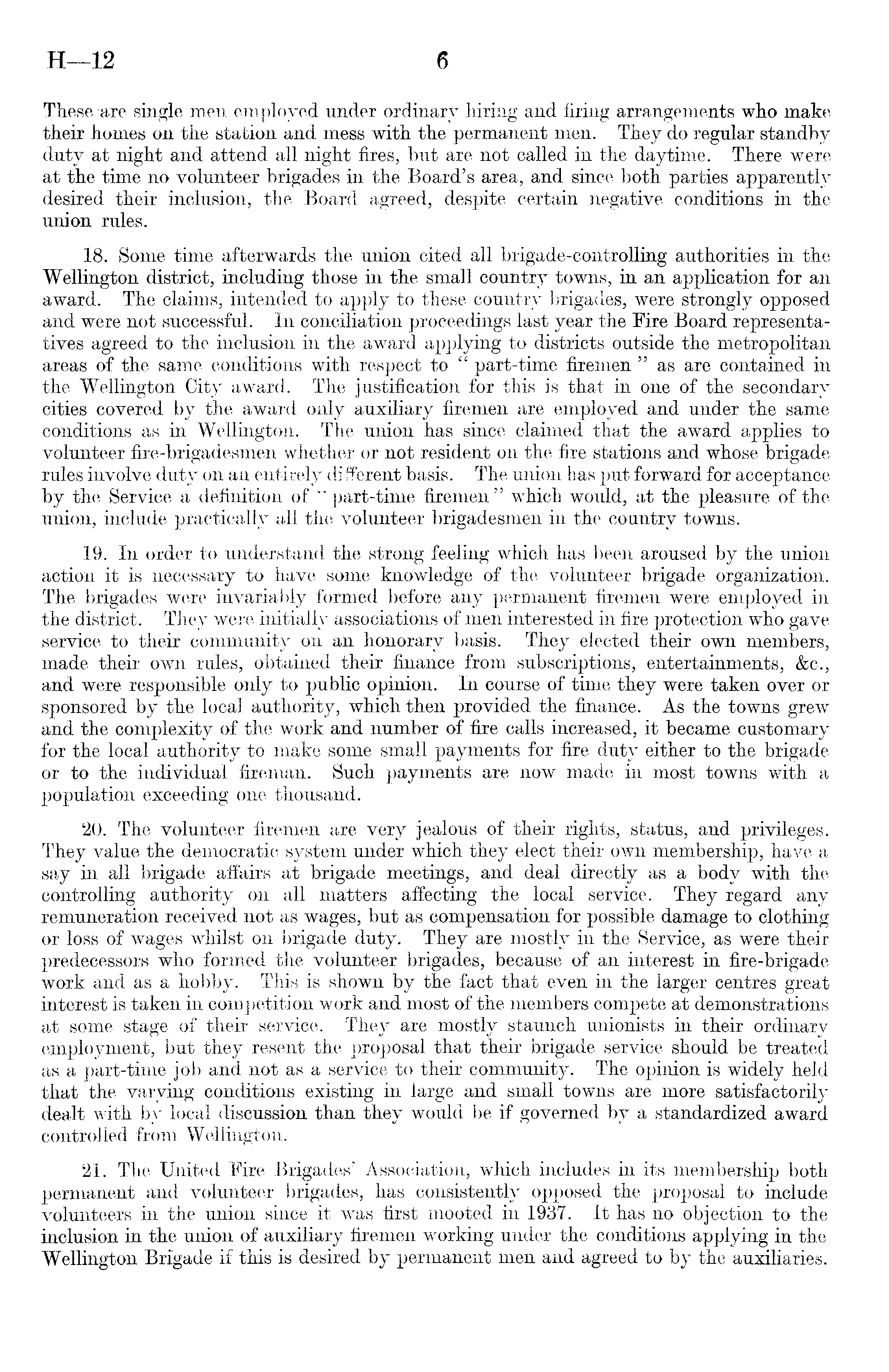 These are single me/ti employed under ordinary hiring and firing arrangements who make their homes on the station and mess with the permanent men. They do regular standby duty at night and attend all night fires, but are not called in the daytime. There were at the time no volunteer brigades in the Board's area, and since both parties apparently desired their inclusion, the Board agreed, despite certain negative conditions in the union rules. 18. Some time afterwards the union cited all brigade-controlling authorities in the Wellington district, including those in the small country towns, in an application for an award. The claims, intended to apply to these country brigades, were strongly opposed and were not successful. In conciliation proceedings last year the Fire Board representatives agreed to the inclusion in the award applying to districts outside the metropolitan areas of the same conditions with respect to " part-time firemen " as are contained in the Wellington City award. The justification for this is that in one of the secondary cities covered by the award only auxiliary firemen are employed and under the same conditions as in Wellington. The union has since claimed that the award applies to volunteer fire-brigadesmen whether or not resident on the fire stations and whose brigade rules involve duty on an entirely different basis. The union has put forward for acceptance by the Service a definition of "part-time firemen" which would, at the pleasure of the union, include practically all the volunteer brigadesmen in the country towns. 19. In order to understand the strong feeling which has been aroused by the union action it is necessary to have some knowledge of the volunteer brigade organization. The brigades were invariably formed before any permanent firemen were employed in the district. They were initially associations of men interested in fire protection who gave service to their community on an honorary basis. They elected their own members, made their own rules, obtained their finance from subscriptions, entertainments, &c, and were responsible only to public opinion. In course of time they were taken over or sponsored by the local authority, which then provided the finance. As the towns grew and the complexhty of the work and number of fire calls increased, it became customary for the local authority to make some small payments for fire duty either to the brigade or to the individual fireman. Such payments are now made in most towns with a population exceeding one thousand. 20. The volunteer firemen are very jealous of their rights, status, and privileges. They value the democratic system under which they elect their own membership, have a say in all brigade affairs at brigade meetings, and deal directly as a body with the controlling authority on all matters affecting the local service. They regard any remuneration received not as wages, but as compensation for possible damage to clothing or loss of wages whilst on brigade duty. They are mostly in the Service, as were their predecessors who formed the volunteer brigades, because of an interest in fire-brigade work and as a hobby. This is shown by the fact that even in the larger centres great interest is taken in competition work and most of the members compete at demonstrations at some stage of their service. They are mostly staunch unionists in their ordinary employment, but they resent the proposal that their brigade service should be treated as a part-time job and not as a service to their community. The opinion is widely held that the varying conditions existing in large and small towns are more satisfactorily dealt with by local discussion than they would be if governed by a standardized award controlled from Wellington. 21. The United Fire Brigades' Association, which includes in its membership both permanent and volunteer brigades, has consistently opposed the proposal to include volunteers in the union since it was first mooted in 1937. It has no objection to the inclusion in the union of auxiliary firemen working under the conditions applying in the Wellington Brigade if this is desired by permanent men and agreed to by the auxiliaries.