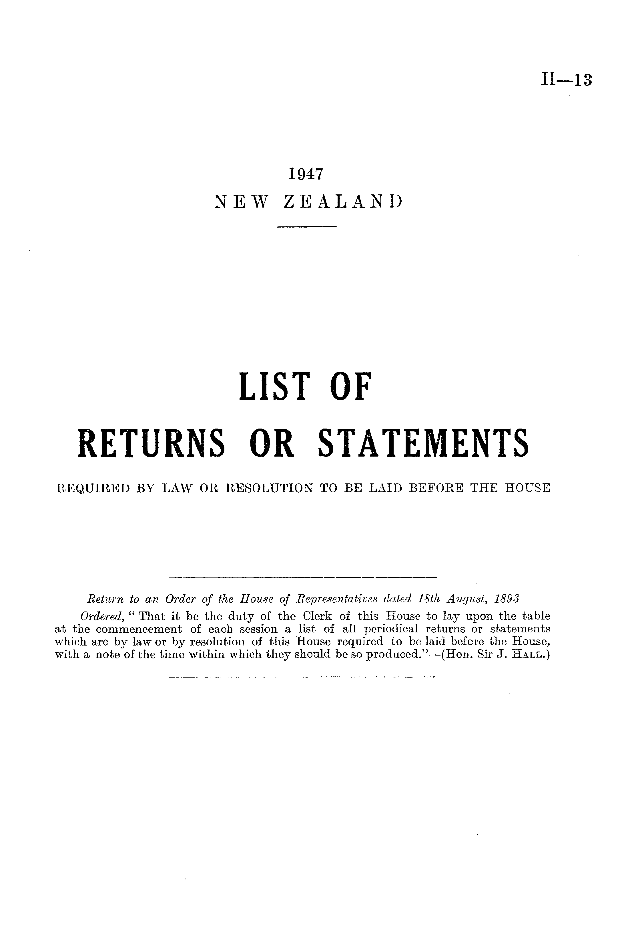 Return to an Order of the House of Representatives dated 18th August, 1893 Ordered, " That it be the duty of the Clerk of this House to lay upon the table at the commencement of each session a list of all periodical returns or statements which are by law or by resolution of this House required to be laid before the House, with a note of the time within which they should be so produced."—(Hon. Sir J. Hall.)