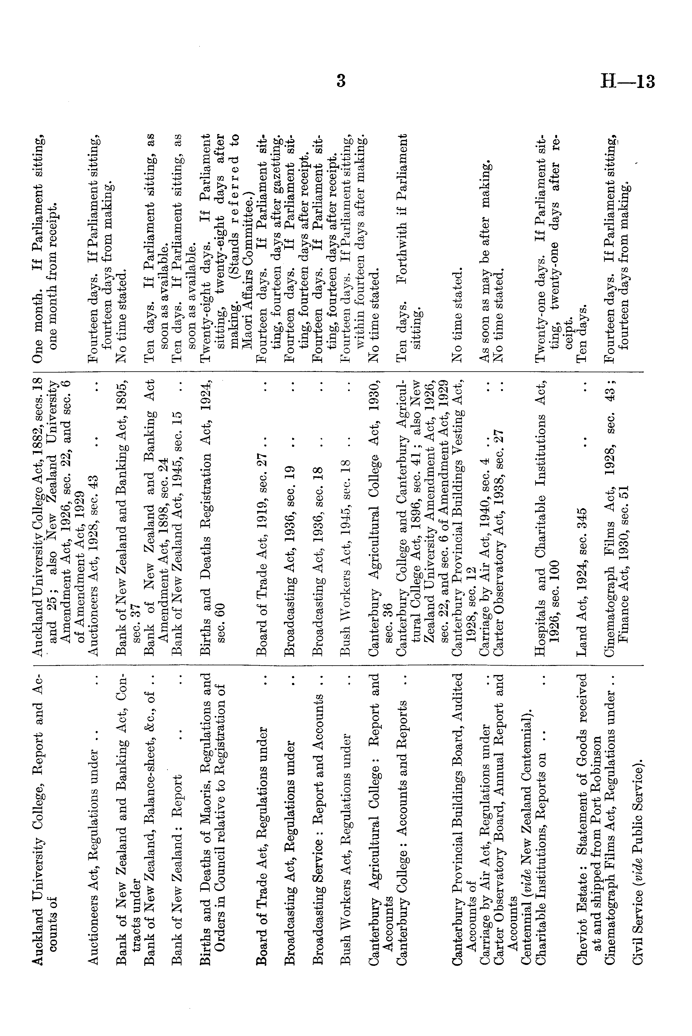 Auckland University College, Report and AcAuckland University College Act, 1882, sees. 18 One month. If Parliament sitting, counts of and 25; also New Zealand University one month from receipt. Amendment Act, 1926, sec. 22, and sec. 6 of Amendment Act, 1929 Auctioneers Act, Regulations under Auctioneers Act, 1928, sec. 43 Fourteen days. If Parliament sitting, fourteen days from making. Bank of New Zealand and Banking Act, ConBank of New Zealand and Banking Act, 1895, No time stated. tracts under sec. 37 Bank of New Zealand, Balance- sheet, &c., of .. Bank of New Zealand and Banking Act Ten days. If Parliament sitting, as Amendment Act, 1898, sec. 24 soon as available. Bank of New Zealand : Report Bank of New Zealand Act, 1945, sec. 15 Ten days. If Parliament sitting, as soon as available. Births and Deaths of Maoris, Regulations and Births and Deaths Registration Act, 1924, Twenty-eight days. If Parliament Orders in Council relative to Registration of sec. 60 sitting, twenty-eight days after making. (Stands referred to Maori Affairs Committee.) Board of Trade Act, Regulations under Board of Trade Act, 1919, sec. 27 .. Fourteen days. If Parliament sitting, fourteen days after gazetting. Broadcasting Act, Regulations under Broadcasting Act, 1936, sec. 19 Fourteen days. If Parliament sitting, fourteen days after receipt. Broadcasting Service : Report and Accounts .. Broadcasting Act, 1936, sec. 18 Fourteen days. If Parliament sitting, fourteen days after receipt. Bush Workers Act, Regulations under Bush Workers Act, 1945, sec. 18 . . Fourteen days. If Parliament sitting, within fourteen days after making. Canterbury Agricultural College: Report and Canterbury Agricultural College Act, 1930, No time stated. Accounts sec. 36 Canterbury College : Accounts and Reports .. Canterbury College and Canterbury AgriculTen days. Forthwith if Parliament tural College Act, 1896, sec. 41; also New sitting. Zealand University Amendment Act, 1926, sec. 22, and sec. 6 of Amendment Act, 1929 Canterbury Provincial Buildings Board, Audited Canterbury Provincial Buildings Vesting Act, No time stated. Accounts of 1928, sec. 12 Carriage by Air Act, Regulations under Carriage by Air Act, 1940, sec. 4 .. As soon as may be after making. Carter Observatory Board, Annual Report and A nnATlTlT.C! Carter Observatory Act, 1938, sec. 27 No time stated. xivtu 11.11 lo Centennial (vide New Zealand Centennial). Charitable Institutions, Reports on .. Hospitals and Charitable Institutions Act, Twenty-one days. If Parliament sit1926, sec. 100 ting, twenty-one days after receipt. Cheviot Estate: Statement of Goods received Land Act, 1924, sec. 345 Ten days. at and shipped from Port Robinson Cinematograph Films Act, Regulations under .. Cinematograph Films Act, 1928, sec. 43; Fourteen days. If Parliament sitting, Finance Act, 1930, sec. 51 fourteen days from making. Civil Service (vide Public Service). ' x