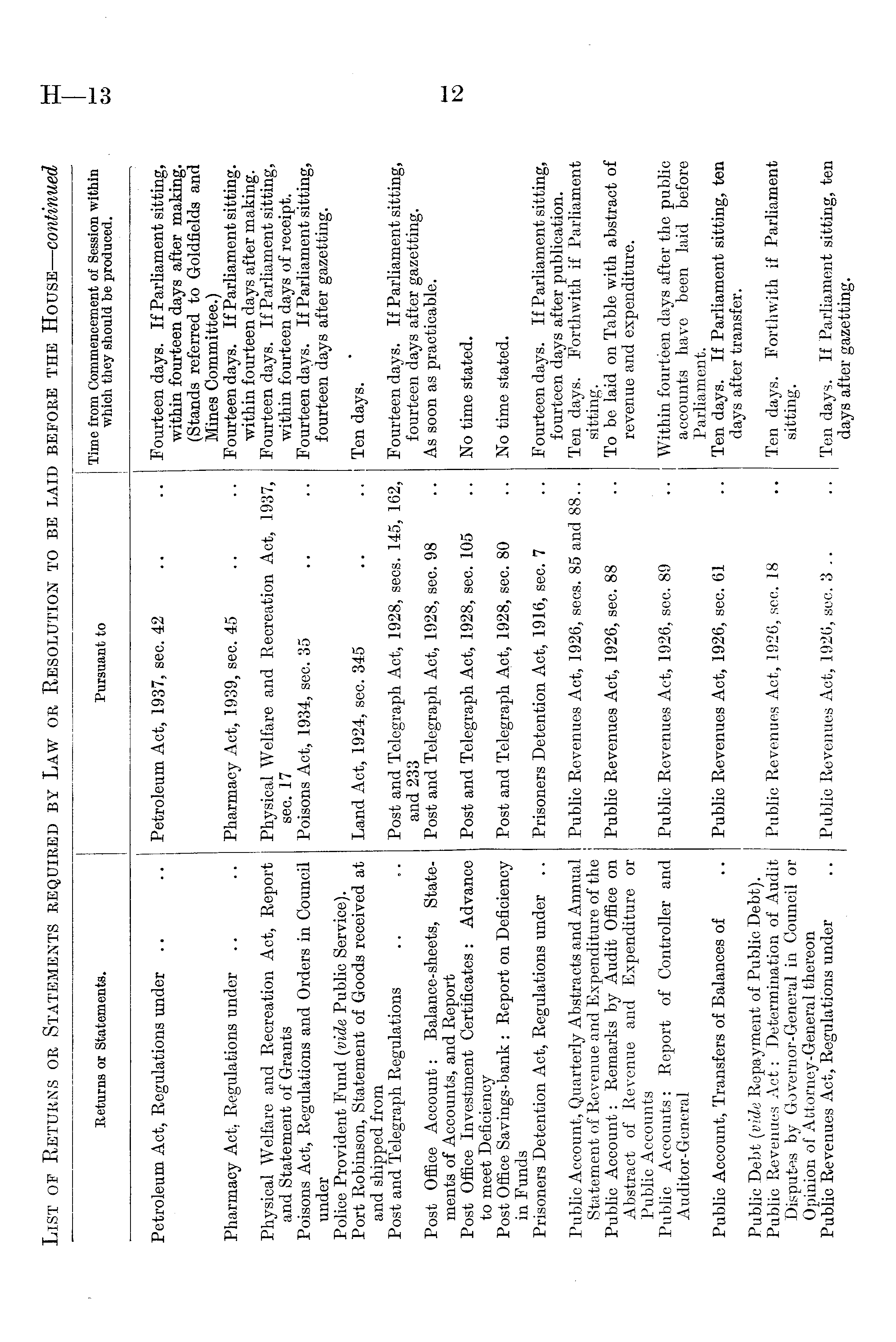 Returns or Statements. Pursuant to Time from Commencement of Session within which they should be produced. Petroleum Act, Regulations under Petroleum Act, 1937, sec. 42 Fourteen days. If Parliament sitting, within fourteen days after making. (Stands referred to Goldfields and Mines Committee.) Pharmacy Act, Regulations under Pharmacy Act, 1939, sec. 45 Fourteen days. If Parliament sitting. within fourteen days after making. Physical Welfare and Recreation Act, Report Physical Welfare and Recreation Act, 1937, Fourteen days. If Parliament sitting, and Statement of Grants sec. 17 within fourteen days of receipt. Poisons Act, Regulations and Orders in Council Poisons Act, 1934, sec. 35 Fourteen days. If Parliament sitting, under fourteen days after gazetting. Police Provident Fund (vide Public Service). Port Robinson, Statement of Goods received at Land Act, 1924, sec. 345 Ten days. and shipped from ' Post and Telegraph Regulations ' Post and Telegraph Act, 1928, sees. 145, 162, Fourteen days. If Parliament sitting, and 233 fourteen days after gazetting. Post Office Account: Balance-sheets, State- ' Post and Telegraph Act, 1928, sec. 98 As soon as practicable. ments of Accounts, and Report Post Office Investment Certificates: Advance Post and Telegraph Act, 1928, sec. 105 No time stated. to meet Deficiency Post Office Savings-bank : Report on Deficiency Post and Telegraph Act, 1928, sec. 80 No time stated. in Funds Prisoners Detention Act, Regulations under .. Prisoners Detention Act, 1916, sec. 7 Fourteen days. If Parliament sitting, fourteen days after publication. Public Account, Quarterly Abstracts and Annual Public Revenues Act, 1926, sees. 85 and 88.. Ten days. Forthwith if Parliament Statement of Revenue and Expenditure of the sitting. Public Account: Remarks by Audit Office on Public Revenues Act, 1926, sec. 88 To be laid on Table with abstract of Abstract of Revenue and Expenditure or revenue and expenditure. Public Accounts Public Accounts: Report of Controller and Public Revenues Act, 1926, sec. 89 [ Within fourteen days after the public Auditor- General accounts have been laid before Parliament. Public Account, Transfers of Balances of Public Revenues Act, 1926, sec. 61 Ten days. If Parliament sitting, ten days after transfer. Public Debt (vide Repayment of Public Debt). Public Revenues Act: Determination of Audit Public Revenues Act, 1926, sec. 18 Ten days. Forthwith if Parliament Disputes by Governor-General in Council or sitting. Opinion of Attorney-General thereon Public Revenues Act, Regulations under Public Revenues Act, 1926, sec. 3 .. Ten days. If Parliament sitting, ten days after gazetting.