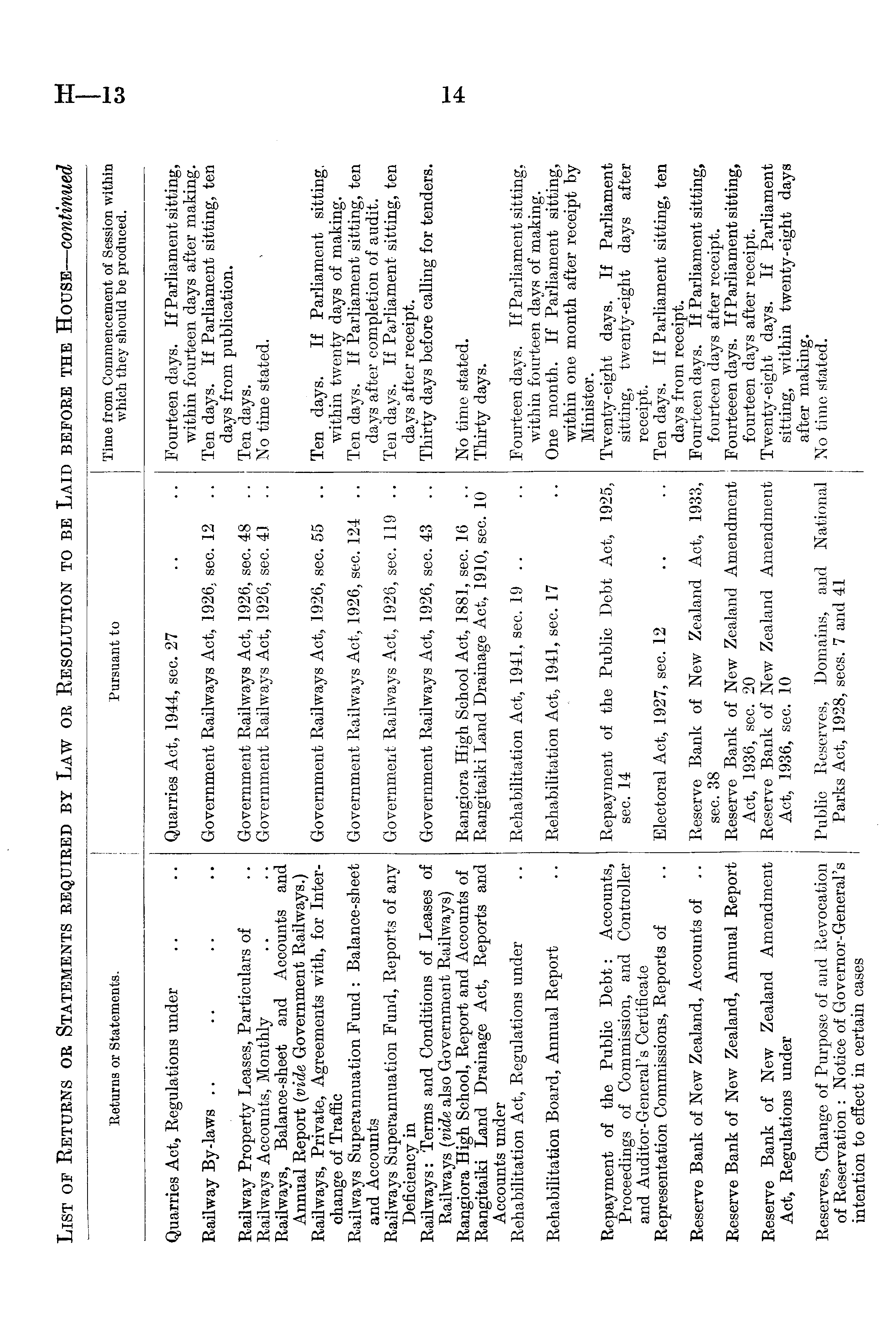 Returns or Statements. Pursuant to Time from Commencement of Session within which they should be produced. Quarries Act, Regulations under Quarries Act, 1944, sec. 27 Fourteen days. If Parliament sitting, within fourteen days after making. Railway By-laws Government Railways Act, 1926, sec. 12 Ten days. If Parliament sitting, ten days from publication. Railway Property Leases, Particulars of Government Railways Act, 1926, sec. 48 Ten days. Railways Accounts, Monthly Government Railways Act, 1926, sec. 41 No time stated. Railways, Balance-sheet and Accounts and Annual Report (vide Government Railways.) Railways, Private, Agreements with, for InterGovernment Railways Act, 1926, sec. 55 Ten days. If Parliament sitting. change of Traffic within twenty days of making. Railways Superannuation Fund : Balance-sheet Government Railways Act, 1926, sec. 124 .. Ten days. If Parliament sitting, ten and Accounts days after completion of audit. Railways Superannuation Fund, Reports of any Government Railways Act, 1926, sec. 119 .. Ten days. If Parliament sitting, ten Deficiency in days after receipt. Railways: Terms and Conditions of Leases of Government Railways Act, 1926, sec. 43 Thirty days before calling for tenders. Railways (vide also Government Railways) Rangiora High School, Report and Accounts of Rangiora High School Act, 1881, sec. 16 No time stated. Rangitaiki Land Drainage Act, Reports and Rangitaiki Land Drainage Act, 1910, sec. 10 Thirty days. Accounts under Rehabilitation Act, Regulations under Rehabilitation Act, 1941, sec. 19 .. Fourteen days. If Parliament sitting, within fourteen days of making. Rehabilitation Board, Annual Report Rehabilitation Act, 1941, sec. 17 One month. If Parliament sitting, within one month after receipt by Minister. Repayment of the Public Debt: Accounts, Repayment of the Public Debt Act, 1925, Twenty-eight days. If Parliament Proceedings of Commission, and Controller sec. 14 sitting, twenty-eight days after and Auditor-General's Certificate receipt. Representation Commissions, Reports of Electoral Act, 1927, sec. 12 Ten days. If Parliament sitting, ten days from receipt. Reserve Bank of New Zealand, Accounts of .. Reserve Bank of New Zealand Act, 1933, Fourteen days. If Parliament sitting, sec. 38 fourteen days after receipt. Reserve Bank of New Zealand, Annual Report Reserve Bank of New Zealand Amendment Fourteeen days. If Parliament sitting, Act, 1936, sec. 20 fourteen days after receipt. Reserve Bank of New Zealand Amendment Reserve Bank of New Zealand Amendment Twenty-eight days. If Parliament Act, Regulations under Act, 1936, sec. 10 sitting, within twenty-eight days after making. Reserves, Change of Purpose of and Revocation Public Reserves, Domains, and National No time stated. of Reservation : Notice of Governor-General's Parks Act, 1928, sees. 7 and 41 intention to effect in certain cases