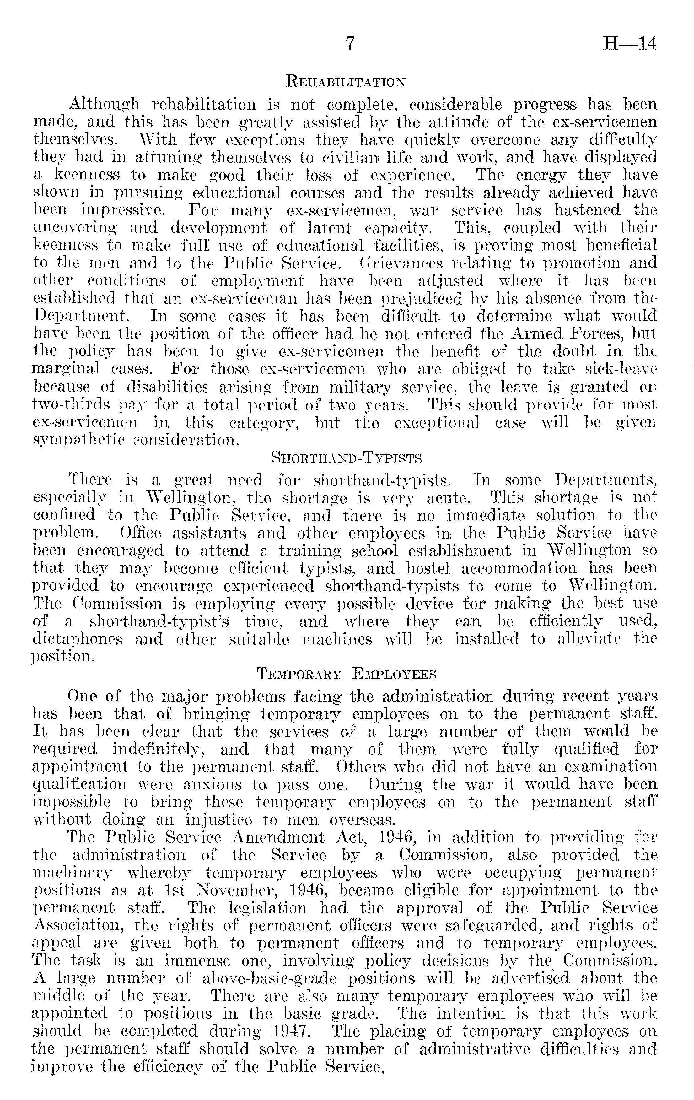 Rehabilitation Although rehabilitation is not complete, considerable progress has been made, and this has been greatly assisted by the attitude of the ex-servicemen themselves. With few exceptions they have quickly overcome any difficulty they had in attuning themselves to civilian life and work, and have displayed a keenness to make good their loss of experience. The energy they have shown in pursuing educational courses and the results already achieved have been impressive. For many ex-servicemen, war service has hastened the uncovering and development of latent capacity. This, coupled with their keenness to make full; use of educational facilities, is proving most beneficial to the men and to the Public Service. Grievances relating to promotion and other conditions of employment have been adjusted where it has been established that an ex-serviceman has been prejudiced by his absence from the Department, In some cases it has been difficult to determine what would have been the position of the officer had he not entered the Armed Forces, but the policy has been to give ex-servicemen the benefit of the doubt in the marginal cases. For those ex-servicemen who are obliged to take sick-leave because of disabilities arising from military service, the leave is granted on two-thirds pay for a total period of two years. This should provide for most ex-servicemen in this category, but the exceptional case will be given sympathetic consideration. Shorthand-Typists There is a great need for shorthand-typists. In some Departments, especially in "Wellington, the shortage is very acute. This shortage is not confined to the Public Service, and there is no immediate solution to the problem. Office assistants and other employees in the Public Service have been encouraged to attend a training school establishment in Wellington so that they may become efficient typists, and hostel accommodation has been provided to encourage experienced shorthand-typists to come to Wellington. The Commission is employing every possible device for making the best use of a shorthand-typist's! time, and where they can be efficiently used, dictaphones and other suitable machines will be installed to alleviate the position. Temporary Employees One of the major problems facing the administration during recent years has been that of bringing temporary employees on to the permanent staff. It has been clear that the services of a large number of them would be required indefinitely, and that many of them were fully qualified for appointment to the permanent staff. Others who did not have an examination qualification were anxious ta pass one. During the war it would have been impossible to bring these temporary employees on to the permanent staff without doing an injustice to men overseas. The Public Service Amendment Act, 1946, in addition to providing for the administration of the Service by a Commission, also provided the machinery whereby temporary employees who were occupying permanent positions as at Ist November, 1946, became eligible for appointment to the permanent staff. The legislation had the approval of the Public Service Association, the rights of permanent officers were safeguarded, and rights of appeal are given both to permanent officers and to temporary employees. The task is an immense one, involving policy decisions by the Commission. A large number of above-basic-grade positions will be advertised about the middle of the year. There are also many temporary employees who will be appointed to positions in the basic grade. The intention is that this work should be completed during 1947. The placing of temporary employees on the permanent staff should solve a number of administrative difficulties and improve the efficiency of the Public Service,