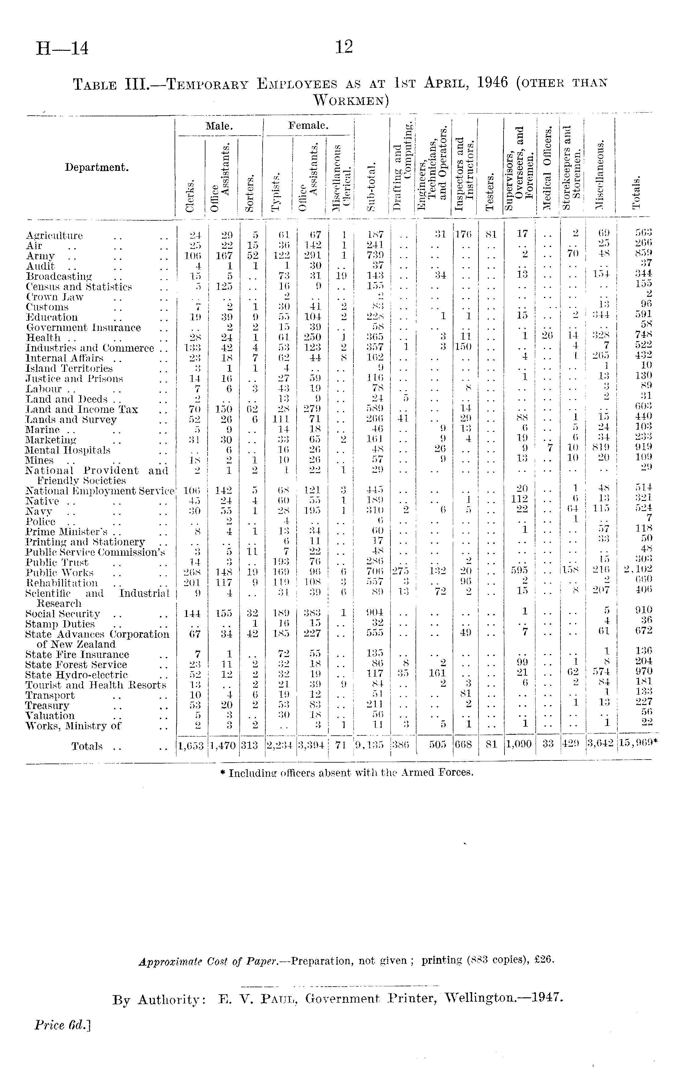 Table III.—Temporary Employees as at 1st April, 1946 (other than Workmen)