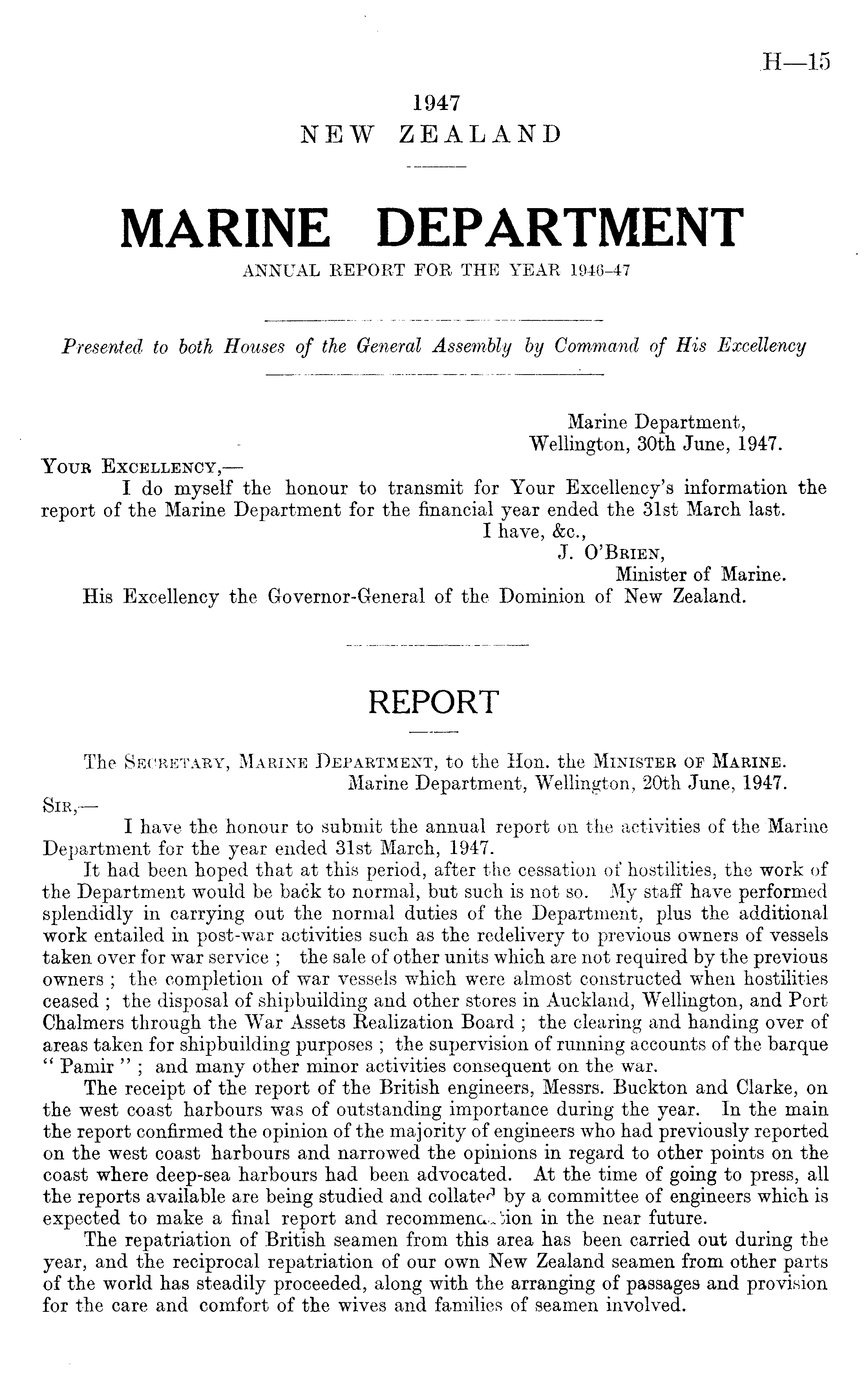 Marine Department, Wellington, 30th June, 1947. Your Excellency,— I do myself the honour to transmit for Your Excellency's information the report of the Marine Department for the financial year ended the 31st March last. I have, &c., J. O'Brien, Minister of Marine. His Excellency the Governor-General of the Dominion of New Zealand.