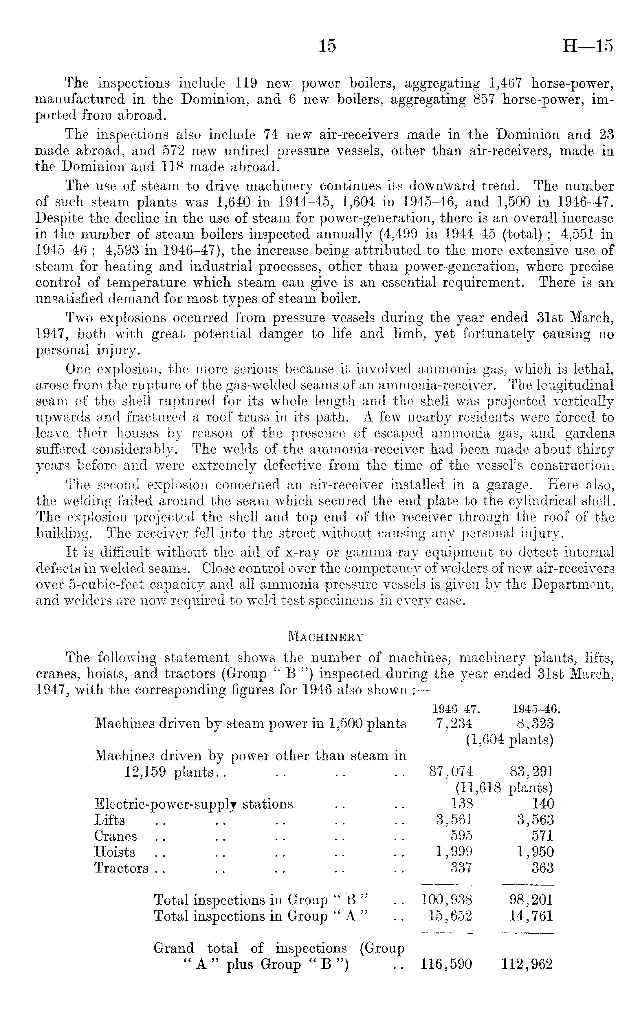 The inspections include 119 new power boilers, aggregating 1,467 horse-power, manufactured in the Dominion, and 6 new boilers, aggregating 857 horse-power, imported from abroad. The inspections also include 74 new air-receivers made in the Dominion and 23 made abroad, and 572 new unfired pressure vessels, other than air-receivers, made in the Dominion and 118 made abroad. The use of steam to drive machinery continues its downward trend. The number of such steam plants was 1,640 in 1944-45, 1,604 in 1945-46, and 1,500 in 1946-47. Despite the decline in the use of steam for power-generation, there is an overall increase in the number of steam boilers inspected annually (4,499 in 1944-45 (total); 4,551 in 1945-46 ; 4,593 in 1946-47), the increase being attributed to the more extensive use of steam for heating and industrial processes, other than power-generation, where precise control of temperature which steam can give is an essential requirement. There is an unsatisfied demand for most types of steam boiler. Two explosions occurred from pressure vessels during the year ended 31st March, 1947, both with great potential danger to life and limb, yet fortunately causing no personal injury. One explosion, the more serious because it involved ammonia gas, which is lethal, arose from the rupture of the gas-welded seams of an ammonia-receiver. The longitudinal seam of the shell ruptured for its whole length and the shell was projected vertically upwards and fractured a roof truss in its path. A few nearby residents were forced to leave their houses by reason of the presence of escaped ammonia gas, and gardens suffered considerably. The welds of the ammonia-receiver had been made about thirty years before and were extremely defective from the time of the vessel's construction. The second explosion concerned an air-receiver installed in a garage. Here also, the welding failed around the seam which secured the end plate to the cylindrical shell. The explosion projected the shell and top end of the receiver through the roof of the building. The receiver fell into the street without causing any personal injury. It is difficult without the aid of x-ray or gamma-ray equipment to detect internal defects in welded seams. Close control over the competency of welders of new air-receivers over 5-cubic-feet capacity and all ammonia pressure vessels is given by the Department, and welders are now required to weld test specimens in every case. Machinery The following statement shows the number of machines, machinery plants, lifts, cranes, hoists, and tractors (Group " B ") inspected during the year ended 31st March, 1947, with the corresponding figures for 1946 also shown : 1946-47. 1945-46. Machines driven by steam power in 1,500 plants 7,234 8,323 (1,604 plants) Machines driven by power other than steam in 12,159 plants.. .. .. .. 87,074 83,291 (11,618 plants) Electric-power-supply stations .. .. 138 140 Lifts .. .. .. .. .. 3,561 3,563 Cranes .. .. .. .. .. 595 571 Hoists .. .. .. .. .. 1,999 1,950 Tractors .. .. .. 337 363 Total inspections in Group "B " .. 100,938 98,201 Total inspections in Group "A" .. 15,652 14,761 Grand total of inspections (Group "A " plus Group "B ") .. 116,590 112,962