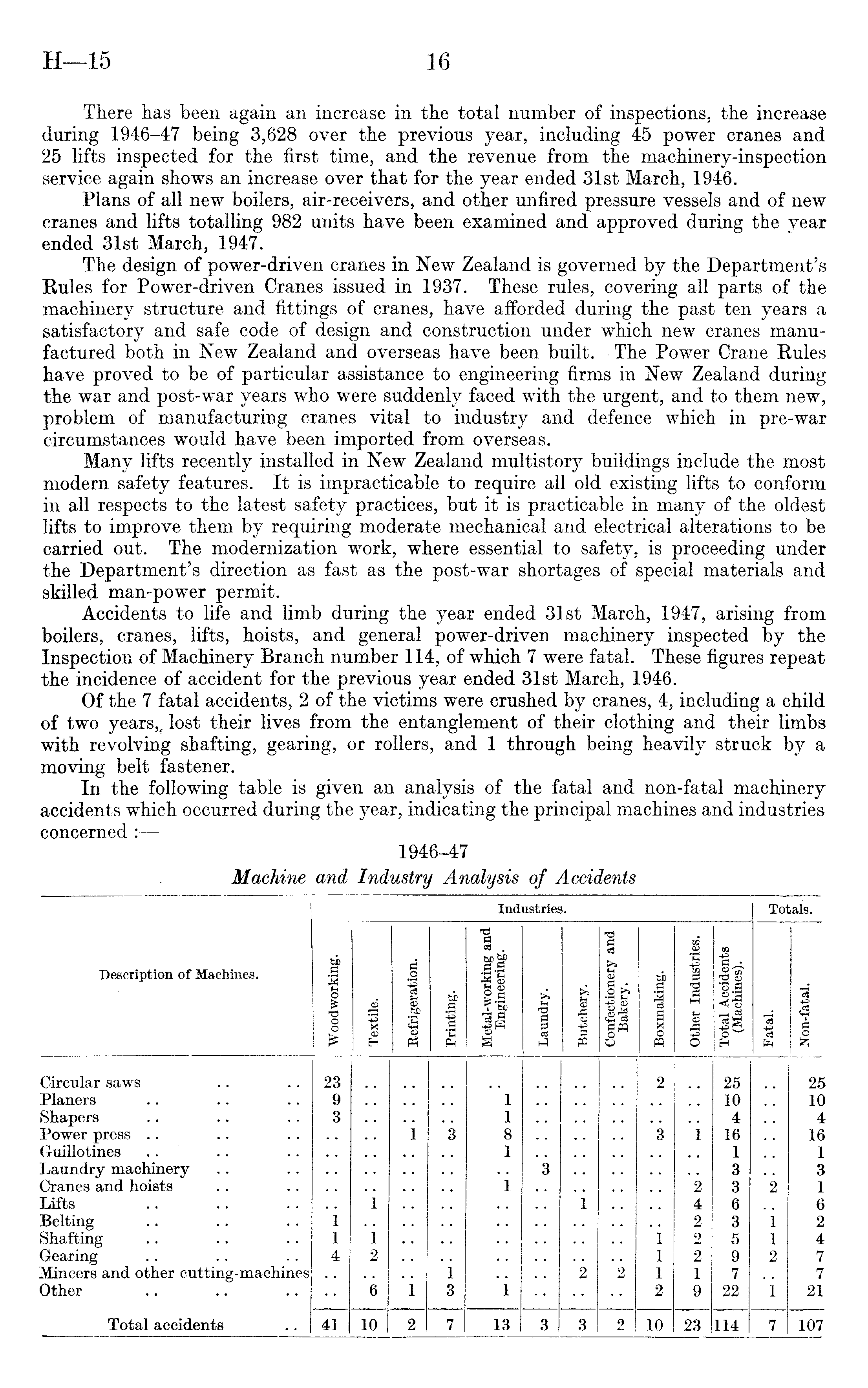 There has been again an increase in the total number of inspections, the increase during 1946-47 being 3,628 over the previous year, including 45 power cranes and 25 lifts inspected for the first time, and the revenue from the machinery-inspection service again shows an increase over that for the year ended 31st March, 1946. Plans of all new boilers, air-receivers, and other unfired pressure vessels and of new cranes and lifts totalling 982 units have been examined and approved during the year ended 31st March, 1947. The design of power-driven cranes in New Zealand is governed by the Department's Rules for Power-driven Cranes issued in 1937. These rules, covering all parts of the machinery structure and fittings of cranes, have afforded during the past ten years a satisfactory and safe code of design and construction under which new cranes manufactured both in New Zealand and overseas have been built. The Power Crane Rules have proved to be of particular assistance to engineering firms in New Zealand during the war and post-war years who were suddenly faced with the urgent, and to them new, problem of manufacturing cranes vital to industry and defence which in pre-war circumstances would have been imported from overseas. Many lifts recently installed in New Zealand multistory buildings include the most modern safety features. It is impracticable to require all old existing lifts to conform in all respects to the latest safety practices, but it is practicable in many of the oldest lifts to improve them by requiring moderate mechanical and electrical alterations to be carried out. The modernization work, where essential to safety, is proceeding under the Department's direction as fast as the post-war shortages of special materials and skilled man-power permit. Accidents to life and limb during the year ended 31st March, 1947, arising from boilers, cranes, lifts, hoists, and general power-driven machinery inspected by the Inspection of Machinery Branch number 114, of which 7 were fatal. These figures repeat the incidence of accident for the previous year ended 31st March, 1946. Of the 7 fatal accidents, 2 of the victims were crushed by cranes, 4, including a child of two years,, lost their lives from the entanglement of their clothing and their limbs with revolving shafting, gearing, or rollers, and 1 through being heavily struck by a moving belt fastener. In the following table is given an analysis of the fatal and non-fatal machinery accidents which occurred during the year, indicating the principal machines and industries concerned :