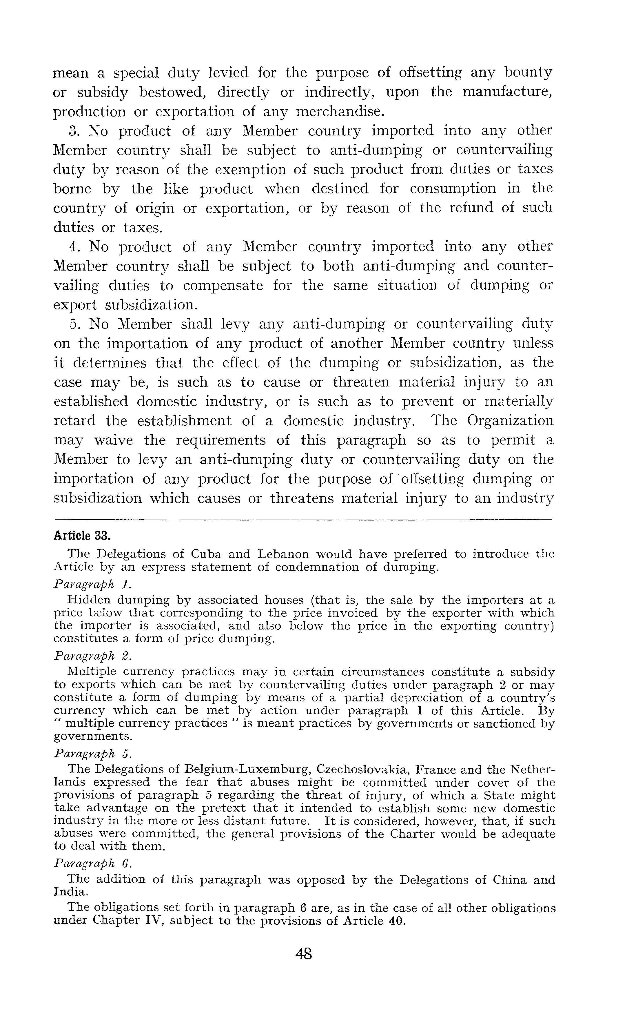 Article 33. The Delegations of Cuba and Lebanon would have preferred to introduce the Article by an express statement of condemnation of dumping. Paragraph 1. Hidden dumping by associated houses (that is, the sale by the importers at a price below that corresponding to the price invoiced by the exporter with which the importer is associated, and also below the price in the exporting country) constitutes a form of price dumping. Paragraph 2. Multiple currency practices may in certain circumstances constitute a subsidy to exports which can be met by countervailing duties under paragraph 2 or may constitute a form of dumping by means of a partial depreciation of a country's currency which can be met by action under paragraph 1 of this Article. By " multiple currency practices " is meant practices by governments or sanctioned by governments. Paragraph 5. The Delegations of Belgium-Luxemburg, Czechoslovakia, France and the Netherlands expressed the fear that abuses might be committed under cover of the provisions of paragraph 5 regarding the threat of injury, of which a State might take advantage on the pretext that it intended to establish some new domestic industry in the more or less distant future. It is considered, however, that, if such abuses were committed, the general provisions of the Charter would be adequate to deal with them. Paragraph 6. The addition of this paragraph was opposed by the Delegations of China and India. The obligations set forth in paragraph 6 are, as in the case of all other obligations under Chapter IV, subject to the provisions of Article 40.