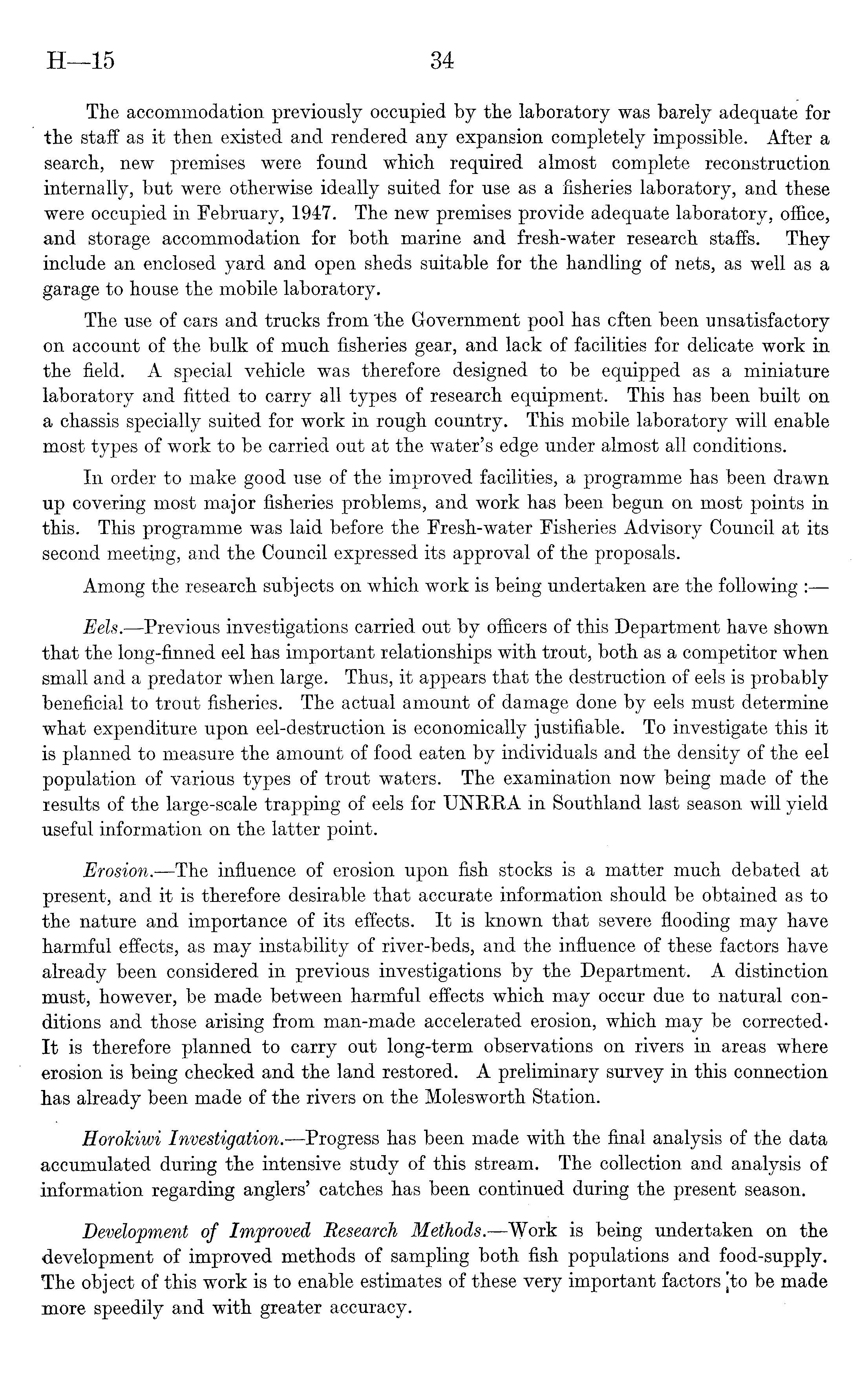 The accommodation previously occupied by the laboratory was barely adequate for the staff as it then existed and rendered any expansion completely impossible. After a search, new premises were found which required almost complete reconstruction internally, but were otherwise ideally suited for use as a fisheries laboratory, and these were occupied in February, 1947. The new premises provide adequate laboratory, office, and storage accommodation for both marine and fresh-water research staffs. They include an enclosed yard and open sheds suitable for the handling of nets, as well as a garage to house the mobile laboratory. The use of cars and trucks from "the Government pool has often been unsatisfactory on account of the bulk of much fisheries gear, and lack of facilities for delicate work in the field. A special vehicle was therefore designed to be equipped as a miniature laboratory and fitted to carry all types of research equipment. This has been built on a chassis specially suited for work in rough country. This mobile laboratory will enable most types of work to be carried out at the water's edge under almost all conditions. In order to make good use of the improved facilities, a programme has been drawn up covering most major fisheries problems, and work has been begun on most points in this. This programme was laid before the Fresh-water Fisheries Advisory Council at its second meeting, and the Council expressed its approval of the proposals. Among the research subjects on which work is being undertaken are the following : Eels. —Previous investigations carried out by officers of this Department have shown that the long-finned eel has important relationships with trout, both as a competitor when small and a predator when large. Thus, it appears that the destruction of eels is probably beneficial to trout fisheries. The actual amount of damage done by eels must determine what expenditure upon eel-destruction is economically justifiable. To investigate this it is planned to measure the amount of food eaten by individuals and the density of the eel population of various types of trout waters. The examination now being made of the results of the large-scale trapping of eels for UNRRA in Southland last season will yield useful information on the latter point. Erosion. —The influence of erosion upon fish stocks is a matter much debated at present, and it is therefore desirable that accurate information should be obtained as to the nature and importance of its effects. It is known that severe flooding may have harmful effects, as may instability of river-beds, and the influence of these factors have already been considered in previous investigations by the Department. A distinction must, however, be made between harmful effects which may occur due to natural conditions and those arising from man-made accelerated erosion, which may be It is therefore planned to carry out long-term observations on rivers in areas where erosion is being checked and the land restored. A preliminary survey in this connection has already been made of the rivers on the Molesworth Station. Horokiwi Investigation. —Progress has been made with the final analysis of the data accumulated during the intensive study of this stream. The collection and analysis of information regarding anglers' catches has been continued during the present season. Development of Improved Research Methods.—Work is being undertaken on the development of improved methods of sampling both fish populations and food-supply. The object of this work is to enable estimates of these very important factors jto be made more speedily and with greater accuracy.