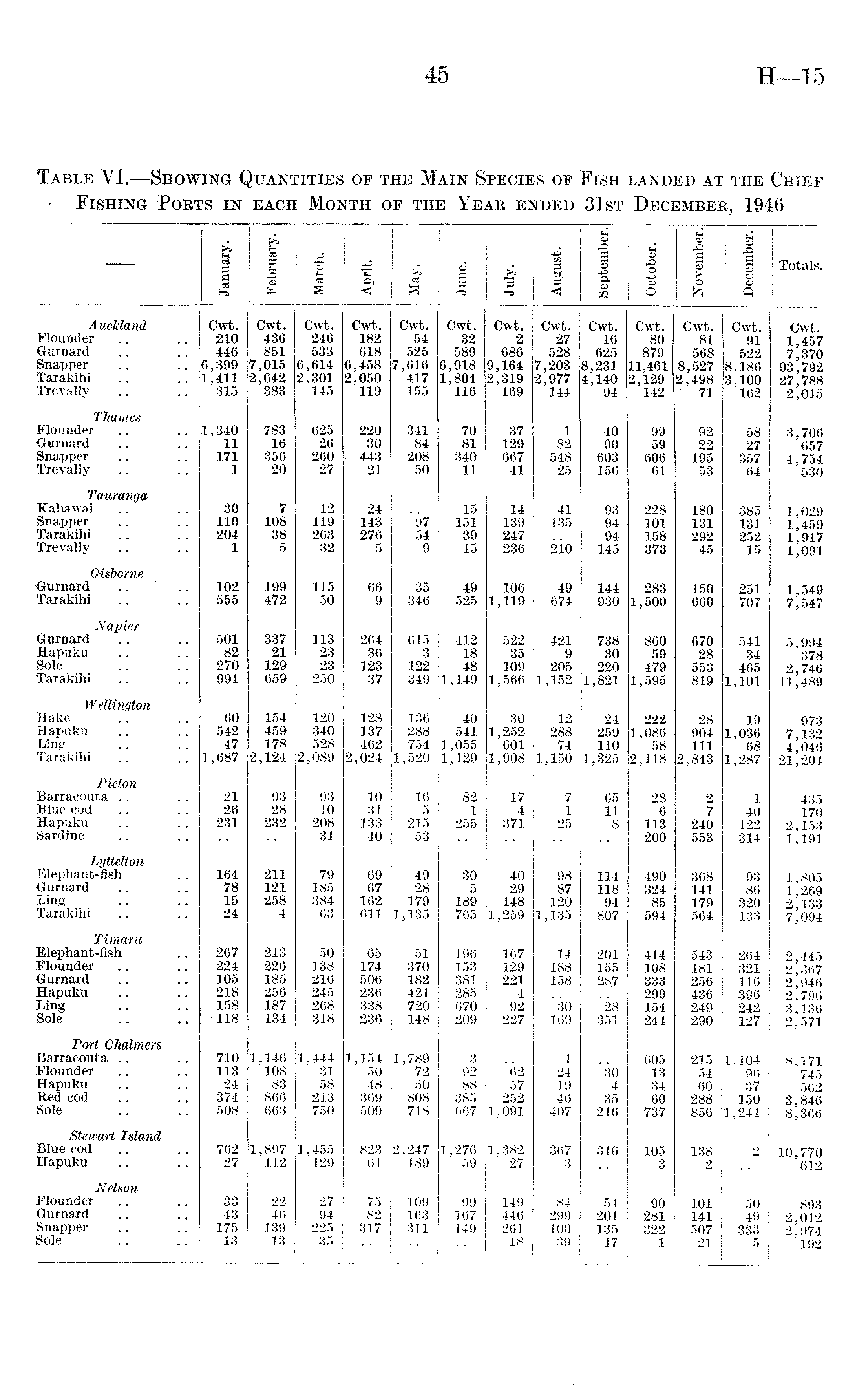 Table VI.—Showing Quantities of the Main Species of Fish landed at the Chief Fishing Ports in each Month of the Year ended 31st December, 1946