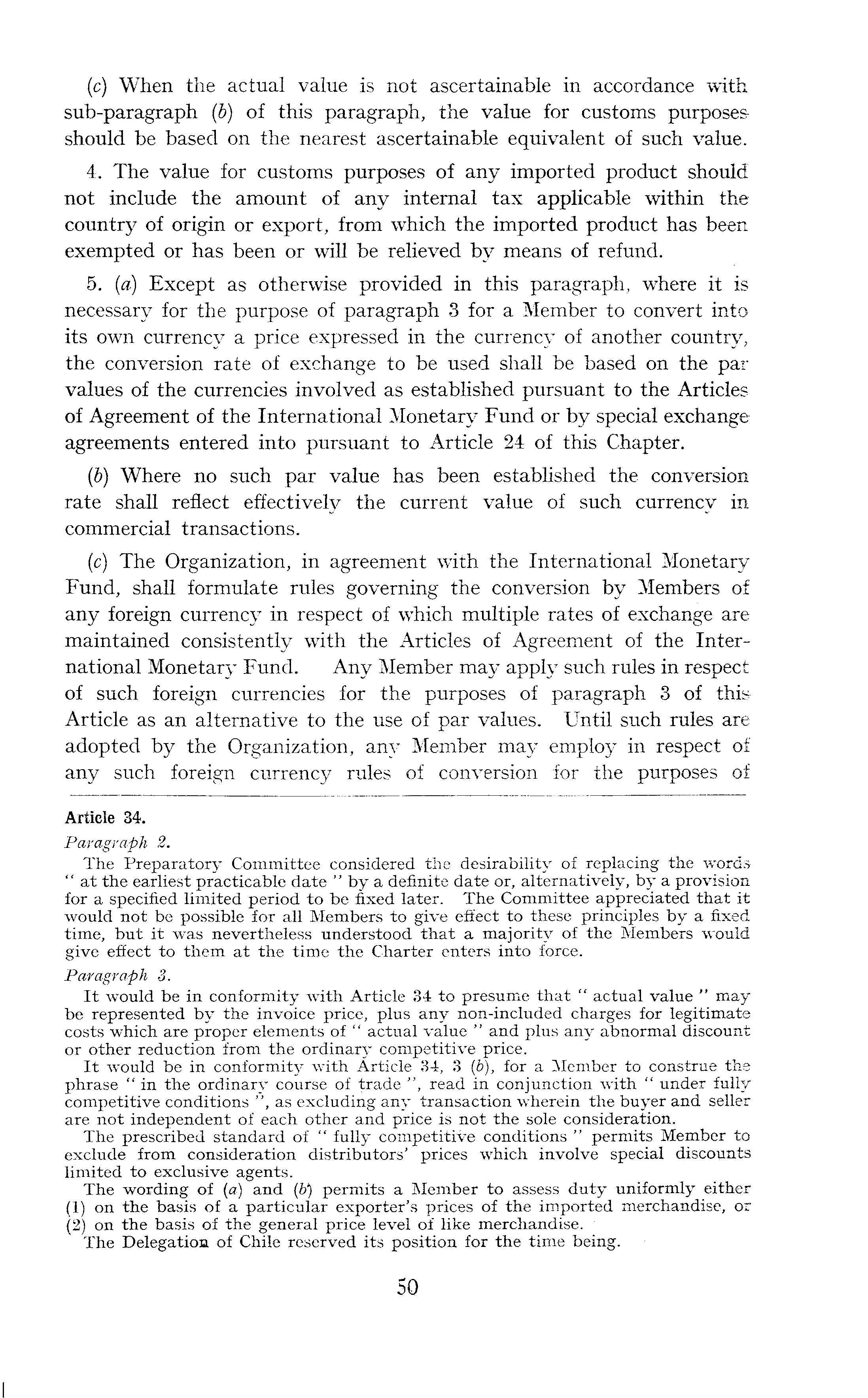Article 34. Paragraph 2. The Preparatory Committee considered the desirability of replacing the words " at the earliest practicable date " by a definite date or, alternatively, by a provision for a specified limited period to be fixed later. The Committee appreciated that it would not be possible for all Members to give effect to these principles by a fixed time, but it was nevertheless understood that a majority of the Members would give effect to them at the time the Charter enters into force. Paragraph 3. It would be in conformity with Article 34 to presume that " actual value " may be represented by the invoice price, plus any non-included charges for legitimate costs which are proper elements of " actual value " and plus any abnormal discount or other reduction from the ordinary competitive price. It would be in conformity with Article 34, 3 (b), for a Member to construe the phrase " in the ordinary course of trade ", read in conjunction with " under fully competitive conditions as excluding any transaction wherein the buyer and seller are not independent of each other and price is not the sole consideration. The prescribed standard of " fully competitive conditions " permits Member to exclude from consideration distributors' prices which involve special discounts limited to exclusive agents. The wording of (a) and (b) permits a Member to assess duty uniformly either (1) on the basis of a particular exporter's prices of the imported merchandise, or (2) on the basis of the general price level of like merchandise. The Delegation of Chile reserved its position for the time being.
