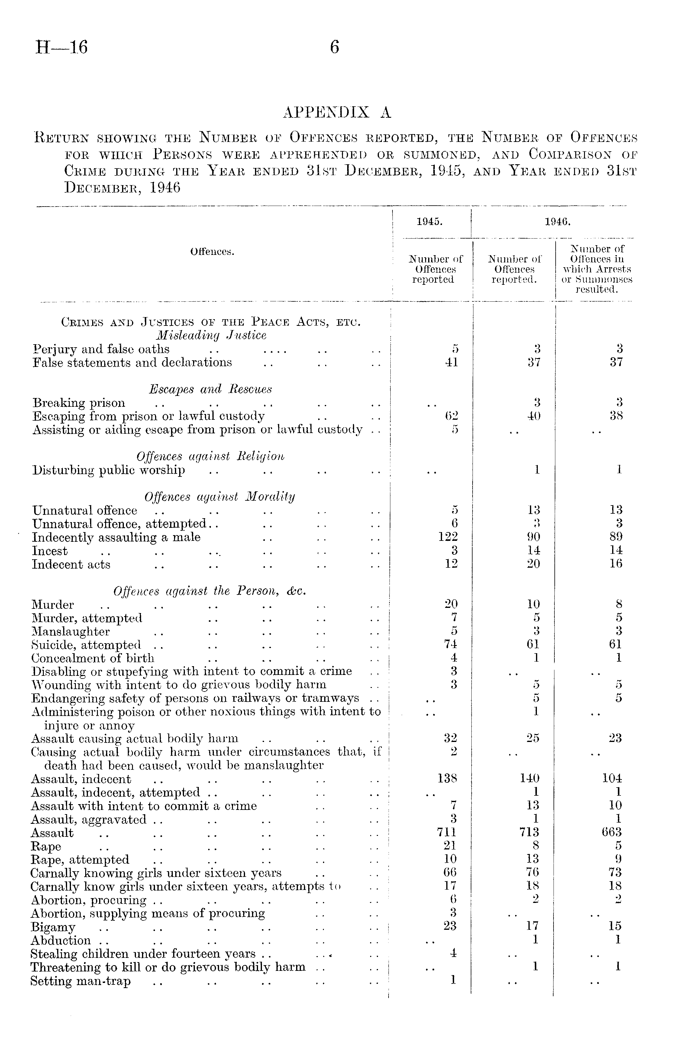 APPENDIX A Return showing the Number of Offences reported, the Number of Offences for which Persons were apprehended or summoned, and Comparison of Crime during the Year ended 31st December, 1945, and Year ended 31st December, 1946