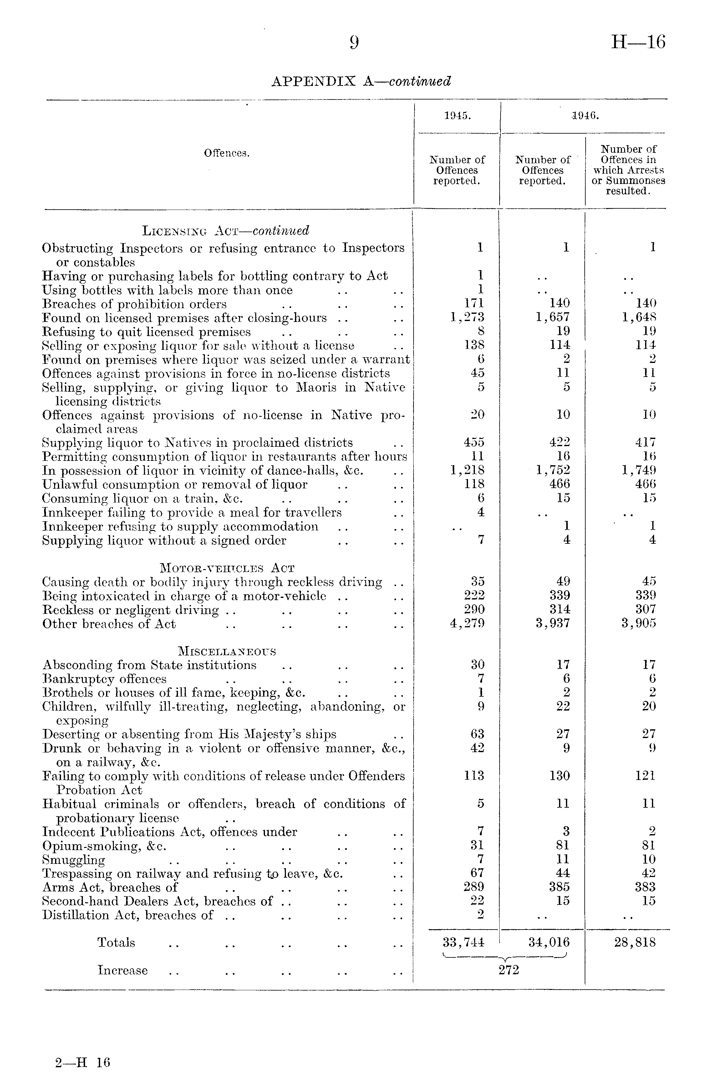 1945. 1946. Offences. Number of Number of Number of ' Offences in Offences Offences which Arrests reported. reported. or Summonses resulted. Licensing Act—continued Obstructing Inspectors or refusing entrance to Inspectors 1 1 1 or constables Haying or purchasing labels for bottling contrary to Act 1 Using bottles with labels more than once 1 Breaches of prohibition orders 171 *140 140 Found on licensed premises after closing-hours 1,273 1,657 1,648 Refusing to quit licensed premises 8 19 19 Selling or exposing liquor for sale without a license 138 114 114 Found on premises where liquor was seized under a warrant 6 2 2 Offences against provisions in force in no-license districts 45 11 11 Selling, supplying, or giving liquor to Maoris in Native 5 5 5 licensing districts Offences against provisions of no-license in Native pro20 10 10 claimed areas Supplying liquor to Natives in proclaimed districts 455 422 417 Permitting consumption of liquor in restaurants after hours 11 16 16 In possession of liquor in vicinity of dance-halls, &c. 1,218 • 1,752 1,749 Unlawful consumption or removal of liquor 118 466 466 Consuming liquor on a train, &c. 6 15 15 Innkeeper failing to provide a meal for travellers 4 Innkeeper refusing to supply accommodation 1 1 Supplying liquor without a signed order 7 4 4 Motor-vehicles Act Causing death or bodily injury through reckless driving .. 35 49 45 Being intoxicated in charge of a motor-vehicle 222 339 339 Reckless or negligent driving 290 314 307 Other breaches of Act 4,279 3,937 3,905 Miscellaneous Absconding from State institutions 30 17 17 Bankruptcy offences 7 6 6 Brothels or houses of ill fame, keeping, &c. 1 2 2 Children, wilfully ill-treating, neglecting, abandoning, or 9 22 20 exposing Deserting or absenting from His Majesty's ships 63 27 27 Drunk or behaving in a violent or offensive manner, &c., 42 9 9 on a railway, &c. Failing to comply with conditions of release under Offenders 113 130 121 Probation Act Habitual criminals or offenders, breach of conditions of 5 11 11 probationary license Indecent Publications Act, offences under 7 3 2 Opium-smoking, &c. 31 81 81 Smuggling 7 11 10 Trespassing on railway and refusing to leave, &c. 67 44 42 Arms Act, breaches of 289 385 383 Second-hand Dealers Act, breaches of .. 22 15 15 Distillation Act, breaches of .. 2 Totals 33,744 34,016 28,818 Increase 272