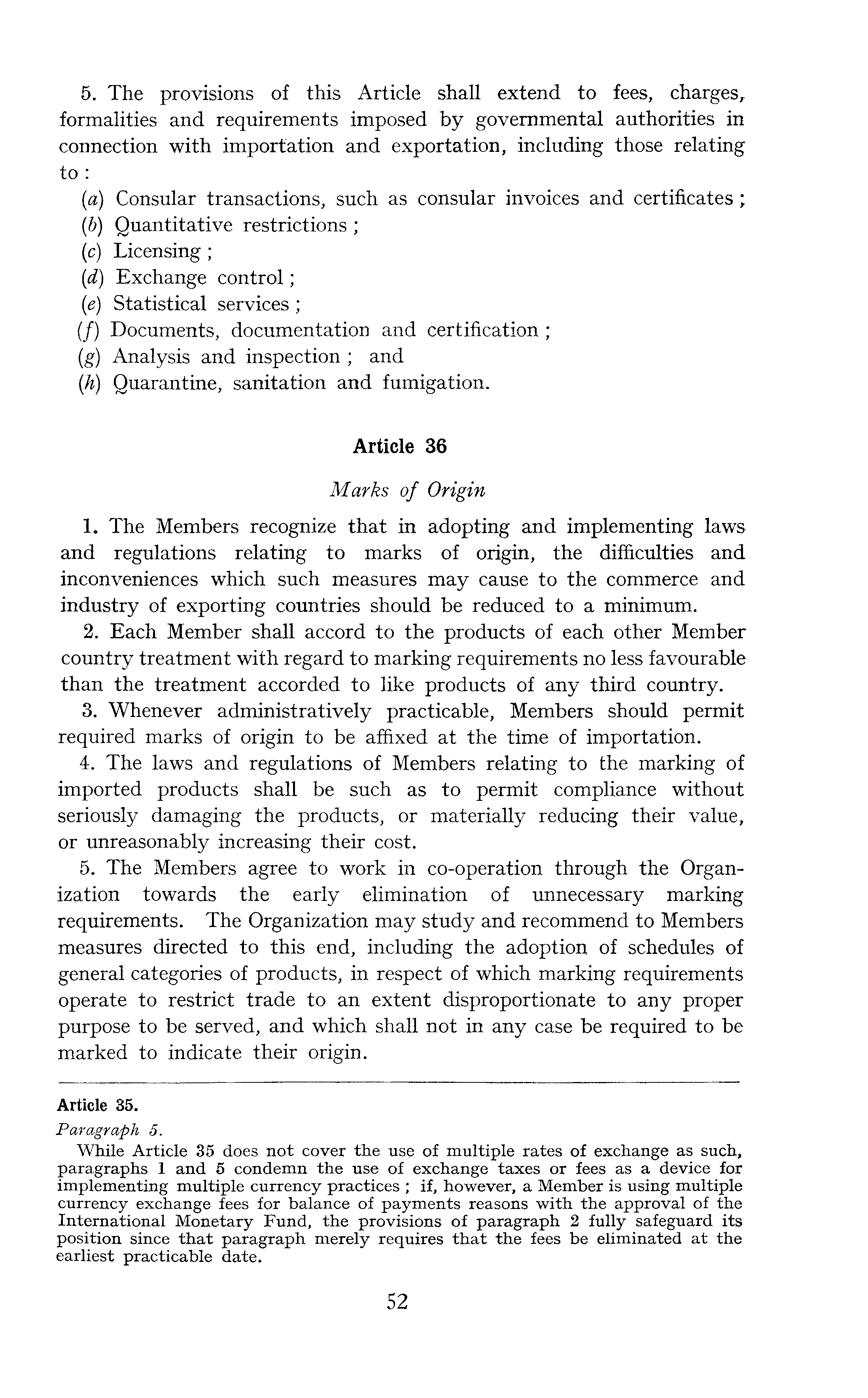 5. The provisions of this Article shall extend to fees, charges, formalities and requirements imposed by governmental authorities in connection with importation and exportation, including those relating to : (a) Consular transactions, such as consular invoices and certificates; (b) Quantitative restrictions; (c) Licensing; (d) Exchange control; (e) Statistical services; (/) Documents, documentation and certification; (g) Analysis and inspection ; and (h) Quarantine, sanitation and fumigation. Article 36 Marks of Origin 1. The Members recognize that in adopting and implementing laws and regulations relating to marks of origin, the difficulties and inconveniences which such measures may cause to the commerce and industry of exporting countries should be reduced to a minimum. 2. Each Member shall accord to the products of each other Member country treatment with regard to marking requirements no less favourable than the treatment accorded to like products of any third country. 3. Whenever administratively practicable, Members should permit required marks of origin to be affixed at the time of importation. 4. The laws and regulations of Members relating to the marking of imported products shall be such as to permit compliance without seriously damaging the products, or materially reducing their value, or unreasonably increasing their cost. 5. The Members agree to work in co-operation through the Organization towards the early elimination of unnecessary marking requirements. The Organization may study and recommend to Members measures directed to this end, including the adoption of schedules of general categories of products, in respect of which marking requirements operate to restrict trade to an extent disproportionate to any proper purpose to be served, and which shall not in any case be required to be marked to indicate their origin.