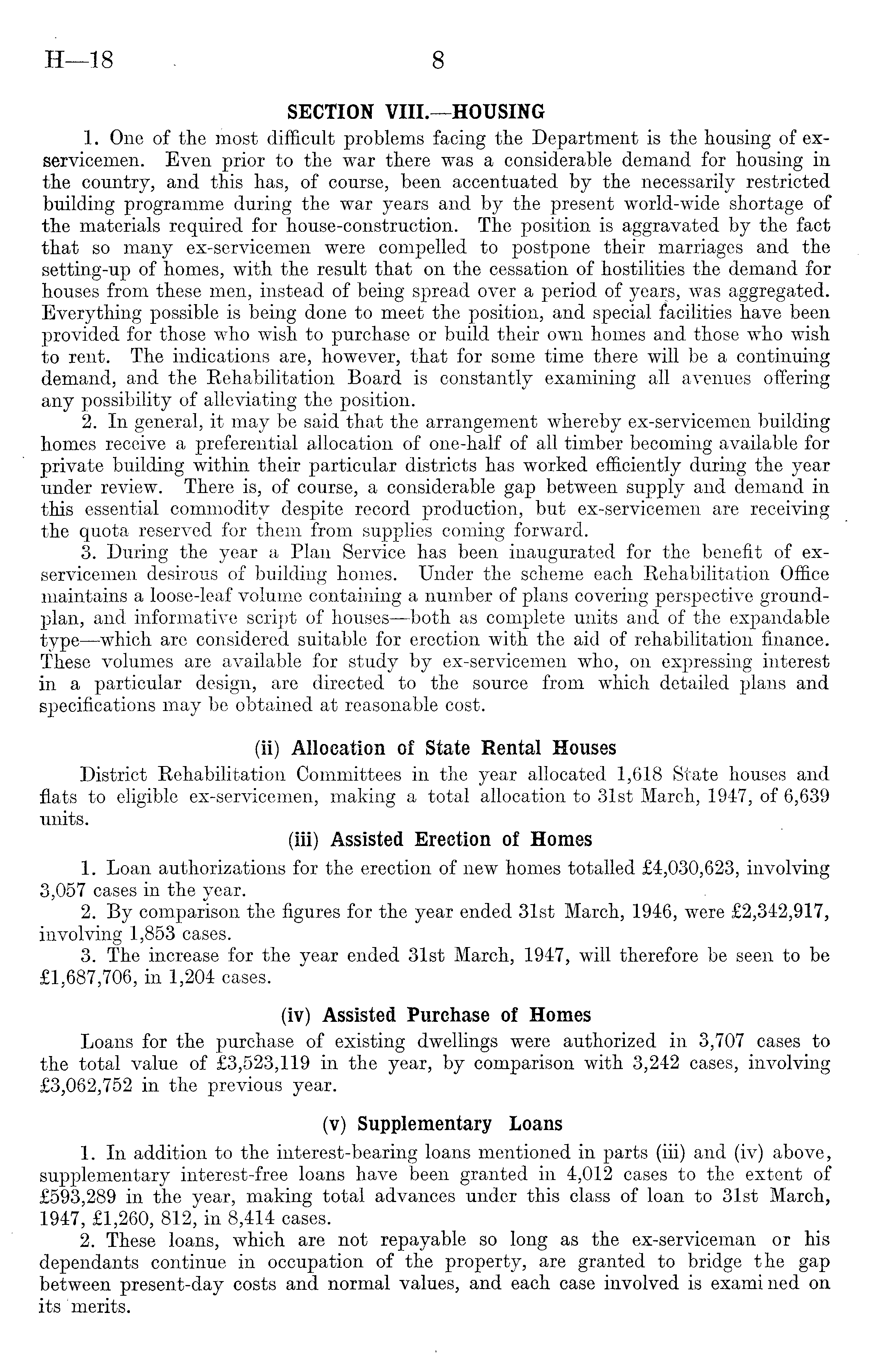 SECTION VIII.—HOUSING 1. One of the most difficult problems facing tlie Department is tlie housing of exservicemen. Even prior to the war there was a considerable demand for housing in the country, and this has, of course, been accentuated by the necessarily restricted building programme during the war years and by the present world-wide shortage of the materials required for house-construction. The position is aggravated by the fact that so many ex-servicemen were compelled to postpone their marriages and the setting-up of homes, with the result that on the cessation of hostilities the demand for houses from these men, instead of being spread over a period of years, was aggregated. Everything possible is being done to meet the position, and special facilities have been provided for those who wish to purchase or build their own homes and those who wish to rent. The indications are, however, that for some time there will be a continuing demand, and the Rehabilitation Board is constantly examining all avenues offering any possibility of alleviating the position. 2. In general, it may be said that the arrangement whereby ex-servicemen building homes receive a preferential allocation of one-half of all timber becoming available for private building within their particular districts has worked efficiently during the year under review. There is, of course, a considerable gap between supply and demand in this essential commodity despite record production, but ex-servicemen are receiving the quota reserved for them from supplies coming forward. 3. During the year a Plan Service has been inaugurated for the benefit of exservicemen desirous of building homes. Under the scheme each Rehabilitation Office maintains a loose-leaf volume containing a number of plans covering perspective groundplan, and informative script of houses—both as complete units and of the expandable type —which are considered suitable for erection with the aid of rehabilitation finance. These volumes are available for study by ex-servicemen who, on expressing interest in a particular design, are directed to the source from which detailed plans and specifications may be obtained at reasonable cost. (ii) Allocation of State Rental Houses District Rehabilitation Committees in the year allocated 1,618 State houses and flats to eligible ex-servicemen, making a total allocation to 31st March, 1947, of 6,639 units. (iii) Assisted Erection of Homes 1. Loan authorizations for the erection of new homes totalled £4,030,623, involving 3,057 cases in the year. 2. By comparison the figures for the year ended 31st March, 1946, were £2,342,917, involving 1,853 cases. 3. The increase for the year ended 31st March, 1947, will therefore be seen to be £1,687,706, in 1,204 cases. (iv) Assisted Purchase of Homes Loans for the purchase of existing dwellings were authorized in 3,707 cases to the total value of £3,523,119 in the year, by comparison with 3,242 cases, involving £3,062,752 in the previous year. (v) Supplementary Loans 1. In addition to the interest-bearing loans mentioned in parts (iii) and (iv) above, supplementary interest-free loans have been granted in 4,012 cases to the extent of £593,289 in the year, making total advances under this class of loan to 31st March, 1947, £1,260, 812, in 8,414 cases. 2. These loans, which are not repayable so long as the ex-serviceman or his dependants continue in occupation of the property, are granted to bridge the gap between present-day costs and normal values, and each case involved is examined on its merits.