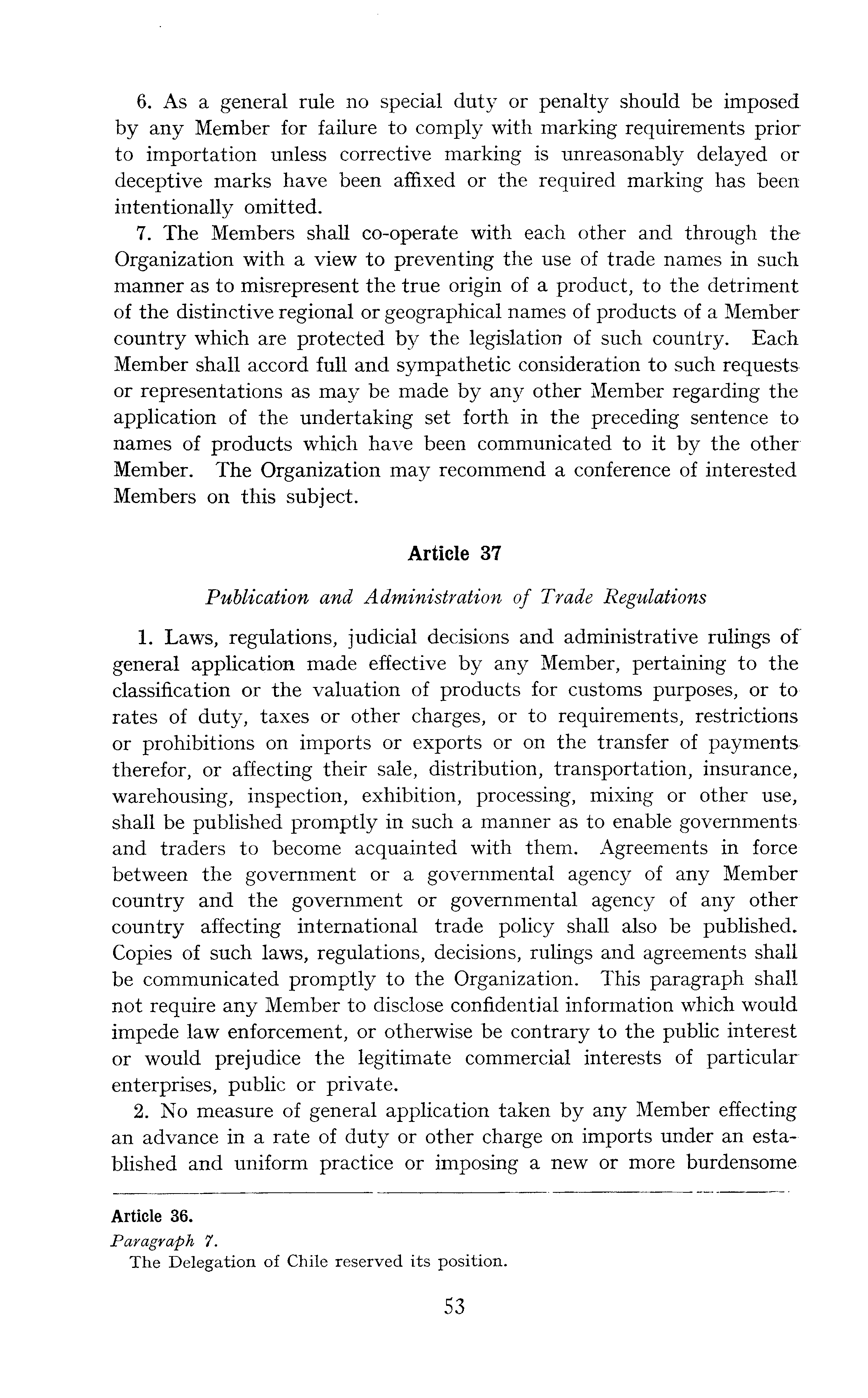 6. As a general rule no special duty or penalty should be imposed by any Member for failure to comply with marking requirements prior to importation unless corrective marking is unreasonably delayed or deceptive marks have been affixed or the required marking has been intentionally omitted. 7. The Members shall co-operate with each other and through the Organization with a view to preventing the use of trade names in such manner as to misrepresent the true origin of a product, to the detriment of the distinctive regional or geographical names of products of a Member country which are protected by the legislation of such country. Each Member shall accord full and sympathetic consideration to such requests or representations as may be made by any other Member regarding the application of the undertaking set forth in the preceding sentence to names of products which have been communicated to it by the other Member. The Organization may recommend a conference of interested Members on this subject. Article 37 Publication and Administration of Trade Regulations 1. Laws, regulations, judicial decisions and administrative rulings of general application made effective by any Member, pertaining to the classification or the valuation of products for customs purposes, or to rates of duty, taxes or other charges, or to requirements, restrictions or prohibitions on imports or exports or on the transfer of payments therefor, or affecting their sale, distribution, transportation, insurance, warehousing, inspection, exhibition, processing, mixing or other use, shall be published promptly in such a manner as to enable governments and traders to become acquainted with them. Agreements in force between the government or a governmental agency of any Member country and the government or governmental agency of any other country affecting international trade policy shall also be published. Copies of such laws, regulations, decisions, rulings and agreements shall be communicated promptly to the Organization. This paragraph shall not require any Member to disclose confidential information which would impede law enforcement, or otherwise be contrary to the public interest or would prejudice the legitimate commercial interests of particular enterprises, public or private. 2. No measure of general application taken by any Member effecting an advance in a rate of duty or other charge on imports under an established and uniform practice or imposing a new or more burdensome