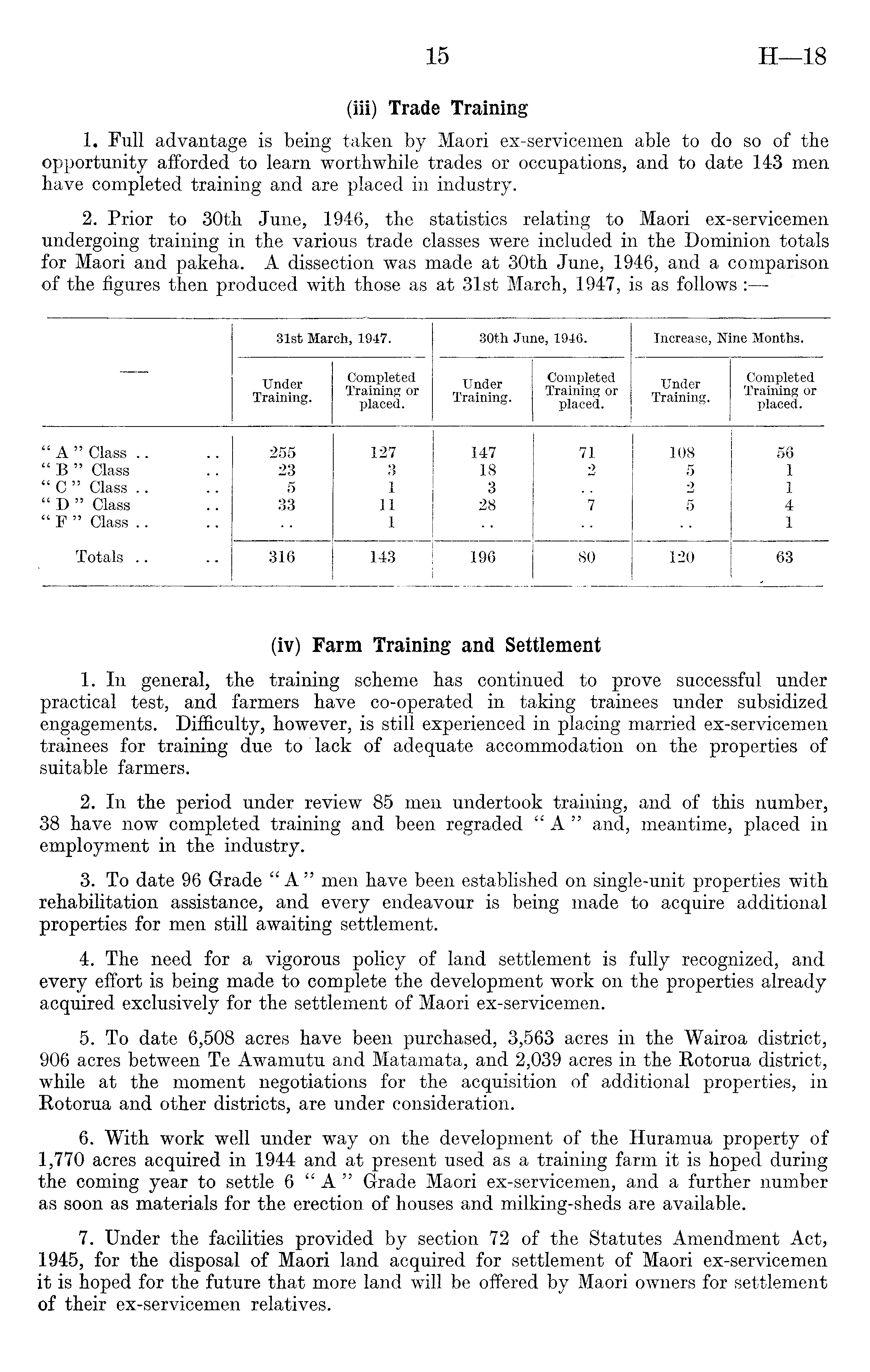 (iii) Trade Training 1. Full advantage is being taken by Maori ex-servicemen able to do so of the opportunity afforded to learn worthwhile trades or occupations, and to date 143 men have completed training and are placed in industry. 2. Prior to 30th June, 1946, the statistics relating to Maori ex-servicemen undergoing training in the various trade classes were included in the Dominion totals for Maori and pakeha. A dissection was made at 30th June, 1946, and a comparison of the figures then produced with those as at 31st March, 1947, is as follows :