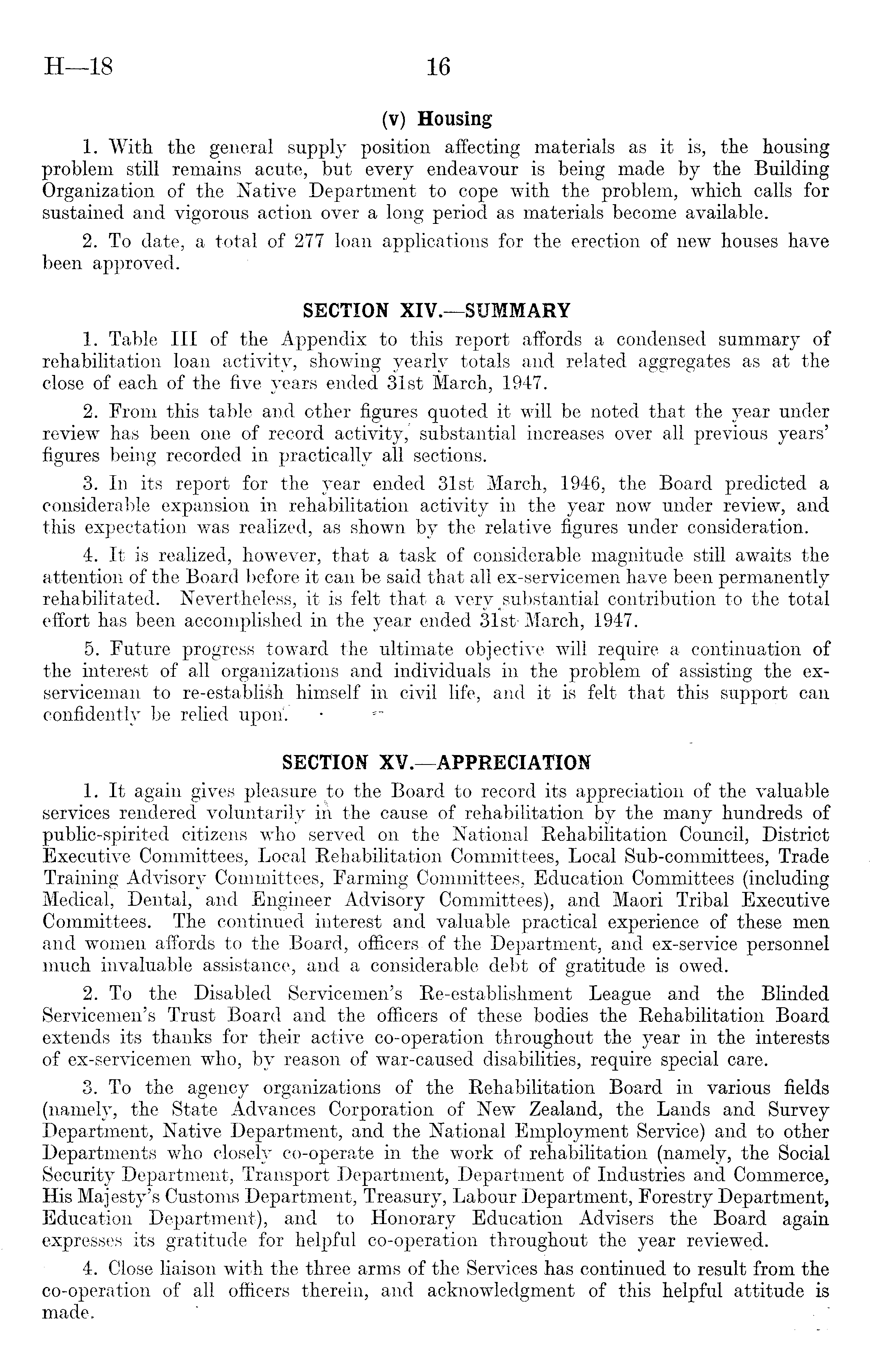 (v) Housing 1. With the general supply position affecting materials as it is, the housing problem still remains acute, but every endeavour is being made by the Building Organization of the Native Department to cope with the problem, which calls for sustained and vigorous action over a long period as materials become available. 2. To date, a total of 277 loan applications for the erection of new houses have been approved. SECTION XIV.—SUMMARY 1. Table 111 of the Appendix to this report affords a condensed summary of rehabilitation loan activity, showing yearly totals and related aggregates as at the close of each of the five years ended 31st March, 1947. 2. From this table and other figures quoted it will be noted that the year under review has been one of record activity,' substantial increases over all previous years' figures being recorded in practically all sections. 3. In its report for the year ended 31st March, 1946, the Board predicted a considerable expansion in rehabilitation activity in the year now under review, and this expectation was realized, as shown by the relative figures under consideration. 4. It is realized, however, that a task of considerable magnitude still awaits the attention of the Board before it can be said that all ex-servicemen have been permanently rehabilitated. Nevertheless, it is felt that a very substantial contribution to the total effort has been accomplished in the year ended 31sfr March, 1947. 5. Future progress toward the ultimate objective will require a continuation of the interest of all organizations and individuals in the problem of assisting the exserviceman to re-establi&h himself in civil life, and it is felt that this support can confidently be relied upon. SECTION XV.—APPRECIATION 1. It again gives pleasure to the Board to record its appreciation of the valuable services rendered voluntarily in the cause of rehabilitation by the many hundreds of public-spirited citizens who served on the National Rehabilitation Council, District Executive Committees, Local Rehabilitation Committees, Local Sub-committees, Trade Training Advisory Committees, Farming Committees, Education Committees (including Medical, Dental, and Engineer Advisory Committees), and Maori Tribal Executive Committees. The continued interest and valuable practical experience of these men and women affords to the Board, officers, of the Department, and ex-service personnel much invaluable assistance, and a considerable debt of gratitude is owed. 2. To the Disabled Servicemen's Re-establishment League and the Blinded Servicemen's Trust Board and the officers of these bodies the Rehabilitation Board extends its thanks for their active co-operation throughout the year in the interests of ex-servicemen who, by reason of war-caused disabilities, require special care. 3. To the agency organizations of the Rehabilitation Board in various fields (namely, the State Advances Corporation of New Zealand, the Lands and Survey Department, Native Department, and the National Employment Service) and to other Departments who closely co-operate in the work of rehabilitation (namely, the Social Security Department, Transport Department, Department of Industries and Commerce, His Majesty's Customs Department, Treasury, Labour Department, Forestry Department, Education Department), and to Honorary Education Advisers the Board again expresses its gratitude for helpful co-operation throughout the year reviewed. 4. Close liaison with the three arms of the Services has continued to result from the co-operation of all officers, therein, and acknowledgment of this helpful attitude is made. "