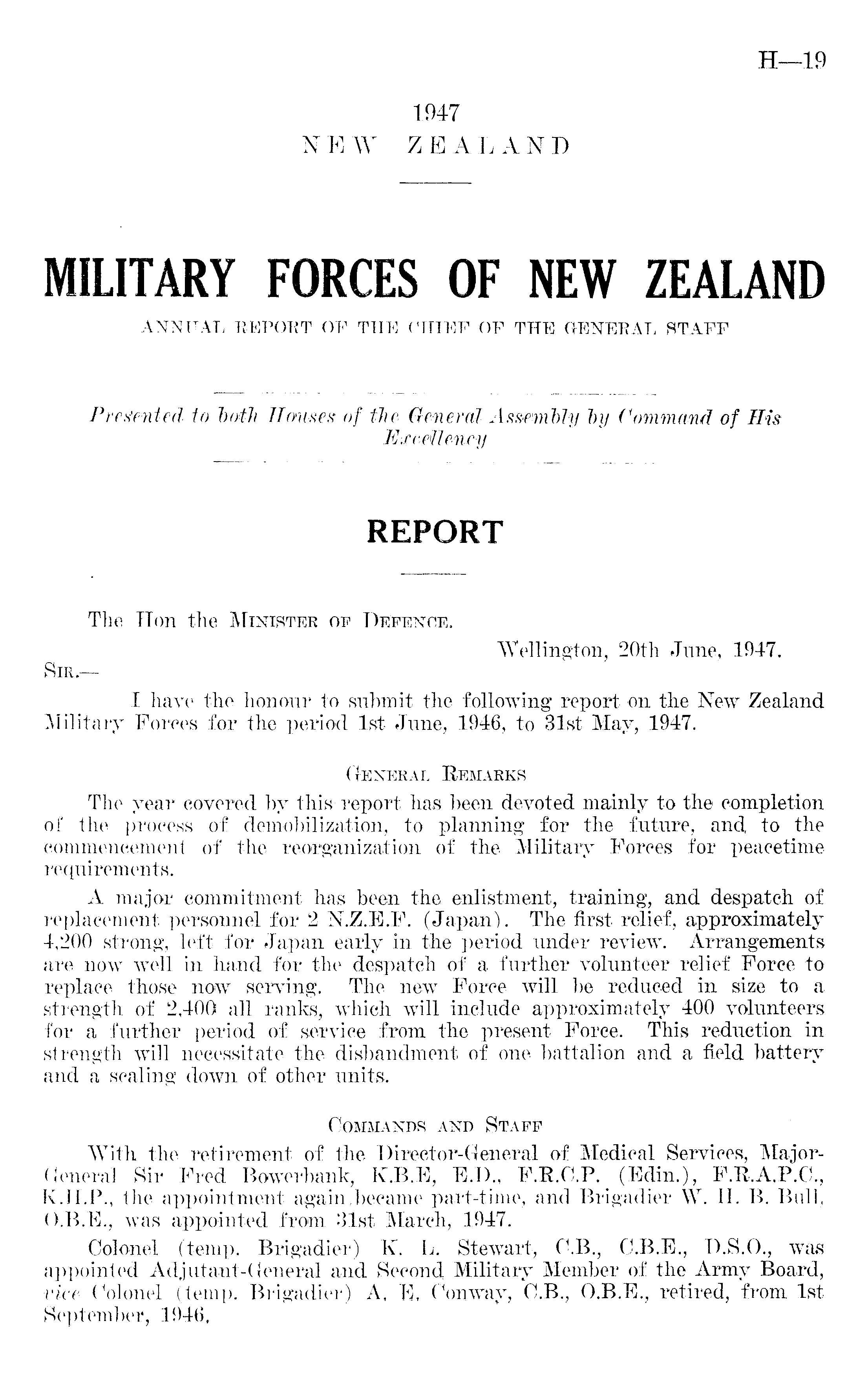 REPORT The Hon the Minister of Defence, Wellington, 20th June, 1947. SIRI have the honour to submit the following report on the New Zealand Military Forces for the period Ist June, 1946, to 31st May, 1947. General Remarks The year covered by this report has been devoted mainly to the completion of the process of demobilization, to planning for the future, and to the commencement of the reorganization of the Military Forces for peacetime requirements. A major commitment has been the enlistment, training, and despatch of replacement personnel for 2 N.Z.E.F. (Japan). The first relief, approximately 4,200 strong, left for Japan early in the period under review. Arrangements are now well in hand for the despatch of a further volunteer relief Force to replace those now serving. The new Force will be reduced in size to a strength of 2,400 all ranks, which will include approximately 400 volunteers for a further period of service from the present Force. This reduction in strength will necessitate the disbandment of one battalion and a field battery and a scaling down of other units. Commands and Staff With the retirement of the Director-General of Medical Services, MajorGeneral Sir Fred Bowerbank, K.B.E, E.D., F.R.C.P. (Edin.), F.R.A.P.C., K.H.P., the appointment again. became part-time, and Brigadier W. 11. B. Bull, 0.8. E., was appointed from 31st March, 1947. Colonel (temp. Brigadier) K. L. Stewart, C.8., C.8.E., D.5.0., was appointed Adjutant-General and Second Military Member of the Army Board, vice Colonel (temp. Brigadier) A. E, Conway, C.8., 0.8. E., retired, from Ist September, 1946.
