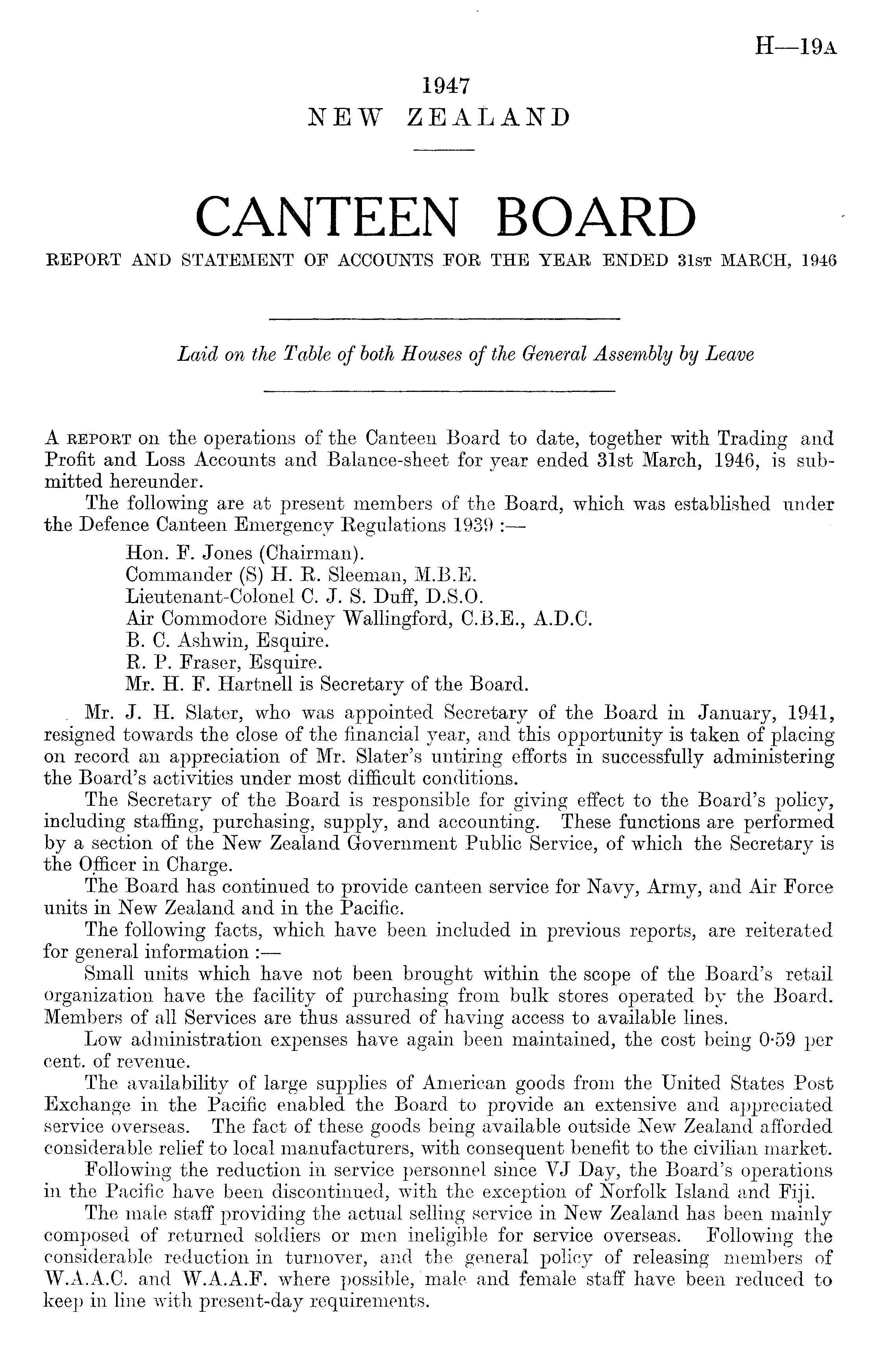 A report on the operations of the Canteen Board to date, together with Trading and Profit and Loss Accounts and Balance-sheet for year ended 31st March, 1946, is submitted hereunder. The following are at present members of the Board, which was established under the Defence Canteen Emergency Kegulations 1939 : Hon. F. Jones (Chairman). Commander (S) H. R. Sleeman, M.B.E. Lieutenant-Colonel C. J. S. Duff, D.S.O. Air Commodore Sidney Wallingford, C.8.E., A.D.C. B. C. Ashwin, Esquire. R. P. Eraser, Esquire. Mr. H. F. Hartnell is Secretary of the Board. . Mr. J. H. Slater, who was appointed Secretary of the Board in January, 1941, resigned towards the close of the financial year, and this opportunity is taken of placing on record an appreciation of Mr. Slater's untiring efforts in successfully administering the Board's activities under most difficult conditions. The Secretary of the Board is responsible for giving effect to the Board's policy, including staffing, purchasing, supply, and accounting. These functions are performed by a section of the New Zealand Government Public Service, of which the Secretary is the Officer in Charge. The Board has continued to provide canteen service for Navy, Army, and Air Force units in New Zealand and in the Pacific. The following facts, which have been included in previous reports, are reiterated for general information : Small units which have not been brought within the scope of the Board's retail organization have the facility of purchasing from bulk stores operated by the Board. Members of all Services are thus assured of having access to available lines. Low administration expenses have again been maintained, the cost being 0-59 per cent, of revenue. The availability of large supplies of American goods from the United States Post Exchange in the Pacific enabled the Board to provide an extensive and appreciated service overseas. The fact of these goods being available outside New Zealand afforded considerable relief to local manufacturers, with consequent benefit to the civilian market. Following the reduction in service personnel since VJ Day, the Board's operations in the Pacific have been discontinued, with the exception of Norfolk Island and Fiji. The male staff providing the actual selling service in New Zealand has been mainly composed of returned soldiers or men ineligible for service overseas. Following the considerable reduction in turnover, and the general policy of releasing members of W.AA.C. and W.A.A.F. where possible,' male and female staff have been reduced to keep in line with present-day requirements.