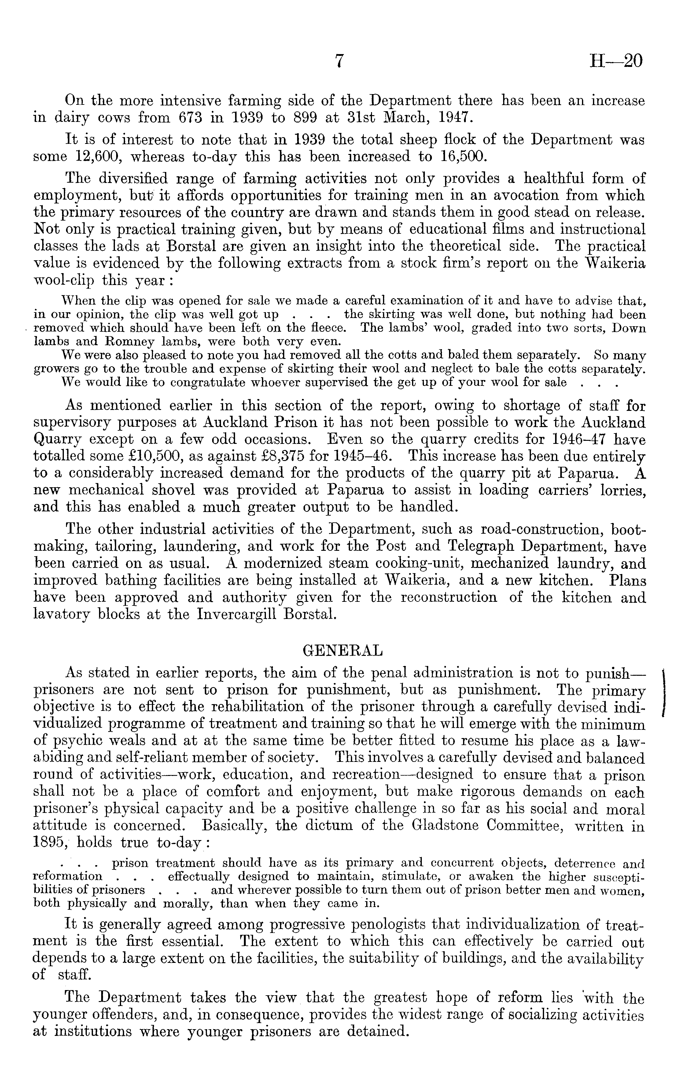 On the more intensive farming side of the Department there has been an increase in dairy cows from 673 in 1939 to 899 at 31st March, 1947. It is of interest to note that in 1939 the total sheep flock of the Department was some 12,600, whereas to-day this has been increased to 16,500. The diversified range of farming activities not only provides a healthful form of employment, but? it affords opportunities for training men in an avocation from which the primary resources of the country are drawn and stands them in good stead on release. Not only is practical training given, but by means of educational films and instructional classes the lads at Borstal are given an insight into the theoretical side. The practical value is evidenced by the following extracts from a stock firm's report on the Waikeria wool-clip this year: When the clip was opened for sale we made a careful examination of it and hare to advise that, in our opinion, the clip was well got up . . . the skirting was well done, but nothing had been removed which should have been left on the fleece. The lambs' wool, graded into two sorts, Down lambs and Romney lambs, were both very even. We were also pleased to note you had removed all the cotts and baled them separately. So many growers go to the trouble and expense of skirting their wool and neglect to bale the cotts separately. We would like to congratulate whoever supervised the get up of your wool for sale . . . As mentioned earlier in this section of the report, owing to shortage of staff for supervisory purposes at Auckland Prison it has not been possible to work the Auckland Quarry except on a few odd occasions. Even so the quarry credits for 1946-47 have totalled some £10,500, as against £8,375 for 1945-46. This increase has been due entirely to a considerably increased demand for the products of the quarry pit at Paparua. A new mechanical shovel was provided at Paparua to assist in loading carriers' lorries, and this has enabled a much greater output to be handled. The other industrial activities of the Department, such as road-construction, bootmaking, tailoring, laundering, and work for the Post and Telegraph Department, have been carried on as usual. A modernized steam cooking-unit, mechanized laundry, and improved bathing facilities are being installed at Waikeria, and a new kitchen. Plans have been approved and authority given for the reconstruction of the kitchen and lavatory blocks at the Invercargill Borstal. GENERAL As stated in earlier reports, the aim of the penal administration is not to punish—prisoners are not sent to prison for punishment, but as punishment. The primary objective is to effect the rehabilitation of the prisoner through a carefully devised individualized programme of treatment and training so that he will emerge with the minimum of psychic weals and at at the same time be better fitted to resume his place as a lawabiding and self-reliant member of society. This involves a carefully devised and balanced round of activities —work, education, and recreation —designed to ensure that a prison shall not be a place of comfort and enjoyment, but make rigorous demands on each prisoner's physical capacity and be a positive challenge in so far as his social and moral attitude is concerned. Basically, the dictum of the Gladstone Committee, written in 1895, holds true to-day: . . . prison treatment should have as its primary and concurrent objects, deterrence and reformation . . . effectually designed to maintain, stimulate, or awaken the higher susceptibilities of prisoners ... and wherever possible to turn them out of prison better men and women, both physically and morally, than when they came in. It is generally agreed among progressive penologists that individualization of treatment is the first essential. The extent to which this can effectively be carried out depends to a large extent on the facilities, the suitability of buildings, and the availability of staff. The Department takes the view that the greatest hope of reform lies with the younger offenders, and, in consequence, provides the widest range of socializing activities at institutions where younger prisoners are detained.