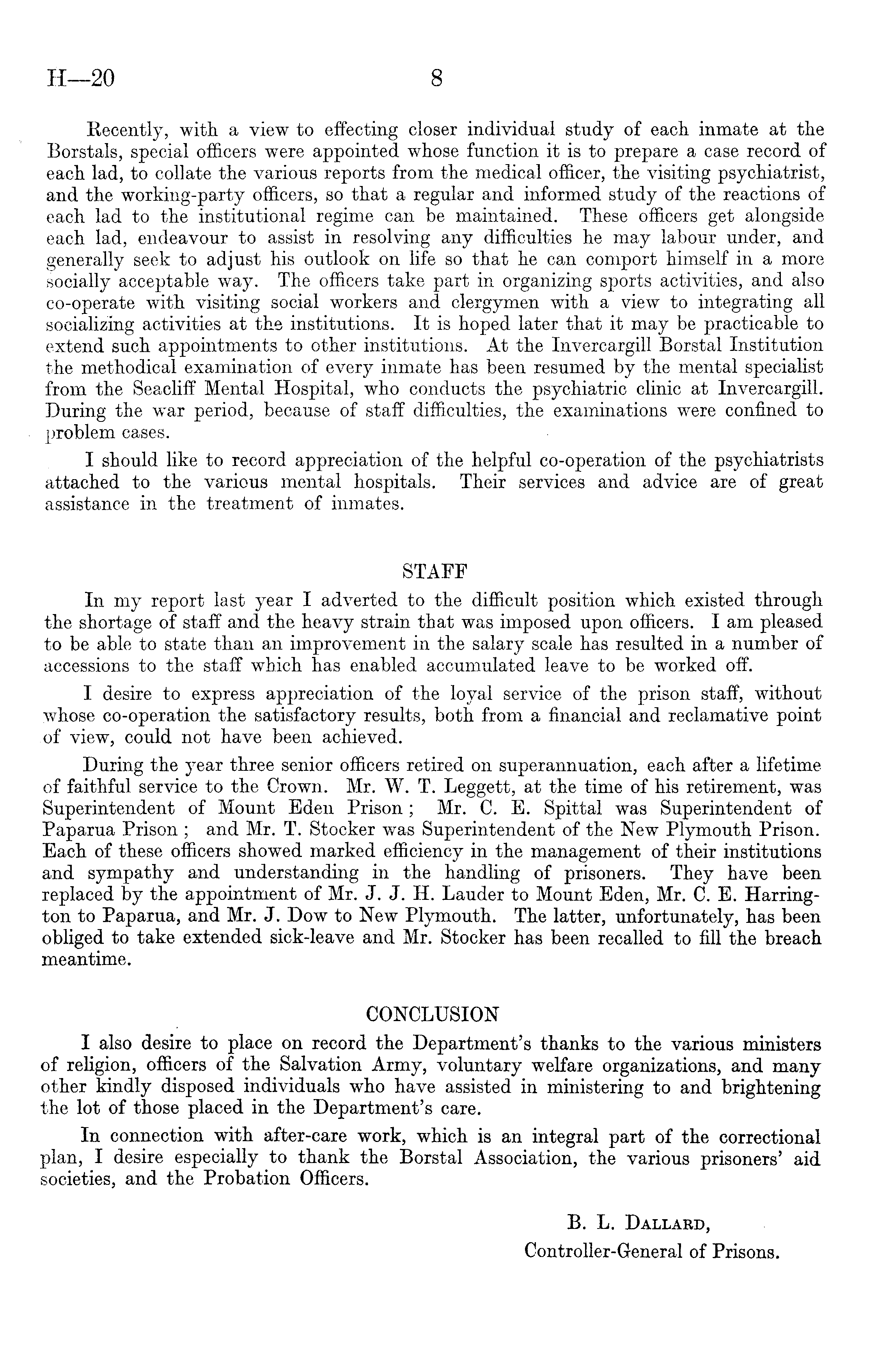 Kecently, with a view to effecting closer individual study of each inmate at the Borstals, special officers were appointed whose function it is to prepare a case record of each lad, to collate the various reports from the medical officer, the visiting psychiatrist, and the working-party officers, so that a regular and informed study of the reactions of each lad to the institutional regime can be maintained. These officers get alongside each lad, endeavour to assist in resolving any difficulties he may labour under, and generally seek to adjust his outlook on life so that he can comport himself in a more socially acceptable way. The officers take part in organizing sports activities, and also co-operate with visiting social workers and clergymen with a view to integrating all socializing activities at the institutions. It is hoped later that it may be practicable to extend such appointments to other institutions. At the Invercargill Borstal Institution the methodical examination of every inmate has been resumed by the mental specialist from the Seacliff Mental Hospital, who conducts the psychiatric clinic at Invercargill. During the war period, because of staff difficulties, the examinations were confined to problem cases. I should like to record appreciation of the helpful co-operation of the psychiatrists attached to the various mental hospitals. Their services and advice are of great assistance in the treatment of inmates. STAFF In my report last year I adverted to the difficult position which existed through the shortage of staff and the heavy strain that was imposed upon officers. lam pleased to be able to state than an improvement in the salary scale has resulted in a number of accessions to the staff which has enabled accumulated leave to be worked off. I desire to express appreciation of the loyal service of the prison staff, without whose co-operation the satisfactory results, both from a financial and reclamative point of view, could not have been achieved. During the year three senior officers retired on superannuation, each after a lifetime of faithful service to the Crown. Mr. W. T. Leggett, at the time of his retirement, was Superintendent of Mount Eden Prison; Mr. C. E. Spittal was Superintendent of Paparua Prison ; and Mr. T. Stocker was Superintendent of the New Plymouth Prison. Each of these officers showed marked efficiency in the management of their institutions and sympathy and understanding in the handling of prisoners. They have been replaced by the appointment of Mr. J. J. H. Lauder to Mount Eden, Mr. C. E. Harrington to Paparua, and Mr. J. Dow to New Plymouth. The latter, unfortunately, has been obliged to take extended sick-leave and Mr. Stocker has been recalled to fill the breach meantime. CONCLUSION I also desire to place on record the Department's thanks to the various ministers of religion, officers of the Salvation Army, voluntary welfare organizations, and many other kindly disposed individuals who have assisted in ministering to and brightening the lot of those placed in the Department's care. In connection with after-care work, which is an integral part of the correctional plan, I desire especially to thank the Borstal Association, the various prisoners' aid societies, and the Probation Officers. B. L. Dallard, Controller-General of Prisons.