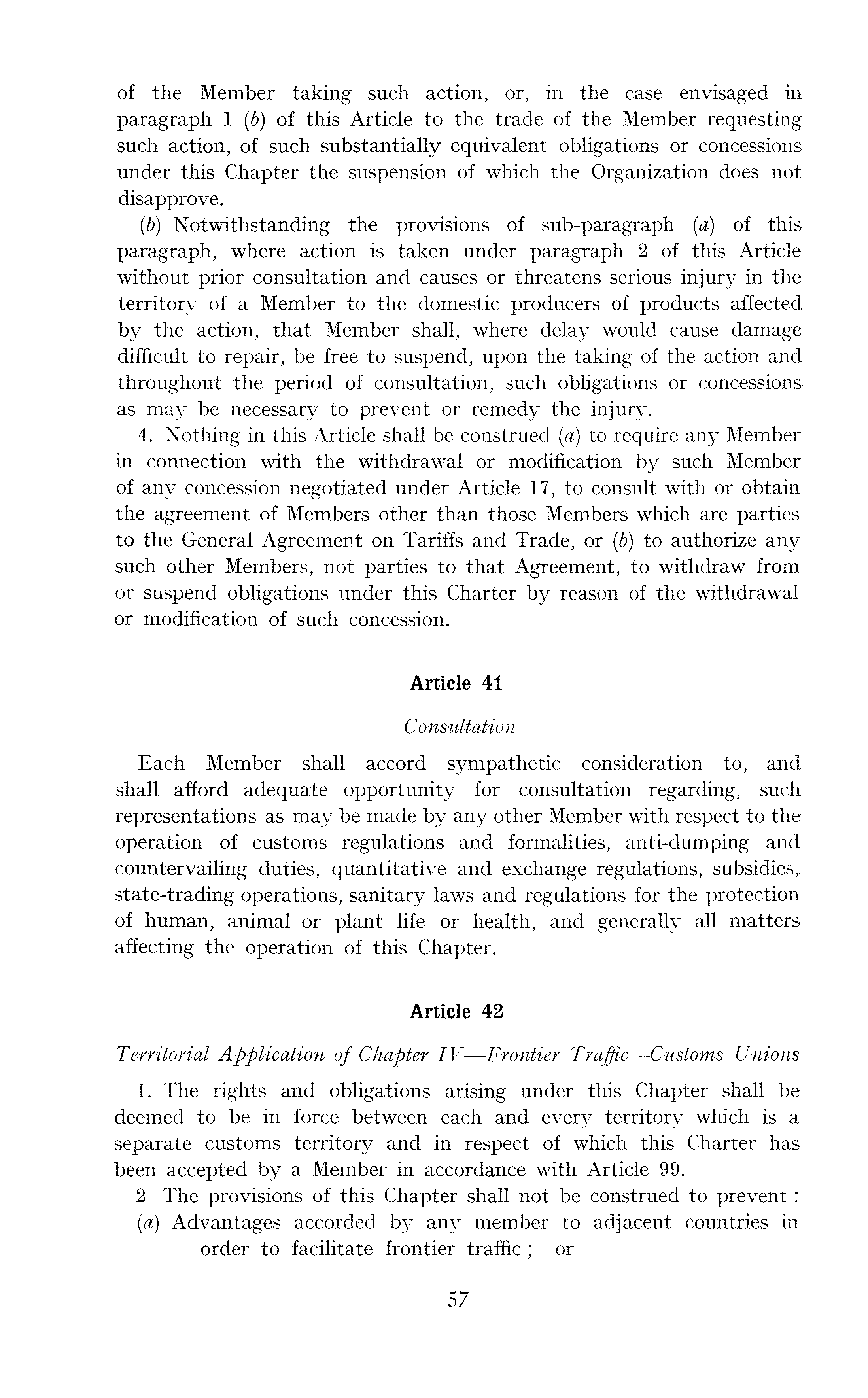 of the Member taking such action, or, in the case envisaged in paragraph 1 (b) of this Article to the trade of the Member requesting such action, of such substantially equivalent obligations or concessions under this Chapter the suspension of which the Organization does not disapprove. (b) Notwithstanding the provisions of sub-paragraph (a) of this paragraph, where action is taken under paragraph 2 of this Article without prior consultation and causes or threatens serious injury in the territory of a Member to the domestic producers of products affected by the action, that Member shall, where delay would cause damage difficult to repair, be free to suspend, upon the taking of the action and throughout the period of consultation, such obligations or concessionsas may be necessary to prevent or remedy the injury. 4. Nothing in this Article shall be construed (a) to require any Member in connection with the withdrawal or modification by such Member of any concession negotiated under Article 17, to consult with or obtain the agreement of Members other than those Members which are parties to the General Agreement on Tariffs and Trade, or (b) to authorize any such other Members, not parties to that Agreement, to withdraw from or suspend obligations under this Charter by reason of the withdrawal or modification of such concession. Article 41 Consultation Each Member shall accord sympathetic consideration to, and shall afford adequate opportunity for consultation regarding, such representations as may be made by any other Member with respect to the operation of customs regulations and formalities, anti-dumping and countervailing duties, quantitative and exchange regulations, subsidies, state-trading operations, sanitary laws and regulations for the protection of human, animal or plant life or health, and generally all matters affecting the operation of this Chapter. Article 42 Territorial Application of Chapter IV —Frontier Traffic —Customs Unions 1. The rights and obligations arising under this Chapter shall be deemed to be in force between each and every territory which is a separate customs territory and in respect of which this Charter has been accepted by a Member in accordance with Article 99. 2 The provisions of this Chapter shall not be construed to prevent: (ia) Advantages accorded by any member to adjacent countries in order to facilitate frontier traffic; or