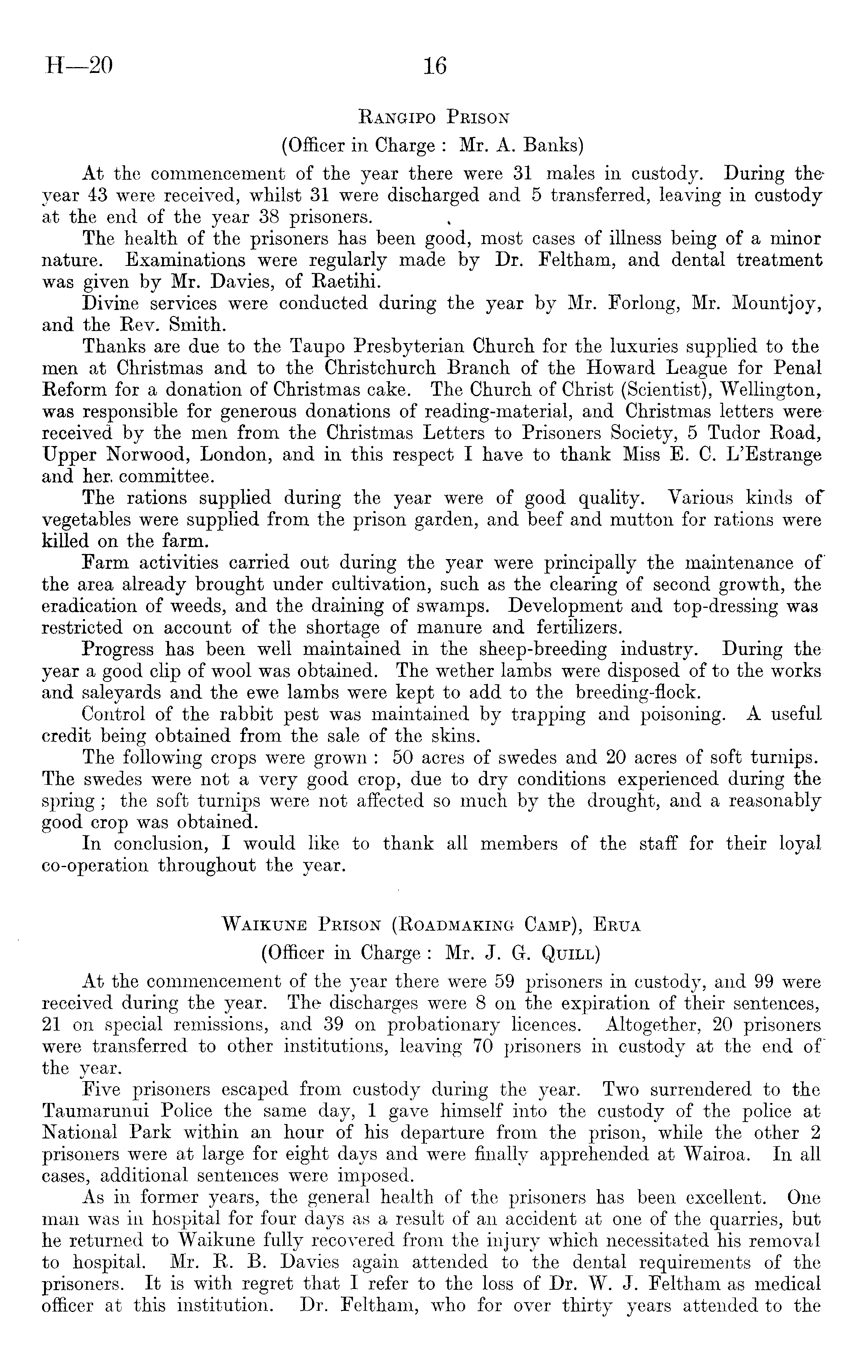 Rangipo Prison (Officer in Charge : Mr. A. Banks) At the commencement of the year there were 31 males in custody. During the year 43 were received, whilst 31 were discharged and 5 transferred, leaving in custody at the end of the year 38 prisoners. The health of the prisoners has been good, most cases of illness being of a minor nature. Examinations were regularly made by Dr. Feltham, and dental treatment was given by Mr. Davies, of Raetihi. Divine services were conducted during the year by Mr. Forlong, Mr. Mountjoy,, and the Rev. Smith. Thanks are due to the Taupo Presbyterian Church for the luxuries supplied to the men at Christmas and to the Christchurch Branch of the Howard League for Penal Reform for a donation of Christmas cake. The Church of Christ (Scientist), Wellington, was responsible for generous donations of reading-material, and Christmas letters were received by the men from the Christmas Letters to Prisoners Society, 5 Tudor Road, Upper Norwood, London, and in this respect I have to thank Miss E. C. L'Estrange and her, committee. The rations supplied during the year were of good quality. Various kinds of vegetables were supplied from the prison garden, and beef and mutton for rations were killed on the farm. Farm activities carried out during the year were principally the maintenance of the area already brought under cultivation, such as the clearing of second growth, the eradication of weeds, and the draining of swamps. Development and top-dressing was restricted on account of the shortage of manure and fertilizers. Progress has been well maintained in the sheep-breeding industry. During the year a good clip of wool was obtained. The wether lambs were disposed of to the works and saleyards and the ewe lambs were kept to add to the breeding-flock. Control of the rabbit pest was maintained by trapping and poisoning. A useful credit being obtained from the sale of the skins. The following crops were grown : 50 acres of swedes and 20 acres of soft turnips. The swedes were not a very good crop, due to dry conditions experienced during the spring; the soft turnips were not affected so much by the drought, and a reasonably good crop was obtained. In conclusion, I would like to thank all members of the staff for their loyal co-operation throughout the year. Waikune Prison (Roadmaking Camp), Erua (Officer in Charge : Mr. J. G. Quill) At the commencement of the year there were 59 prisoners in custody, and 99 were received during the year. The discharges were 8 on the expiration of their sentences, 21 on special remissions, and 39 on probationary licences. Altogether, 20 prisoners were transferred to other institutions, leaving 70 prisoners in custody at the end of the year. Five prisoners escaped from custody during the year. Two surrendered to the Taumarunui Police the same day, 1 gave himself into the custody of the police at National Park within an hour of his departure from the prison, while the other 2 prisoners were at large for eight days and were finally apprehended at Wairoa. In all cases, additional sentences were imposed. As in former years, the general health of the prisoners has been excellent. One man was in hospital for four days as a result of an accident at one of the quarries, but he returned to Waikune fully recovered from the injury which necessitated his removal to hospital. Mr. R. B. Davies again attended to the dental requirements of the prisoners. It is with regret that I refer to the loss of Dr. W. J. Feltham as medical officer at this institution. Dr. Feltham, who for over thirty years attended to the