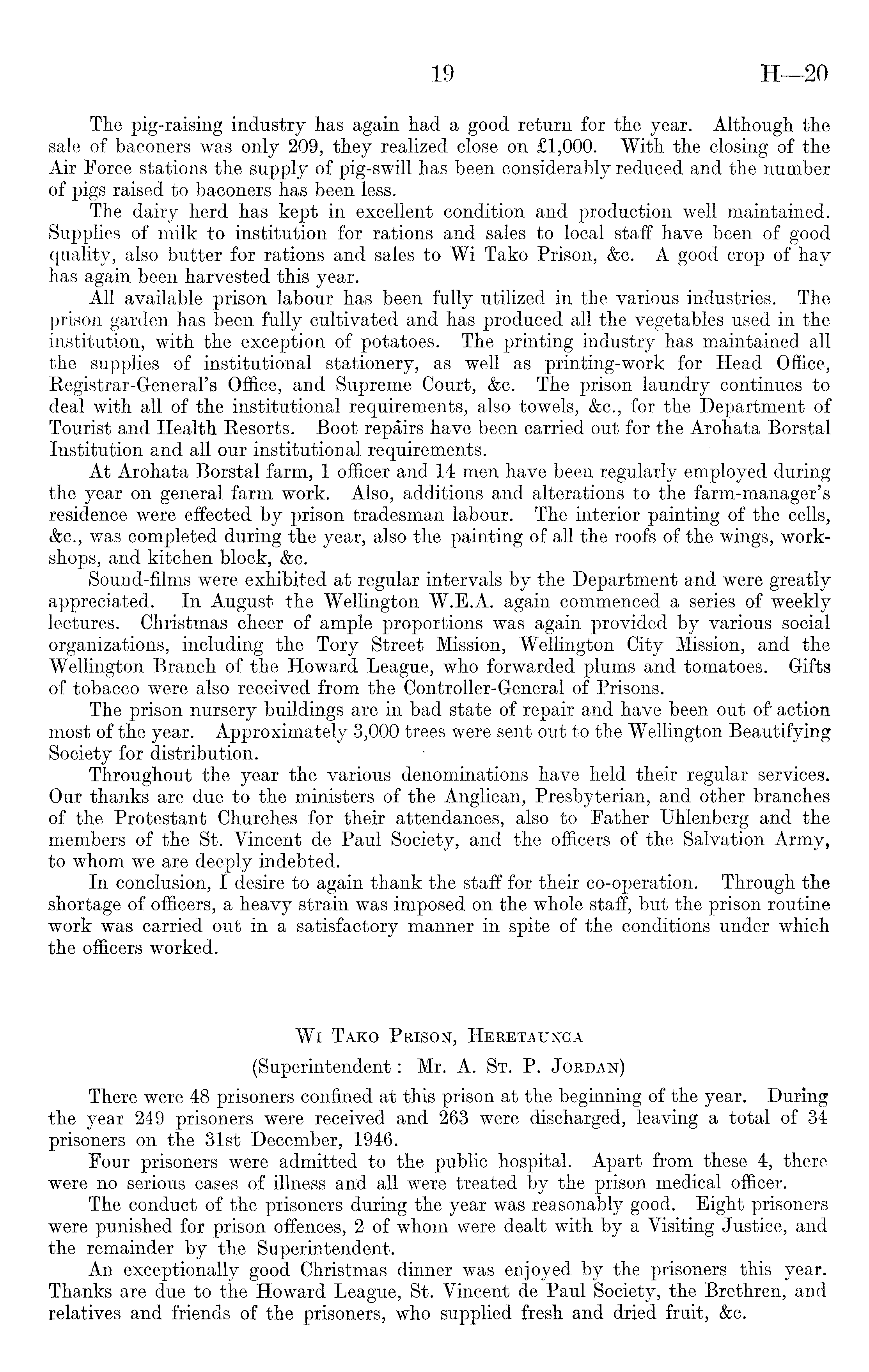 The pig-raising industry has again had a good return for the year. Although the sale of baconers was only 209, they realized close on £l,OOO. With the closing of the Air Force stations the supply of pig-swill has been considerably reduced and the number of pigs raised to baconers has been less. The dairy herd has kept in excellent condition and production well maintained. Supplies of milk to institution for rations and sales to local staff have been of good quality, also butter for rations and sales to Wi Tako Prison, &c. A good crop of hay has again been harvested this year. All available prison labour has been fully utilized in the various industries. The prison garden has been fully cultivated and has produced all the vegetables used in the institution, with the exception of potatoes. The printing industry has maintained all the supplies of institutional stationery, as well as printing-work for Head Office, Registrar-General's Office, and Supreme Court, &c. The prison laundry continues to deal with all of the institutional requirements, also towels, &c., for the Department of Tourist and Health Resorts. Boot repairs have been carried out for the Arohata Borstal Institution and all our institutional requirements. At Arohata Borstal farm, 1 officer and 14 men have been regularly employed during the year on general farm work. Also, additions and alterations to the farm-manager's residence were effected by prison tradesman labour. The interior painting of the cells, &c., was completed during the year, also the painting of all the roofs of the wings, workshops, and kitchen block, &c. Sound-films were exhibited at regular intervals by the Department and were greatly appreciated. In August the Wellington W.E.A. again commenced a series of weekly lectures. Christmas cheer of ample proportions was again provided by various social organizations, including the Tory Street Mission, Wellington City Mission, and the Wellington Branch, of the Howard League, who forwarded plums and tomatoes. Gifts of tobacco were also received from the Controller-General of Prisons. The prison nursery buildings are in bad state of repair and have been out of action most of the year. Approximately 3,000 trees were sent out to the Wellington Beautifying Society for distribution. Throughout the year the various denominations have held their regular services. Our thanks are due to the ministers of the Anglican, Presbyterian, and other branches of the Protestant Churches for their attendances, also to Father Uhlenberg and the members of the St. Vincent de Paul Society, and the officers of the Salvation Army, to whom we are deeply indebted. In conclusion, I desire to again thank the staff for their co-operation. Through the shortage of officers, a heavy strain was imposed on the whole staff, but the prison routine work was carried out in a satisfactory manner in spite of the conditions under which the officers worked. Wi Tako Prison, Hereto unga (Superintendent: Mr. A. St. P. Jordan) There were 48 prisoners confined at this prison at the beginning of the year. During the year 249 prisoners were received and 263 were discharged, leaving a total of 34 prisoners on the 31st December, 1946. Four prisoners were admitted to the public hospital. Apart from these 4, there were no serious cases of illness and all were treated by the prison medical officer. The conduct of the prisoners during the year was reasonably good. Eight prisoners were punished for prison offences, 2 of whom were dealt with by a Visiting Justice, and the remainder by the Superintendent. An exceptionally good Christmas dinner was enjoyed by the prisoners this year. Thanks are due to the Howard League, St. Vincent de Paul Society, the Brethren, and relatives and friends of the prisoners, who supplied fresh and dried fruit, &c.