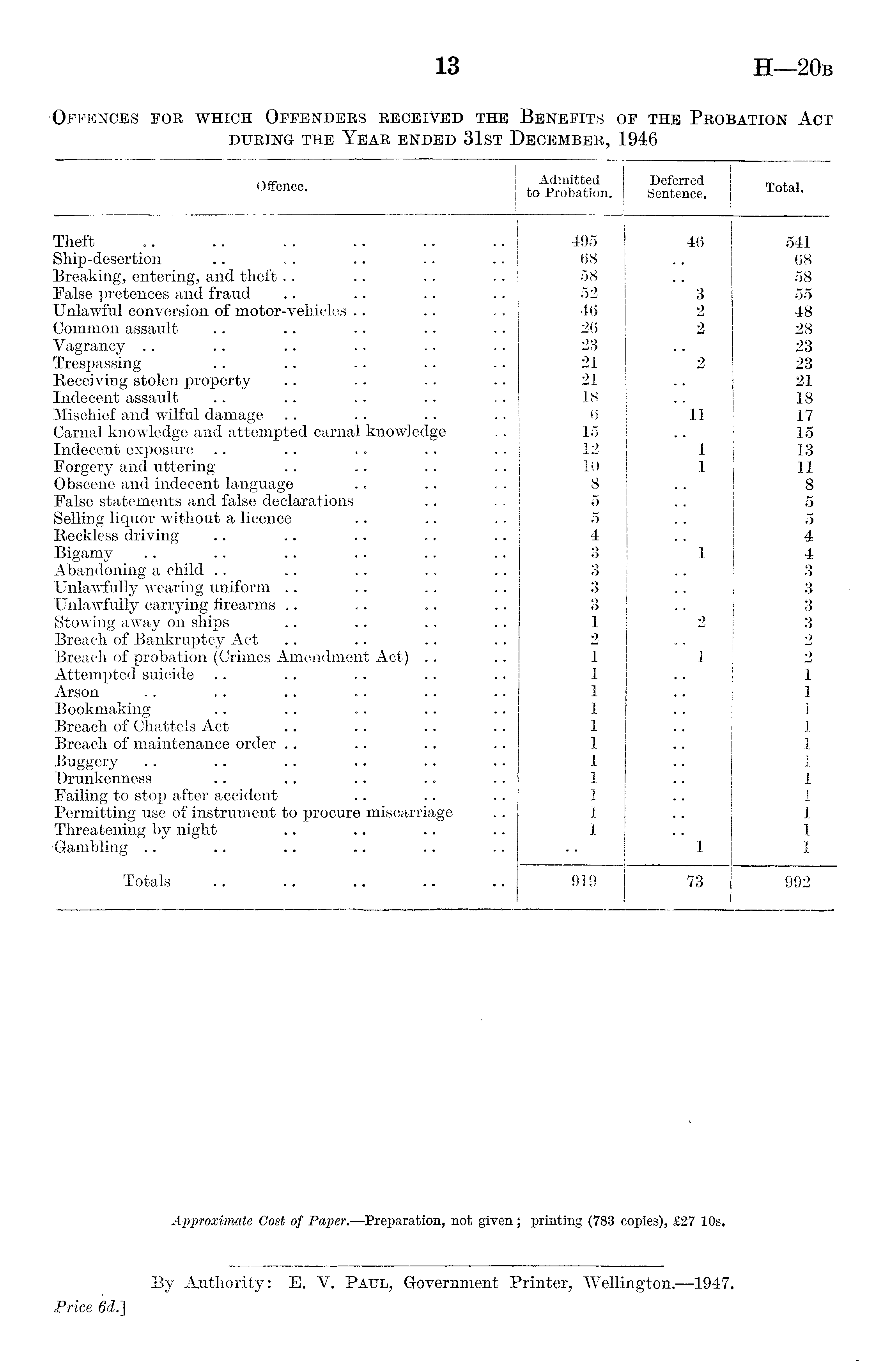 Offence. Admitted to Probation. Deferred Sentence. Total. Theft 495 46 541 Ship-desertion 68 68 Breaking, entering, and theft 58 58 False pretences and fraud 52 " 3 55 Unlawful conversion of motor-vehicles 46 2 48 Common assault 26 2 28 Vagrancy 23 23 Trespassing 21 2 23 Receiving stolen property 21 21 Indecent assault 18 18 Mischief and wilful damage 6 11 17 Carnal knowledge and attempted carnal knowledge 15 15 Indecent exposure 12 1 13 Forgery and uttering 10 1 11 Obscene and indecent language 8 8 False statements and false declarations 5 5 Selling liquor without a licence 5 5 Reckless driving .. .. 4 4 Bigamy 3 1 4 Abandoning a child 3 3 Unlawfully wearing uniform 3 Unlawfully carrying firearms 3 Stowing away on ships 1 2 3 Breach of Bankruptcy Act cy £ 2 Breach of probation (Crimes Amendment Act) l 1 2 Attempted suicide l 1 Arson 1 Bookmaking l I Breach of Chattels Act l 1 Breach of maintenance order l 1 Buggery l 1 Drunkenness l 1 Failing to stop after accident l 1 Permitting use of instrument to procure miscarriage 1 1 Threatening by night l 1 -Gambling 1 1 Totals 919 73 992