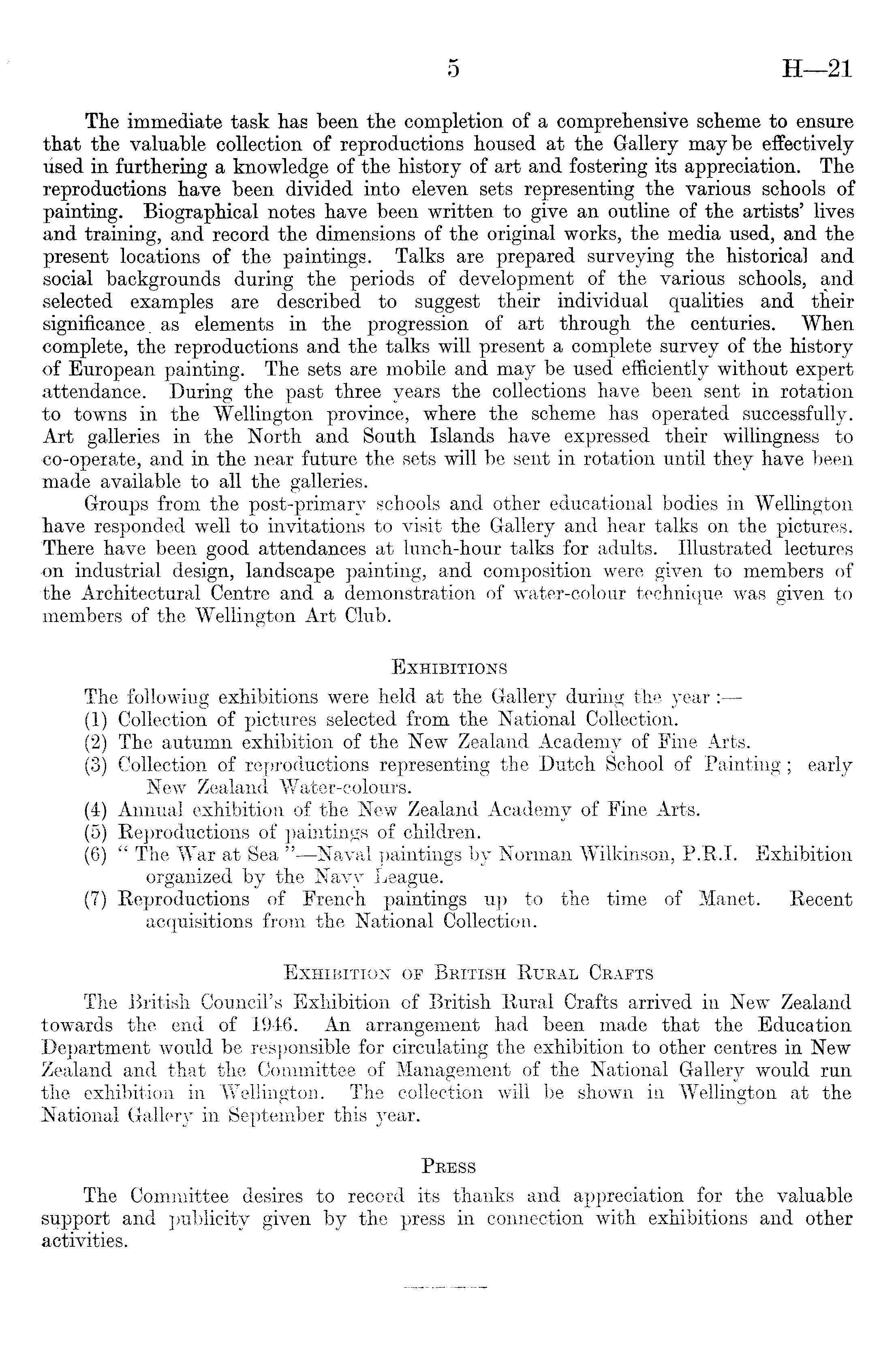 The immediate task has been the completion of a comprehensive scheme to ensure that the valuable collection of reproductions housed at the Gallery maybe effectively used in furthering a knowledge of the history of art and fostering its appreciation. The reproductions have been divided into eleven sets representing the various schools of painting. Biographical notes have been written to give an outline of the artists' lives and training, and record the dimensions of the original works, the media used, and the present locations of the paintings. Talks are prepared surveying the historical and social backgrounds during the periods of development of the various schools, and selected examples are described to suggest their individual qualities and their significance, as elements in the progression of art through the centuries. When complete, the reproductions and the talks will present a complete survey of the history of European painting. The sets are mobile and may be used efficiently without expert attendance. During the past three years the collections have been sent in rotation to towns in the Wellington province, where the scheme has operated successfully. Art galleries in the North and South Islands have expressed their willingness to co-opeiate, and in the near future the sets will be sent in rotation until they have been made available to all the galleries. Groups from the post-primary schools and other educational bodies in Wellington have responded well to invitations to visit the Gallery and hear talks on the pictures. There have been good attendances at lunch-hour talks for adults. Illustrated lectures on industrial design, landscape painting, and composition were given to members of the Architectural Centre and a demonstration of water-colour technique was given to members of the Wellington Art Club. Exhibitions The following exhibitions were held at the Gallery during the year : (1) Collection of pictures selected from the National Collection. (2) The autumn exhibition of the New Zealand Academy of Fine Arts. (3) Collection of reproductions representing the Dutch School of Painting; early New Zealand Water-colours. (4) Annual exhibition of the New Zealand Academy of Fine Arts. (5) Reproductions of paintings of children. (6) " The War at Sea " —Naval paintings by Norman Wilkinson, P.R.I. Exhibition organized by the Navy League. (7) Reproductions of French paintings up to the time of Manet. Recent acquisitions from the National Collection. Exhibition of British Rural Crafts The British Council's Exhibition of British Rural Crafts arrived in New Zealand towards the end of 1946. An arrangement had been made that the Education Department would be responsible for circulating the exhibition to other centres in New Zealand and that the Committee of Management of the National Gallery would run the exhibition in Wellington. The collection will be shown in Wellington at the National Gallery in September this year. Press The Committee desires to record its thanks and appreciation for the valuable support and publicity given by the press in connection with exhibitions and other activities.