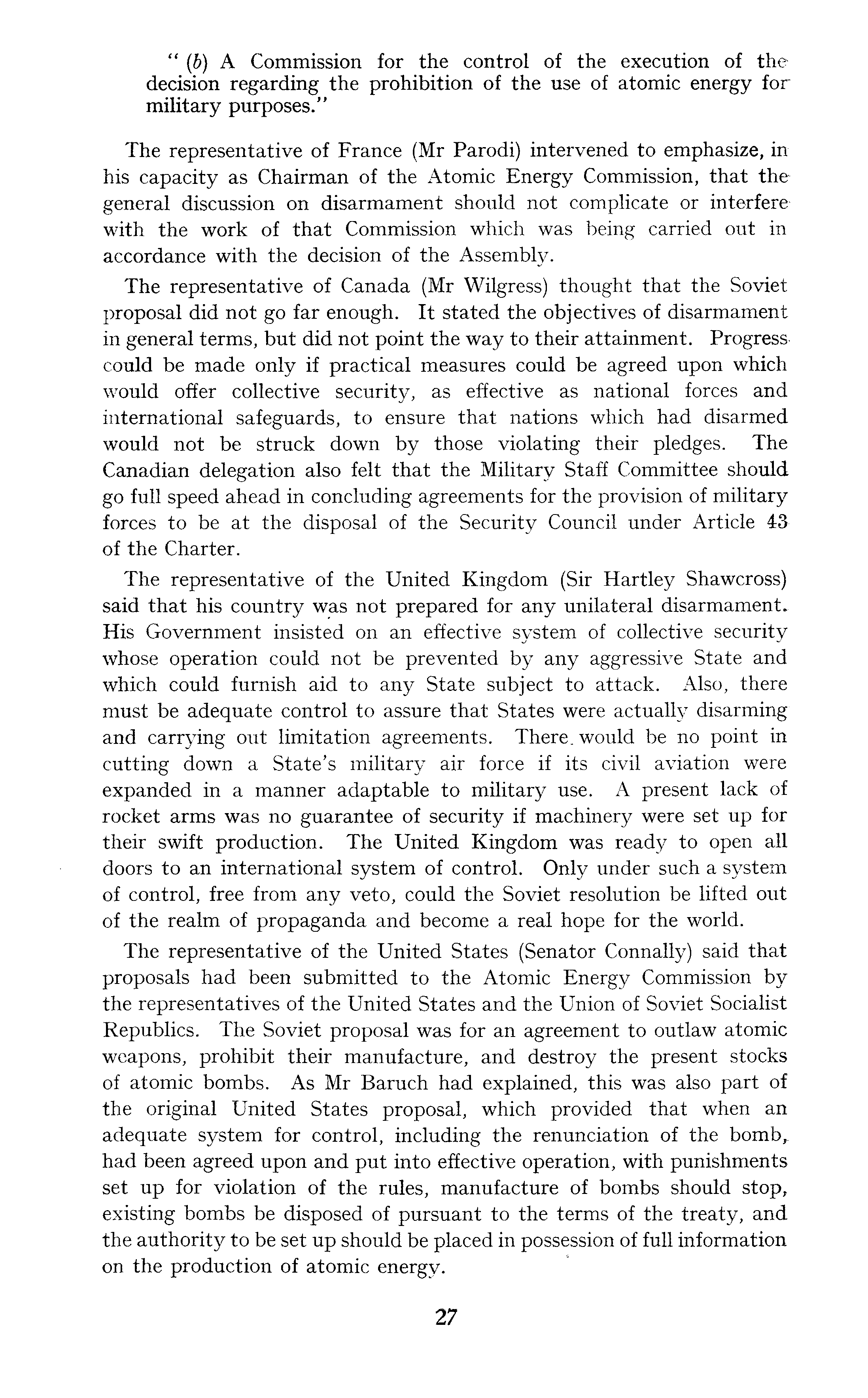 "(b) A Commission for the control of the execution of the decision regarding the prohibition of the use of atomic energy for military purposes." The representative of France (Mr Parodi) intervened to emphasize, in his capacity as Chairman of the Atomic Energy Commission, that the general discussion on disarmament should not complicate or interfere with the work of that Commission which was being carried out in accordance with the decision of the Assembly. The representative of Canada (Mr Wilgress) thought that the Soviet proposal did not go far enough. It stated the objectives of disarmament in general terms, but did not point the way to their attainment. Progress could be made only if practical measures could be agreed upon which would offer collective security, as effective as national forces and international safeguards, to ensure that nations which had disarmed would not be struck down by those violating their pledges. The Canadian delegation also felt that the Military Staff Committee should go full speed ahead in concluding agreements for the provision of military forces to be at the disposal of the Security Council under Article 43 of the Charter. The representative of the United Kingdom (Sir Hartley Shawcross) said that his country was not prepared for any unilateral disarmament» His Government insisted on an effective system of collective security whose operation could not be prevented by any aggressive State and which could furnish aid to any State subject to attack. Also, there must be adequate control to assure that States were actually disarming and carrying out limitation agreements. There, would be no point in cutting down a State's military air force if its civil aviation were expanded in a manner adaptable to military use. A present lack of rocket arms was no guarantee of security if machinery were set up for their swift production. The United Kingdom was ready to open all doors to an international system of control. Only under such a system of control, free from any veto, could the Soviet resolution be lifted out of the realm of propaganda and become a real hope for the world. The representative of the United States (Senator Connally) said that proposals had been submitted to the Atomic Energy Commission by the representatives of the United States and the Union of Soviet Socialist Republics. The Soviet proposal was for an agreement to outlaw atomic weapons, prohibit their manufacture, and destroy the present stocks of atomic bombs. As Mr Baruch had explained, this was also part of the original United States proposal, which provided that when an adequate system for control, including the renunciation of the bomb, had been agreed upon and put into effective operation, with punishments set up for violation of the rules, manufacture of bombs should stop, existing bombs be disposed of pursuant to the terms of the treaty, and the authority to be set up should be placed in possession of full information on the production of atomic energy.