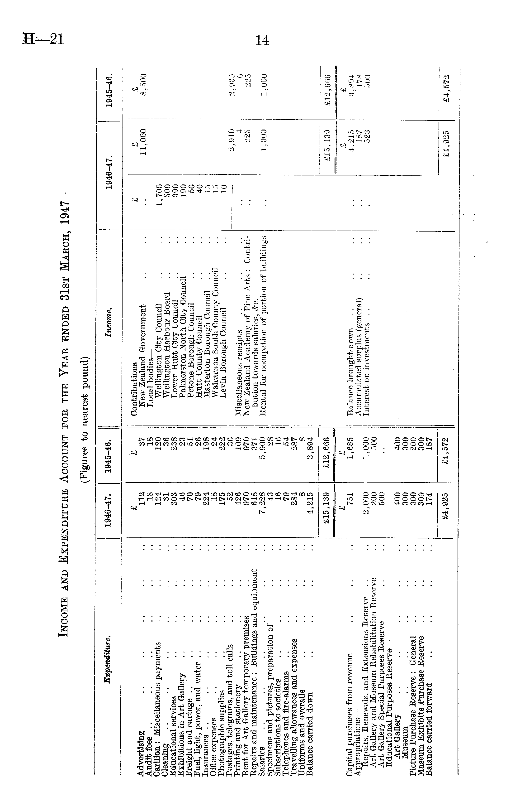 (Figures to nearest pound) Expenditure. 1946-47. 1945-46. Income. 1946-47., 1945-46. Advertising £ £ Contributions — £ £ £ 112 37 New Zealand Government 11,000 8,500 Audit fees 18 18 Local bodies — Carillon: Miscellaneous payments 124 120 Wellington City Council 1,700 Cleaning 31 36 Wellington Harbour Board 500 Educational services 303 238 Lower Hutt City Council 390 Exhibitions in Art Gallery 46 23 Palmerston Forth City Council 190 Freight and cartage 70 51 Petone Borough Council 50 Fuel, light, power, and water 79 26 Hutt County Council 40 Insurances 224 198 Masterton Borough Council 15 Office expenses 18 24 Wairarapa South County Council 15 Photographic supplies 175 222 Levin Borough Council 10 Postages, telegrams, and toll calls 52 36 2,910 2,935 Printing and stationery 426 109 Miscellaneous receipts 4 6 Bent for Art Gallery temporary premises 970 970 New Zealand Academy of Fine Arts : Contri225 225 Repairs and maintenance : Buildings and equipment 618 371 bution towards salaries, &c. Salaries Specimens and pictures, preparation of 7,228 5,900 Rental for occupation of portion of buildings 1,000 1,000 43 28 Subscriptions to societies 16 16 i Telephones and fire-alarms 79 54 . Travelling allowances and expenses 284 287 Uniforms and overalls 8 8 Balance carried down 4,215 3,894 £15,139 £12,666 £15,139 £12,666 Capital purchases from revenue £ 751 £ 1,685 Balance brought- down £ 4,215 £ 3,894 Appropriations — Accumulated surplus (general) 187 178 Repairs, Renewals, and Extensions Reserve 2,000 1,000 Interest on- investments 523 500 Art Gallery and Museum Rehabilitation Reserve 200 500 Art Gallery Special Purposes Reserve 500 Educational Purposes Reserve — Art Gallery 400 400 Museum .. .. .. .. . 300 300 Picture Purchase Reserve : General 300 200 Museum Exhibits Purchase Reserve 300 300 Balance carried forward 174 187 £4,925 £4,572 £4,925 £4,572